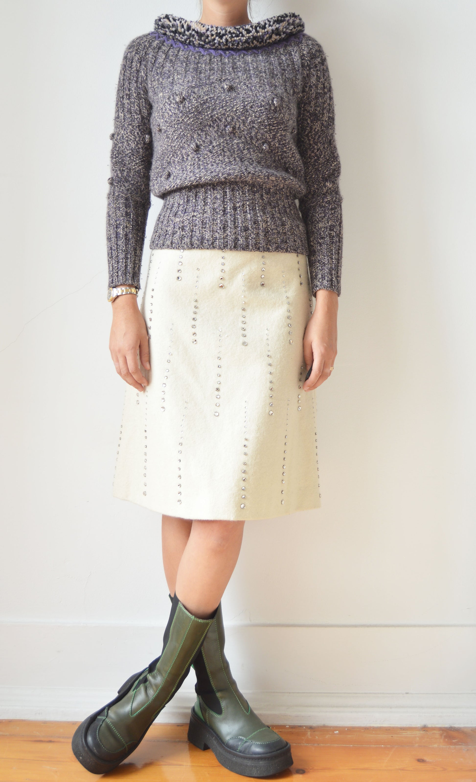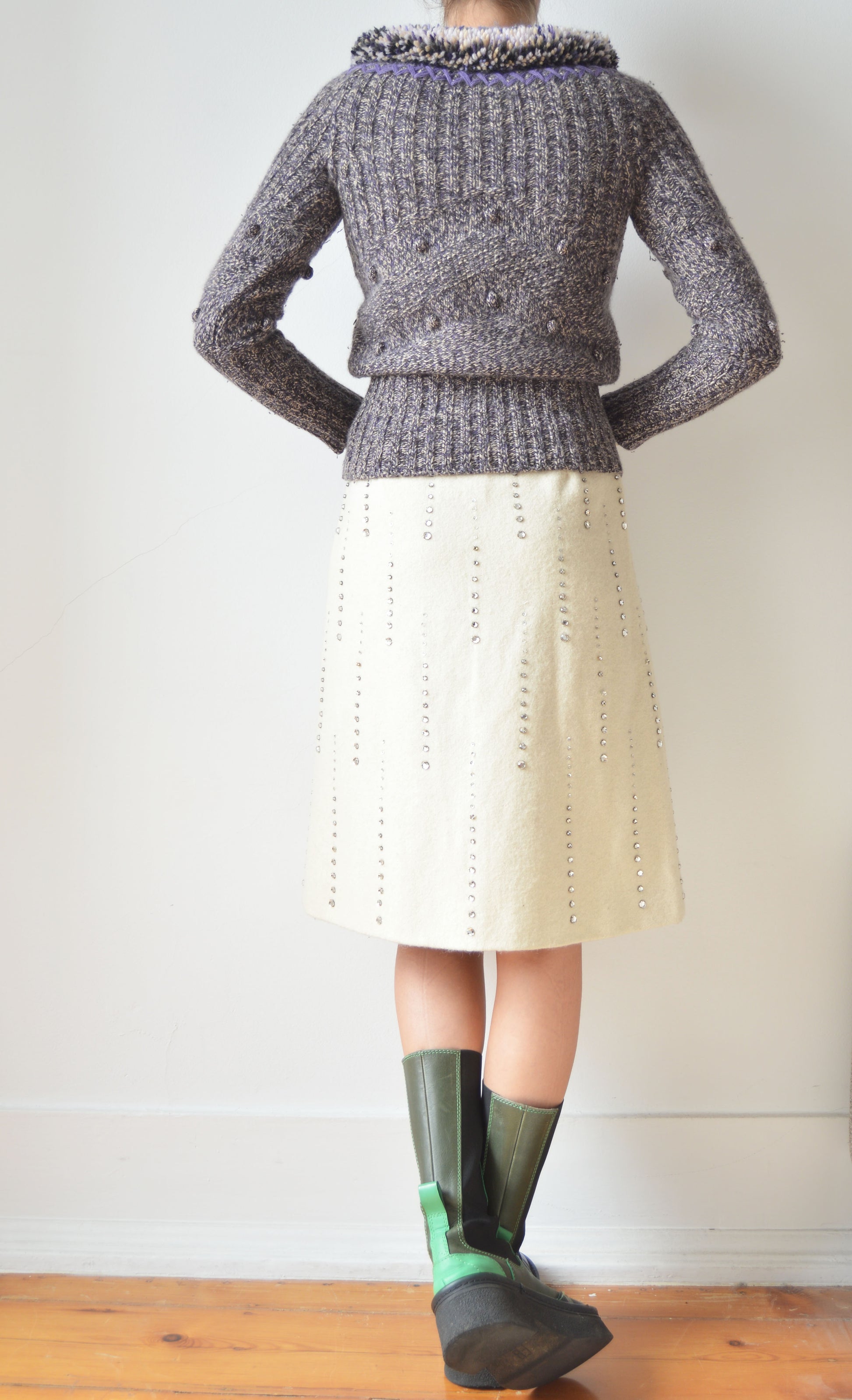 A gorgeous Alexander McQueen F/W 2005 purple knitted jumper with pom pom detailing around the collar. The size on the label is a S and it has been pictured here on a size 40 IT, 5 7" and fits snugly so perhaps best for an XS. You can refer to the measurements below for more detail (there is not much stretch to the fabric). In great condition.