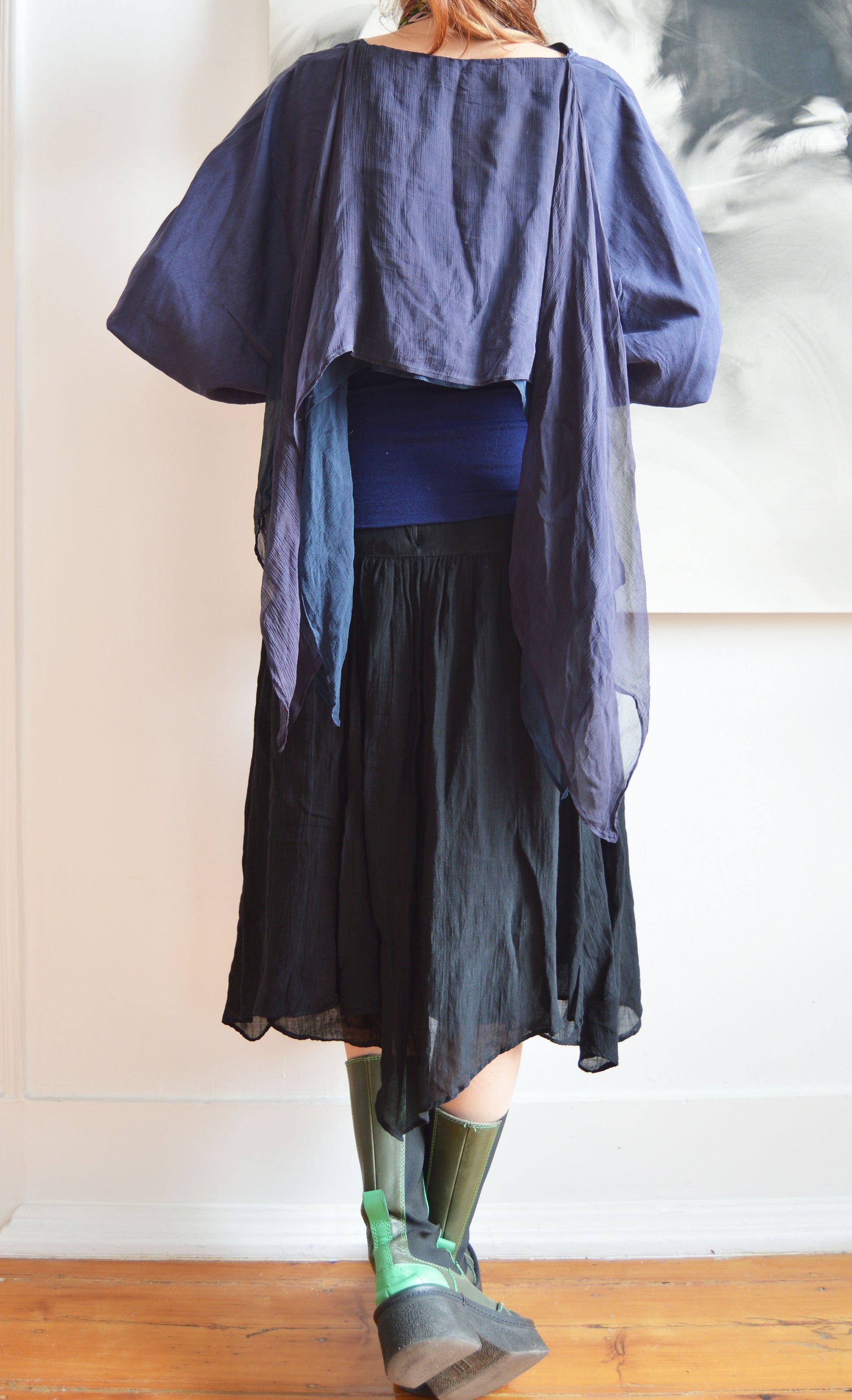 A stunning and unique, vintage Dolce & Gabbana silk blouse. The blouse features tight sleeves and a tight waist in jersey cotton (I assume, but there is no fabric label). This gives the piece excellent shape. Two pieces of flowing silk trail from the back, in great condition apart from a couple of marks. The blouse has been pictured here on a size 40 IT, 5 7" and fits well. Please be aware that the measurements are an estimate, due to the nature of the blouse.