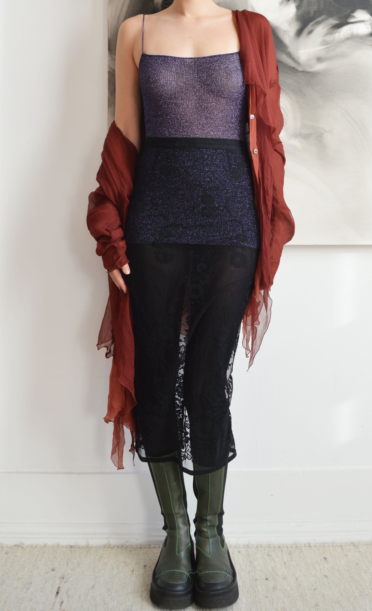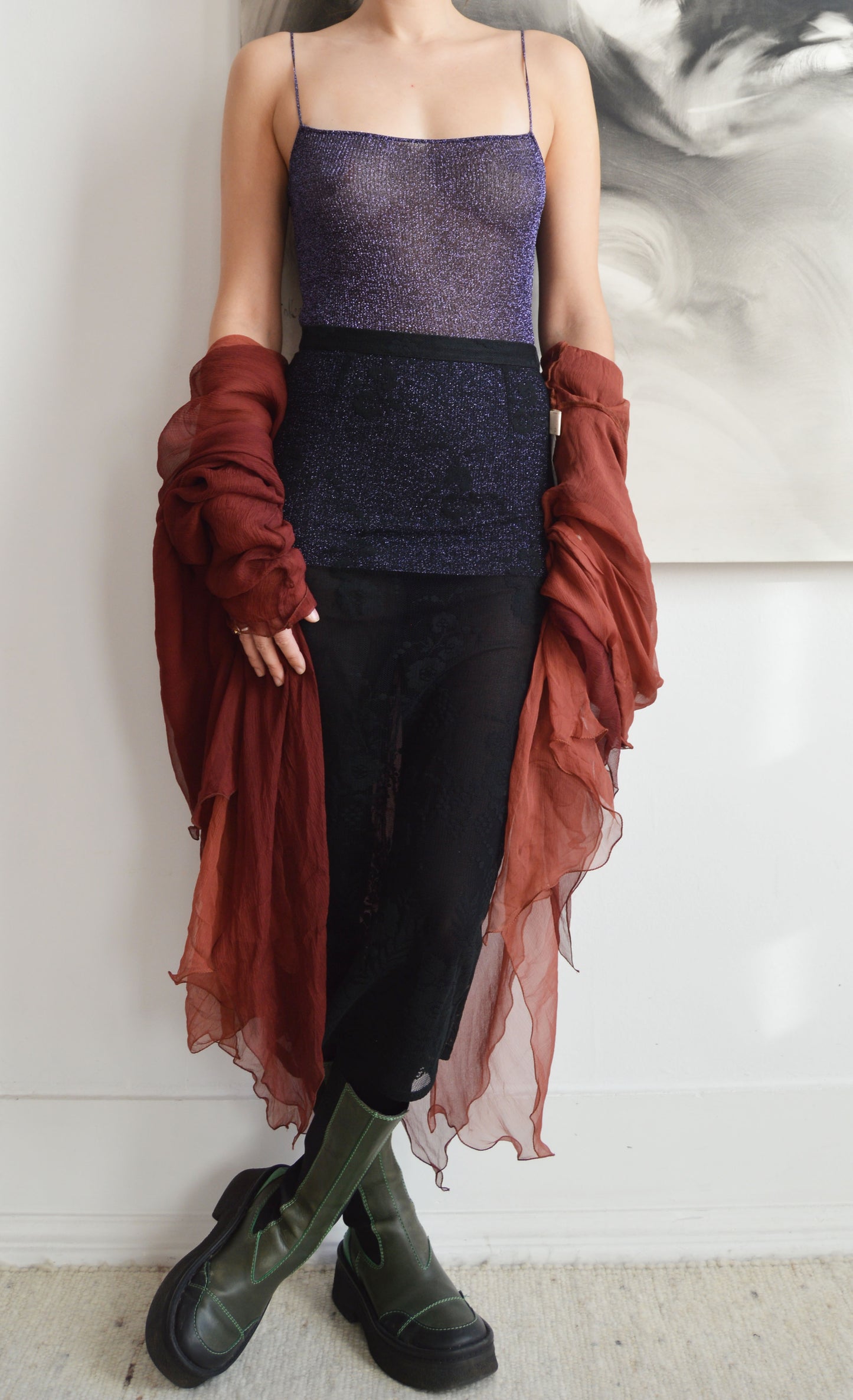 A gorgeous Dolce & Gabbana F/W 2000 purple sparkly camisole with spaghetti straps. The size on the label is a 44 IT and it has been pictured here on a size 40 IT, 5 7" and fits well. The camisole is very stretchy and there are no flaws to the item apart from the fabric label being cut.