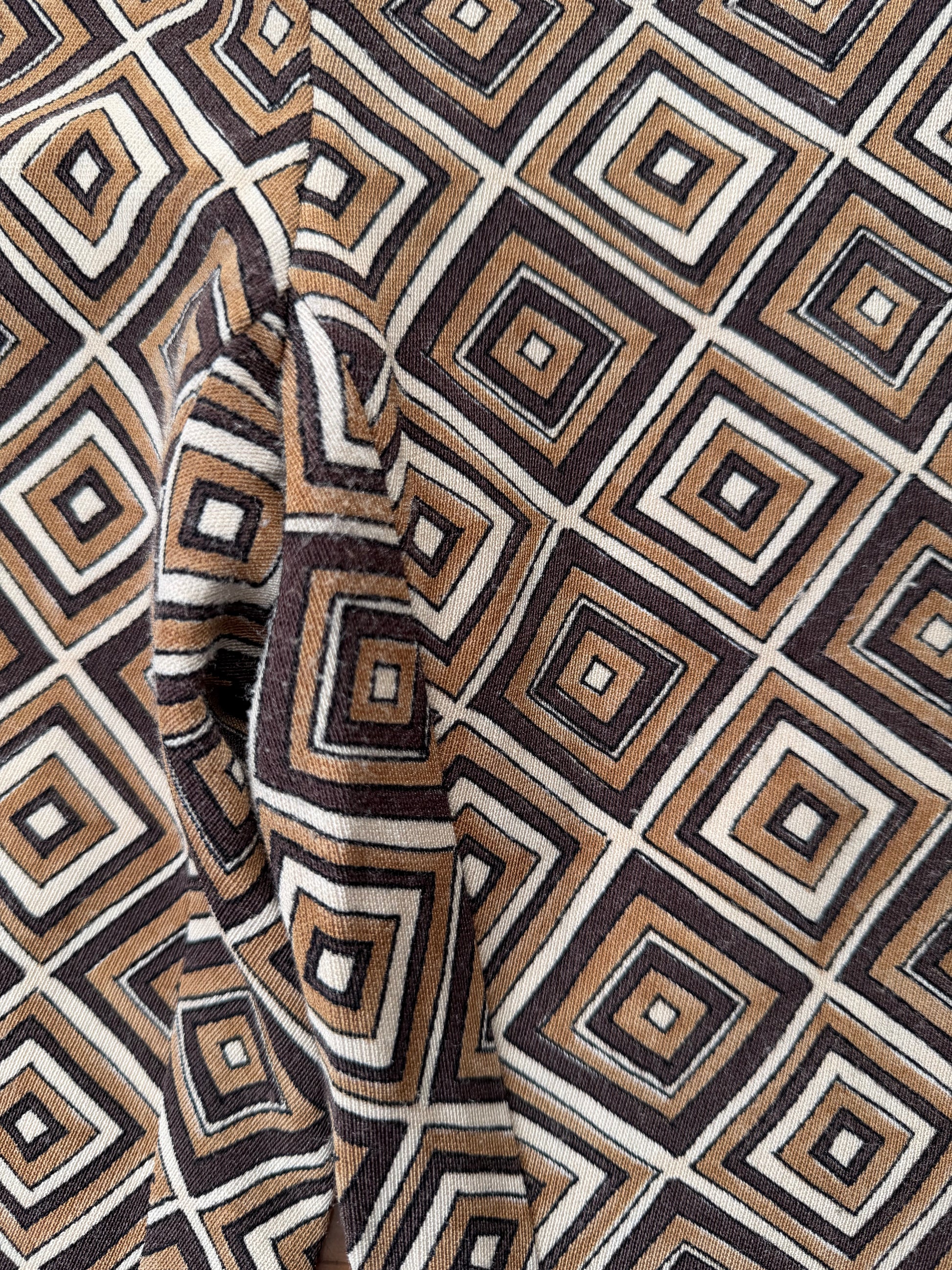 A statement pair of Prada F/W 1996 trousers in a brown diamond pattern. The size on the label is a 42 IT and they have been pictured here on a size 40 IT, 5 7" and are a little large so please refer to the measurements below for more information. In good condition overall with a small bit of wear at the crotch area and a couple of snags on the back of one leg, both of these are not noticeable when the trousers are worn.