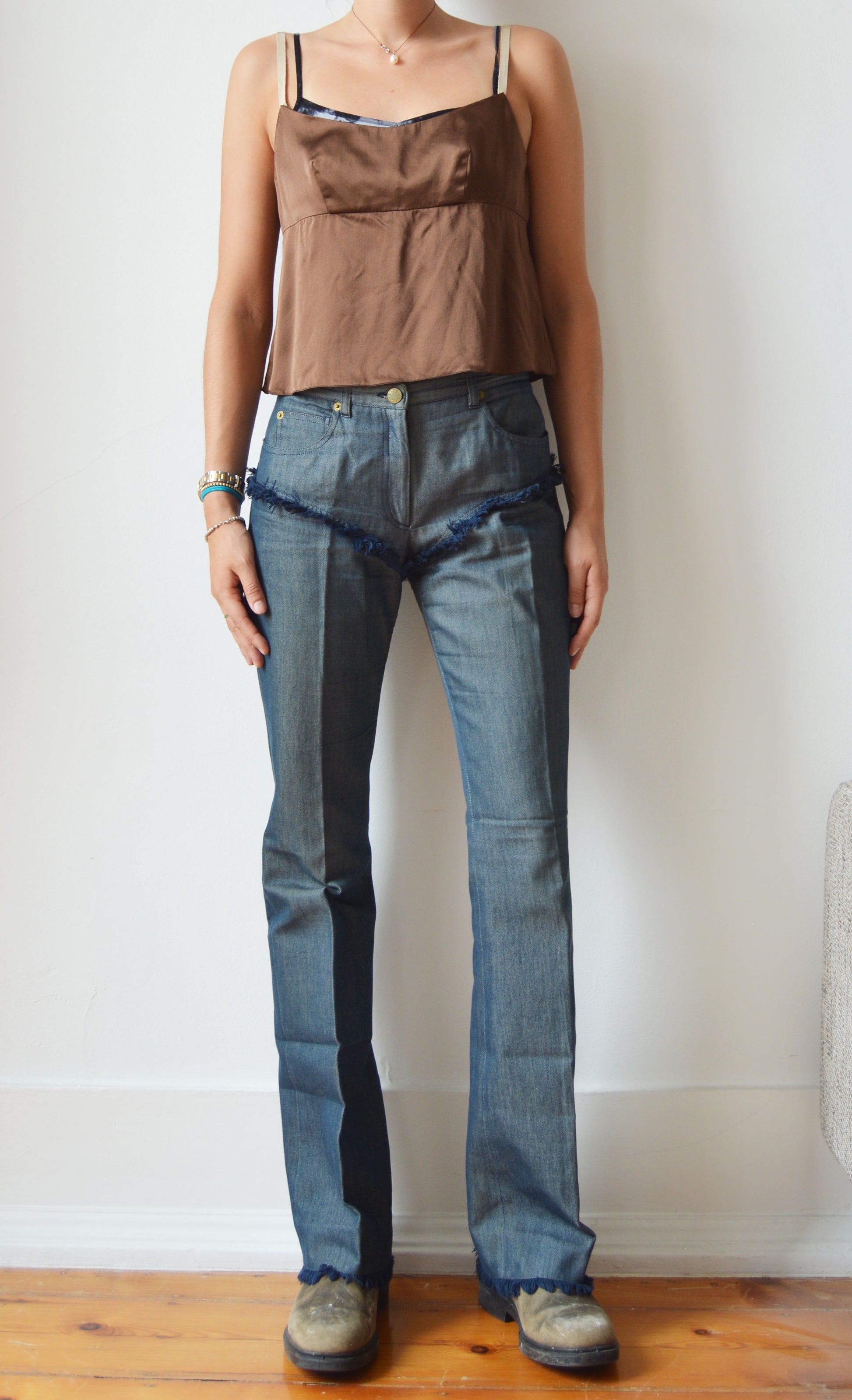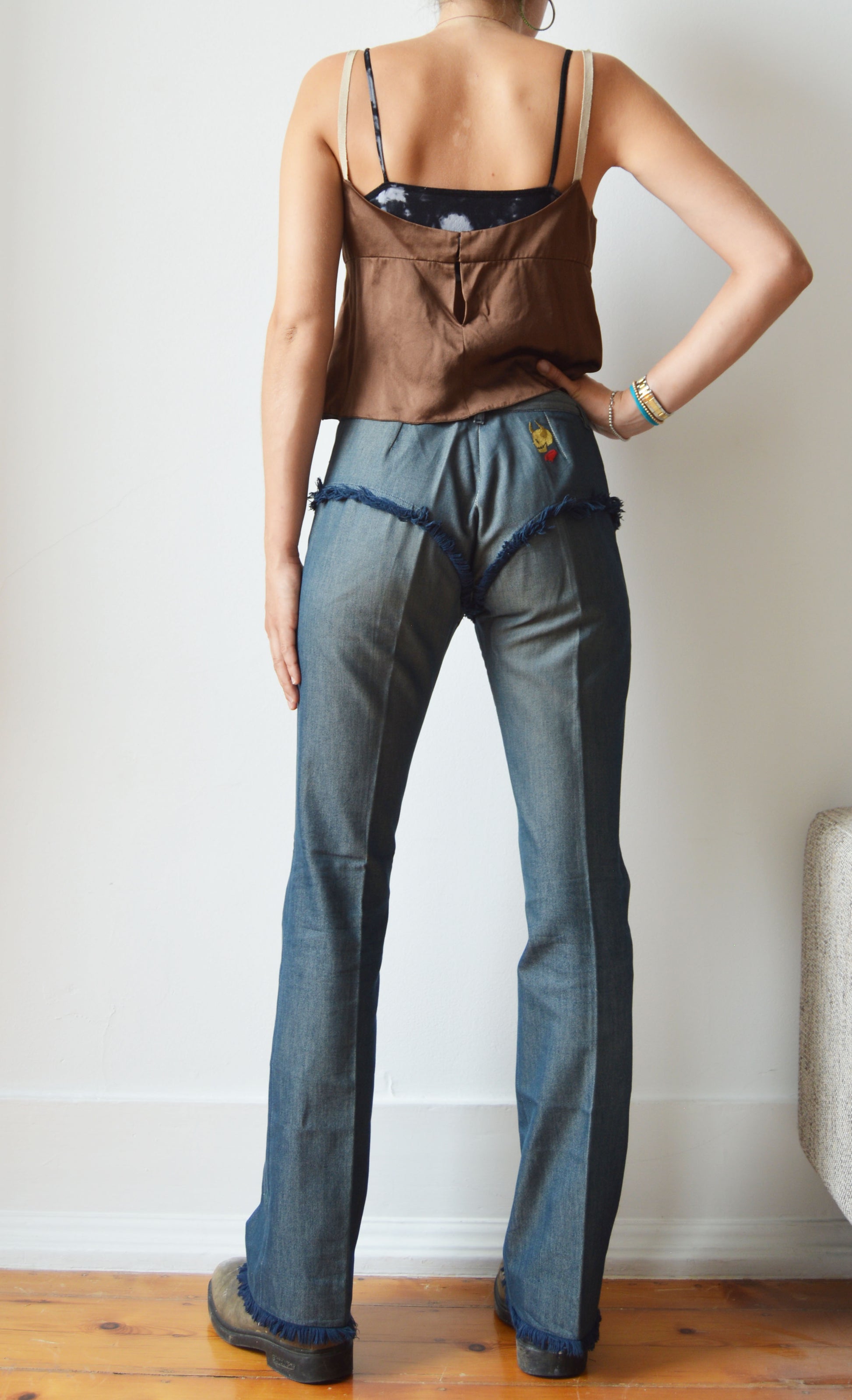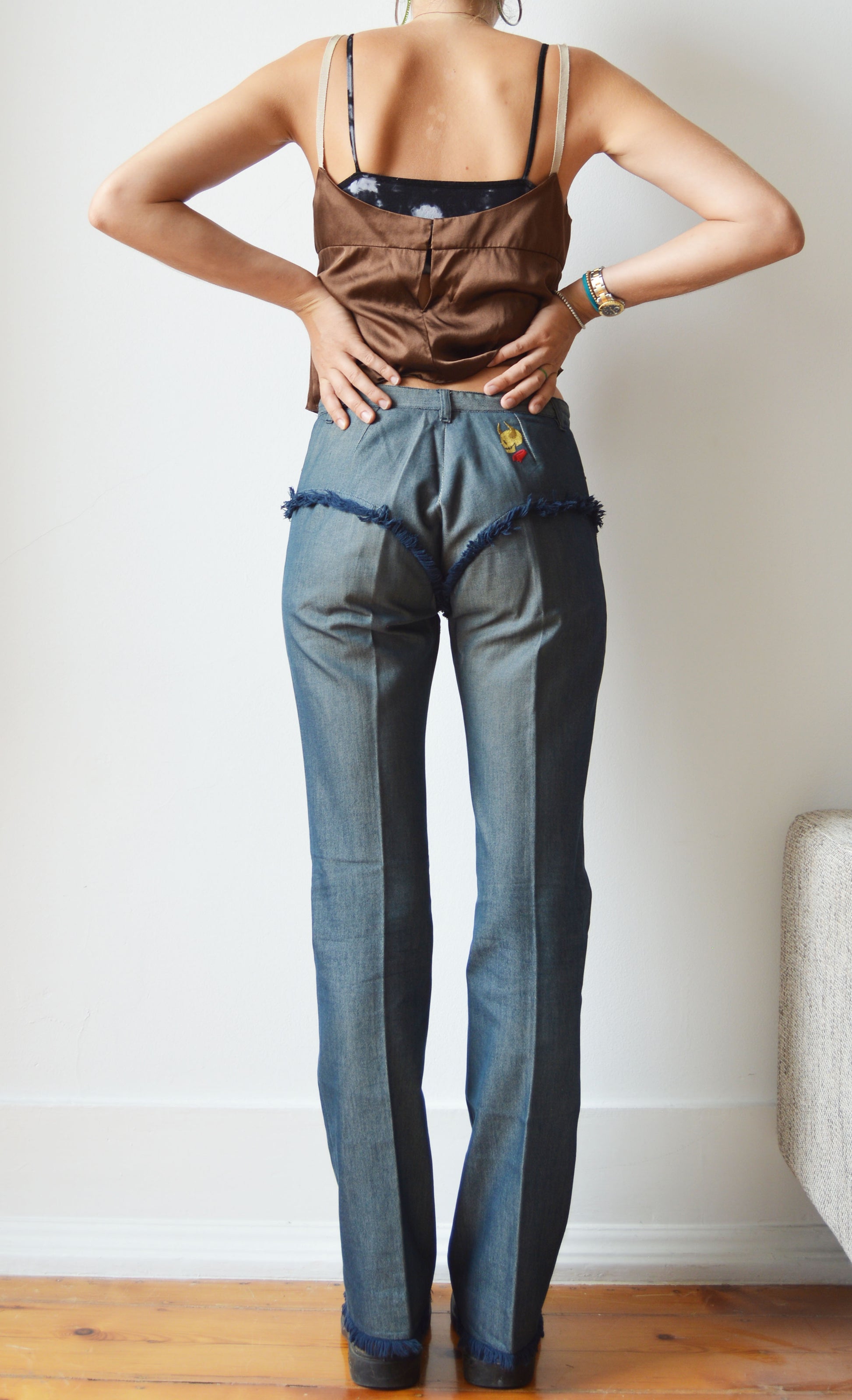 A gorgeous pair of Chloé S/S 2000 jeans featuring fray detailing as well as the iconic devil skull on the back. The jeans are in good overall condition, with a small mark inside and general fading at the waistband and the Chloé label being a little aged. There is no size label, so please refer to the measurements below for more information. They have been pictured here on a size 36 FR (8 UK), 5 7".