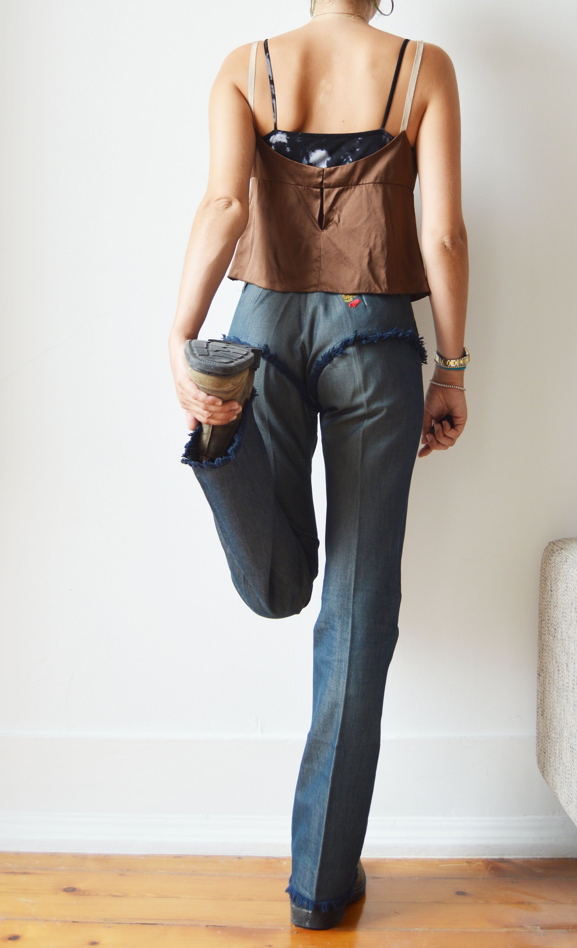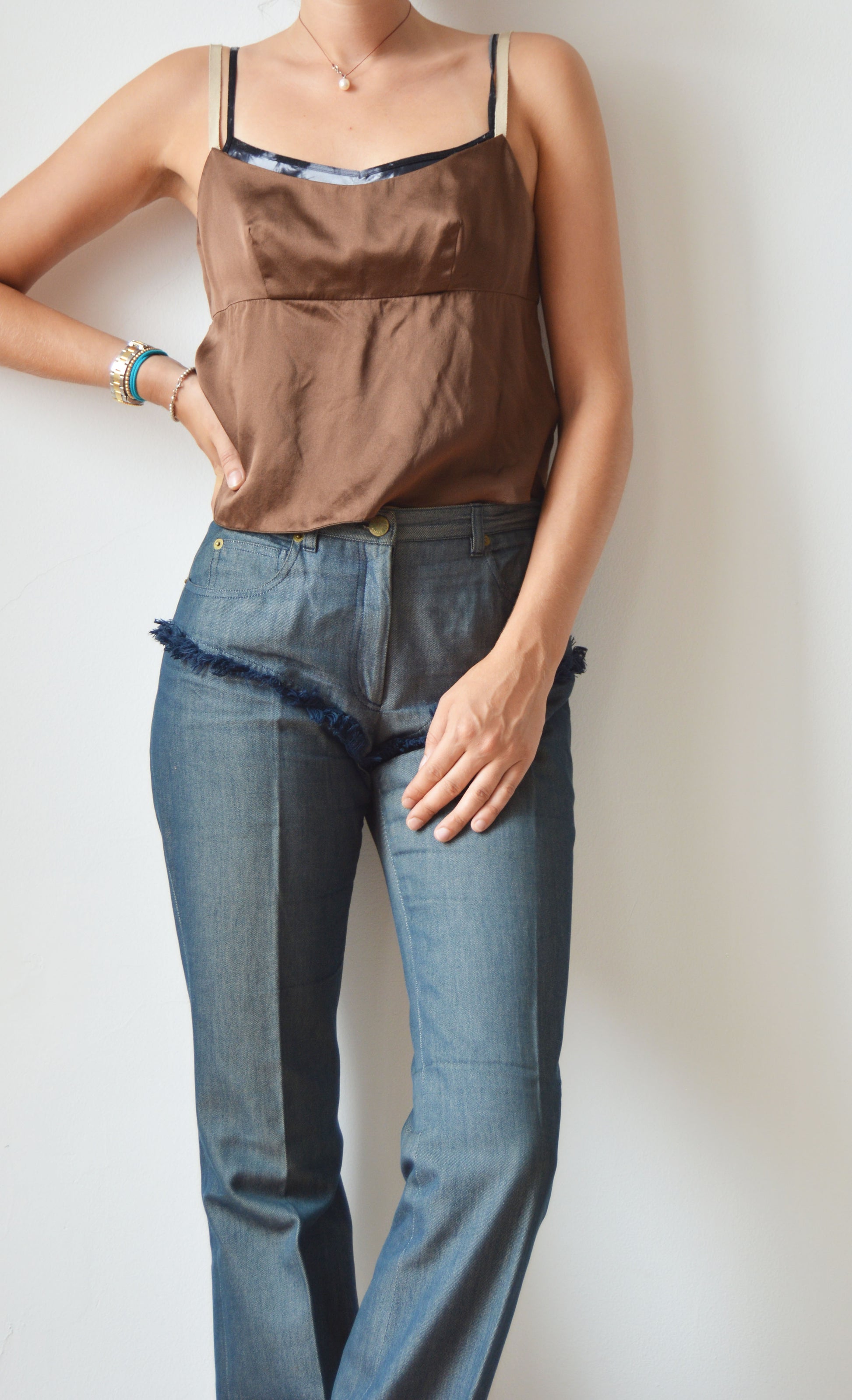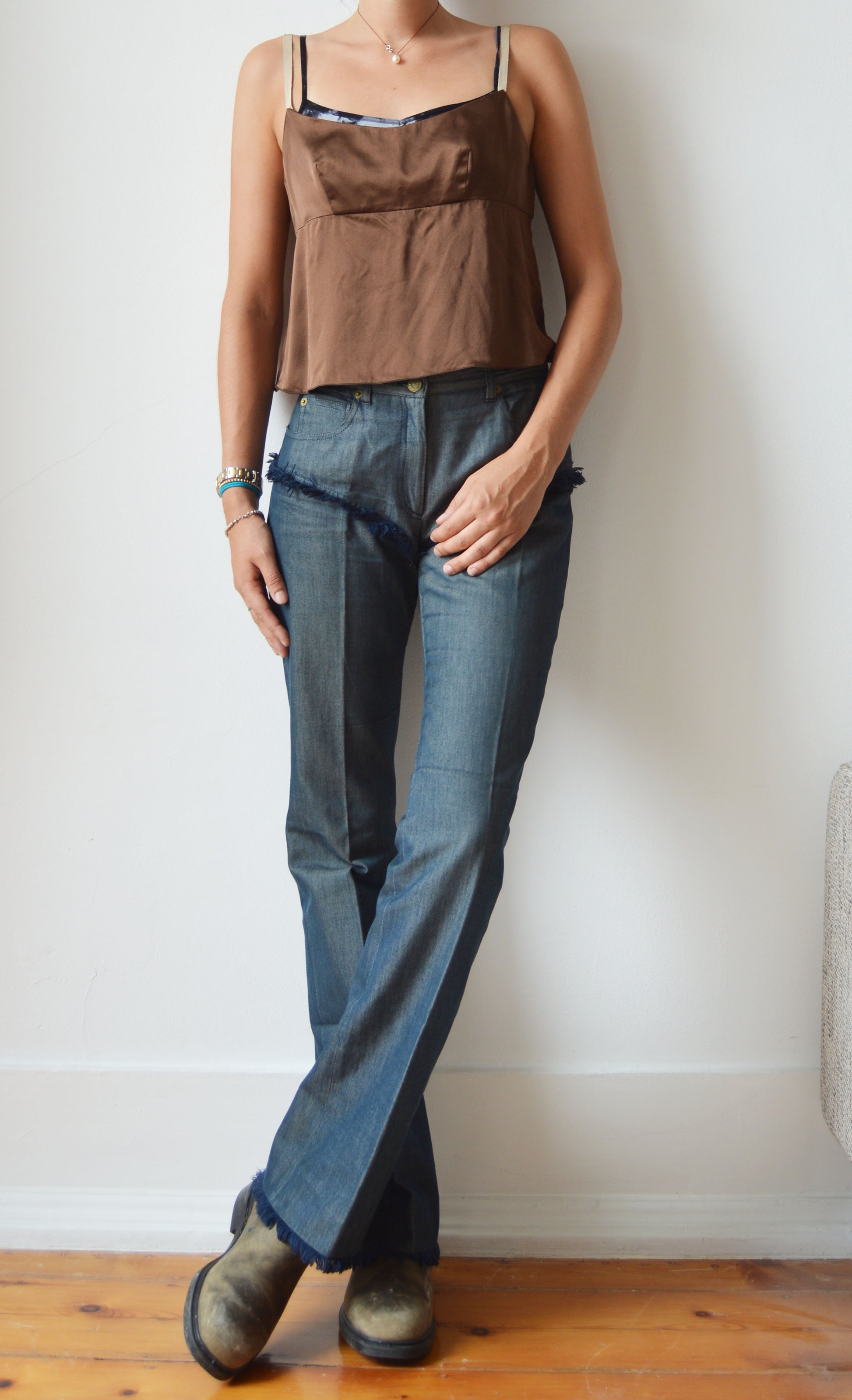 A gorgeous pair of Chloé S/S 2000 jeans featuring fray detailing as well as the iconic devil skull on the back. The jeans are in good overall condition, with a small mark inside and general fading at the waistband and the Chloé label being a little aged. There is no size label, so please refer to the measurements below for more information. They have been pictured here on a size 36 FR (8 UK), 5 7".