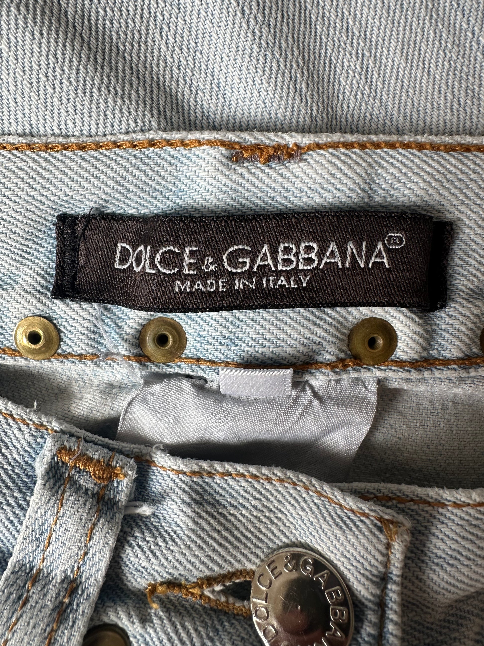 A wonderful pair of Dolce & Gabbana jeans adorned with embroidery. The size on the label is a 36 IT and it has been pictured here on a size 40 IT, 5 7". Please refer to the measurements below for more accuracy. The jeans were designed to be distressed in places and some of these rips are larger than originally. There is also some general fading to the denim, but they are still very wearable and very funky.