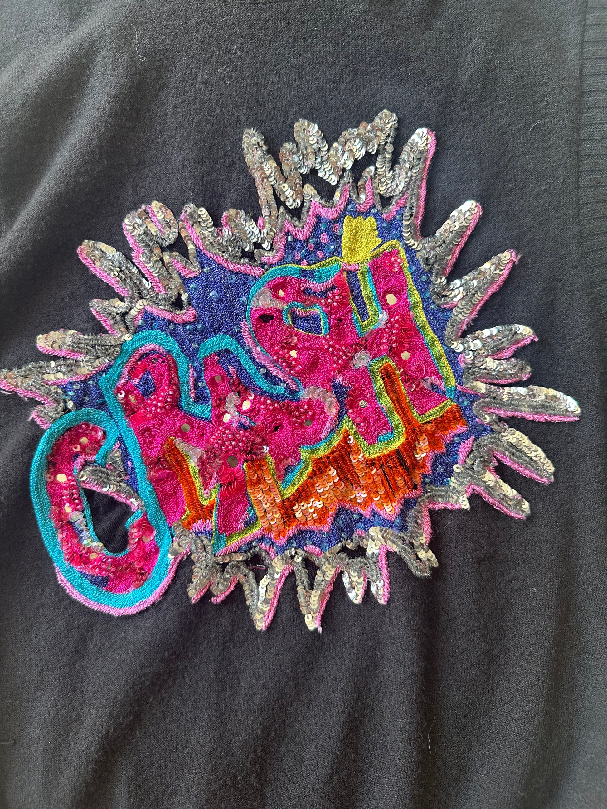 A lovely Iceberg sleeveless turtleneck embellished with the word 'crash' on the front. The size on the label is a 42IT but it would best fit a size 40 IT. It has been pictured here on a size 40 IT, 5 7". In great condition.