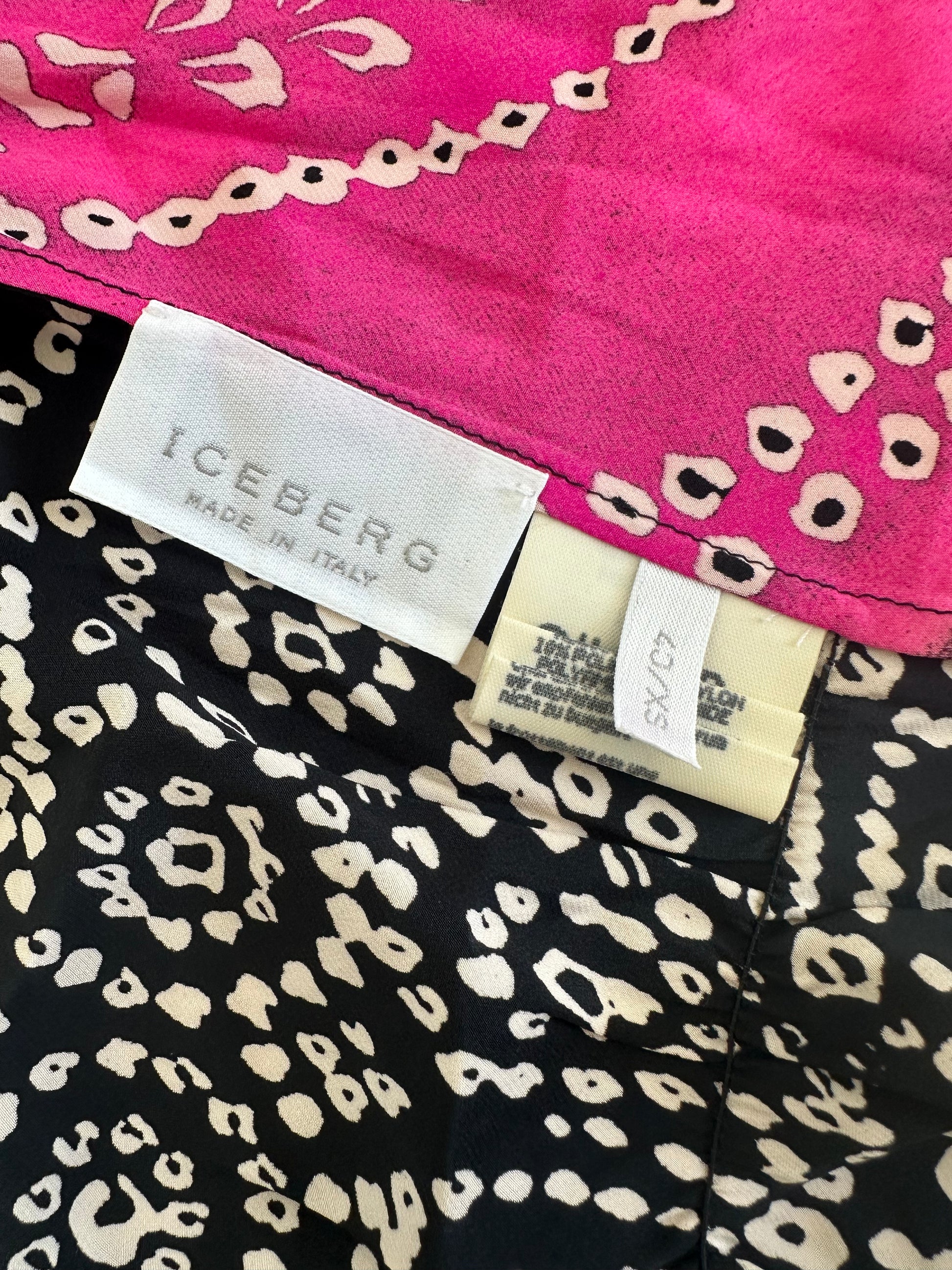 A gorgeous Iceberg pink and black patterned top with a lace trim. The size on the label is a 40 IT and it has been pictured here on a size 40 IT, 5 7". In great condition apart from the loop fastening for the last button is about to come apart (please refer to the last image).