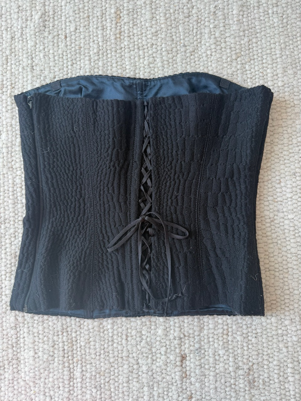 A gorgeous La Perla wool blend corset in a textured fabric. There is no size label and it has been pictured here on a size 40 IT, 5 7". So please refer to the measurements below for more information. In great condition with no flaws.