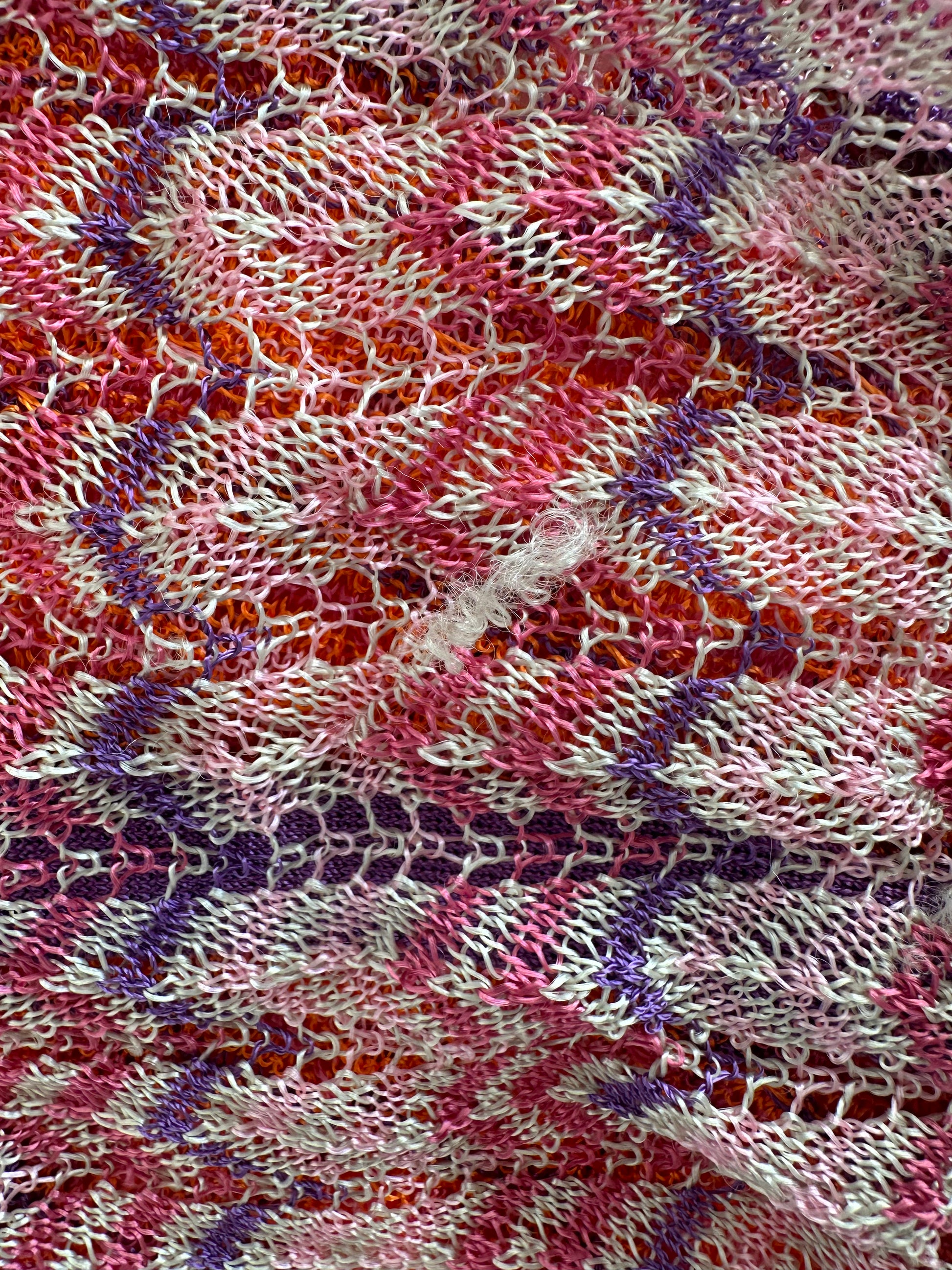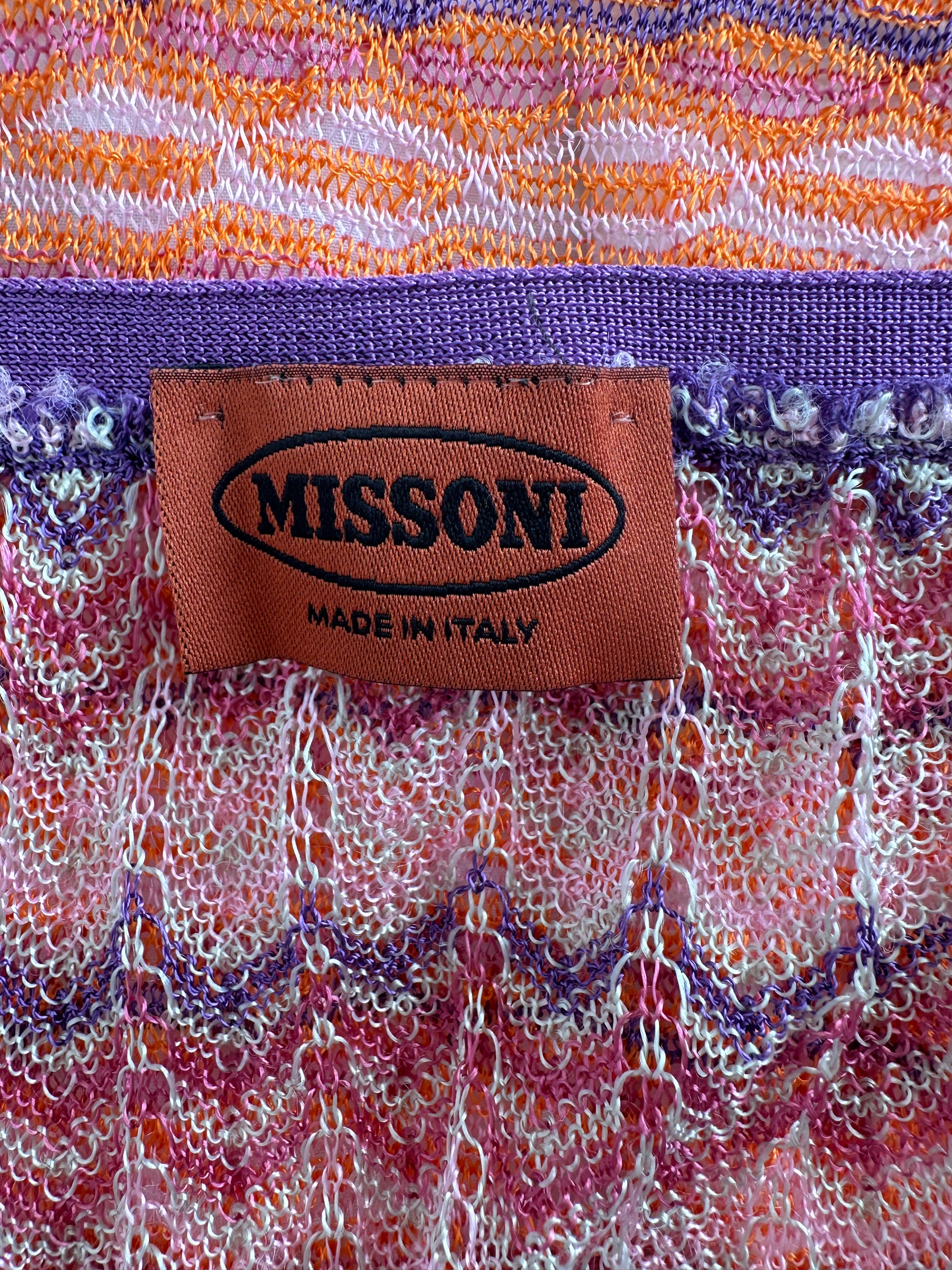 A gorgeous Missoni knitted sarong in lovely oranges and blues. The item has no size label and has been pictured here on a size 40 IT, 5 7". It is in great condition apart from one pull, which has been pictured. There is also no fabric label.
