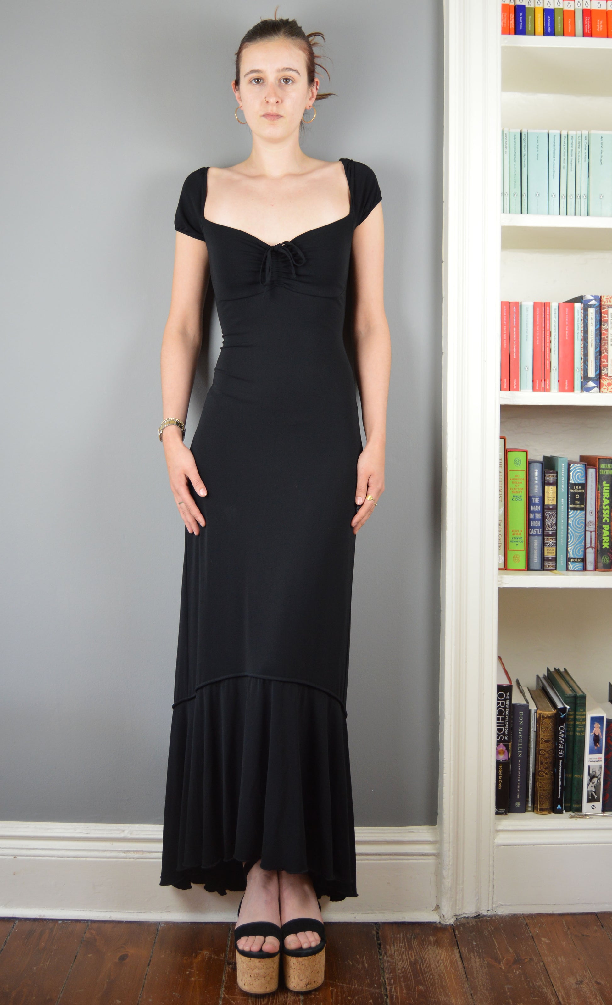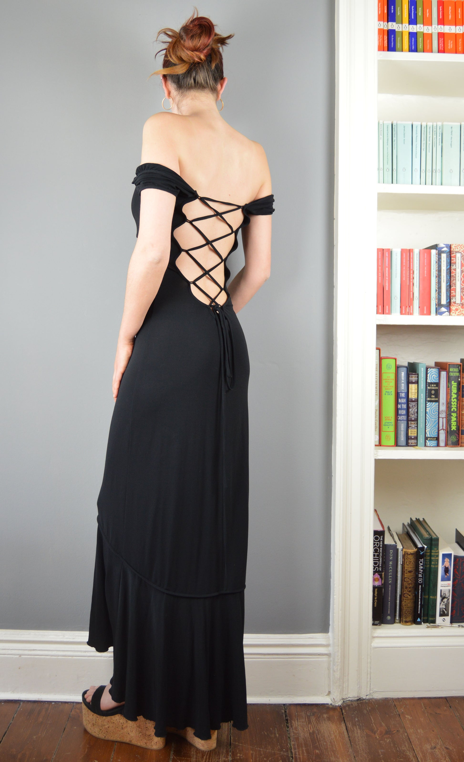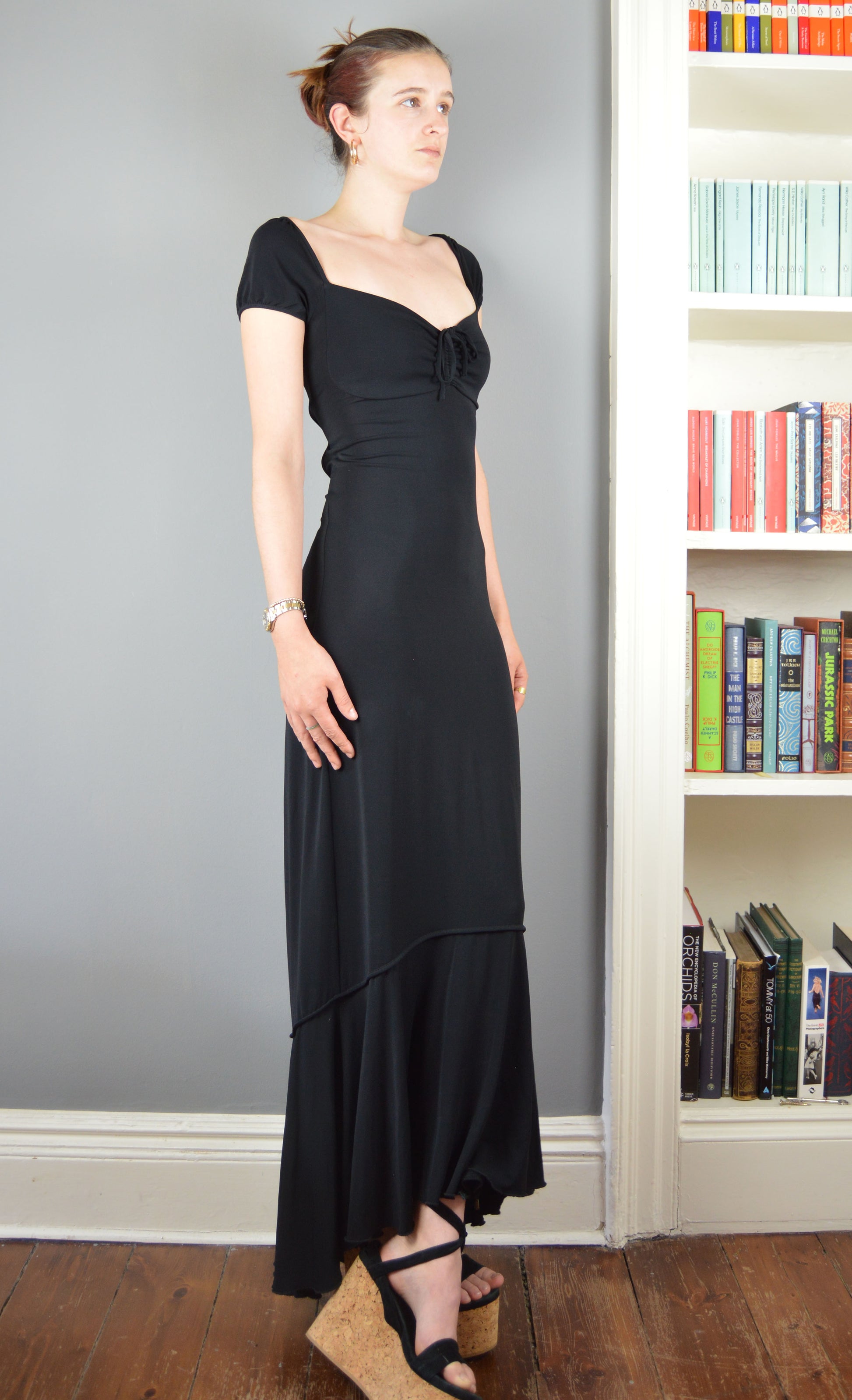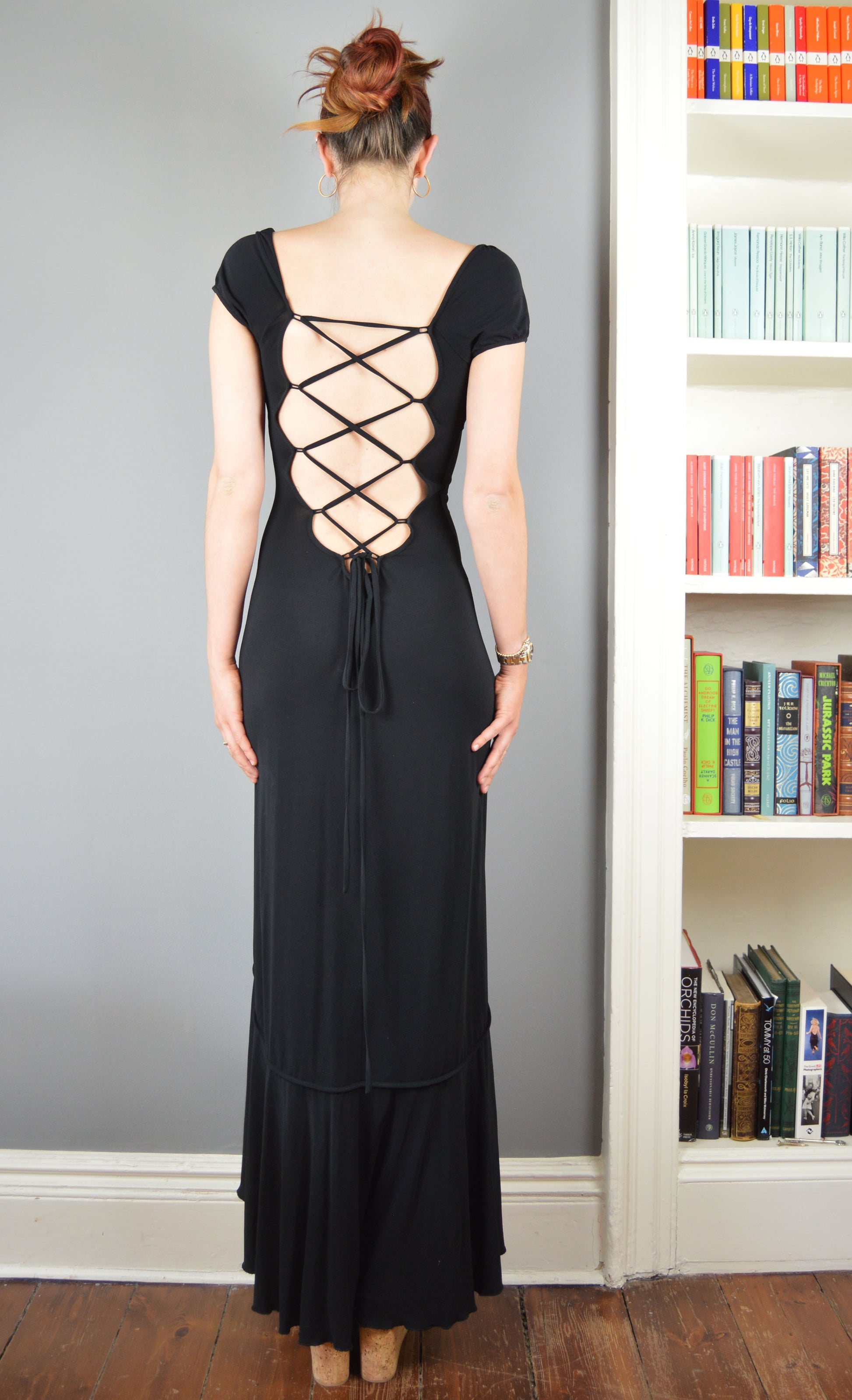 An absolutely stunning maxi dress, fastened up the back with criss-cross ties. The size on the label is a 44 IT (12 UK), but I would say that it comes up smaller. It has been pictured here on a size 6/8 UK, 5 7" and I think would best fit an 8-10 UK. Please refer to the measurements below for more information.