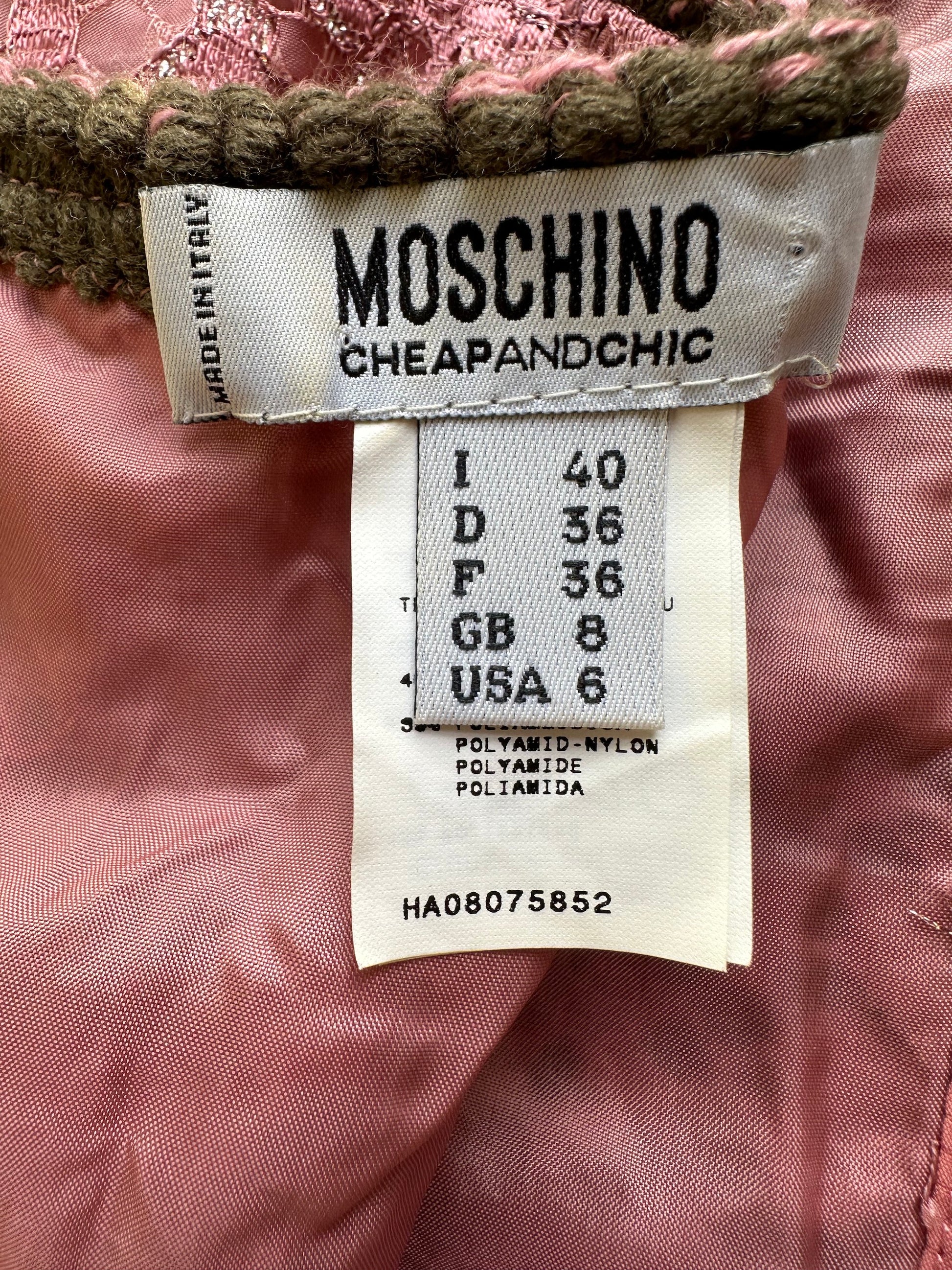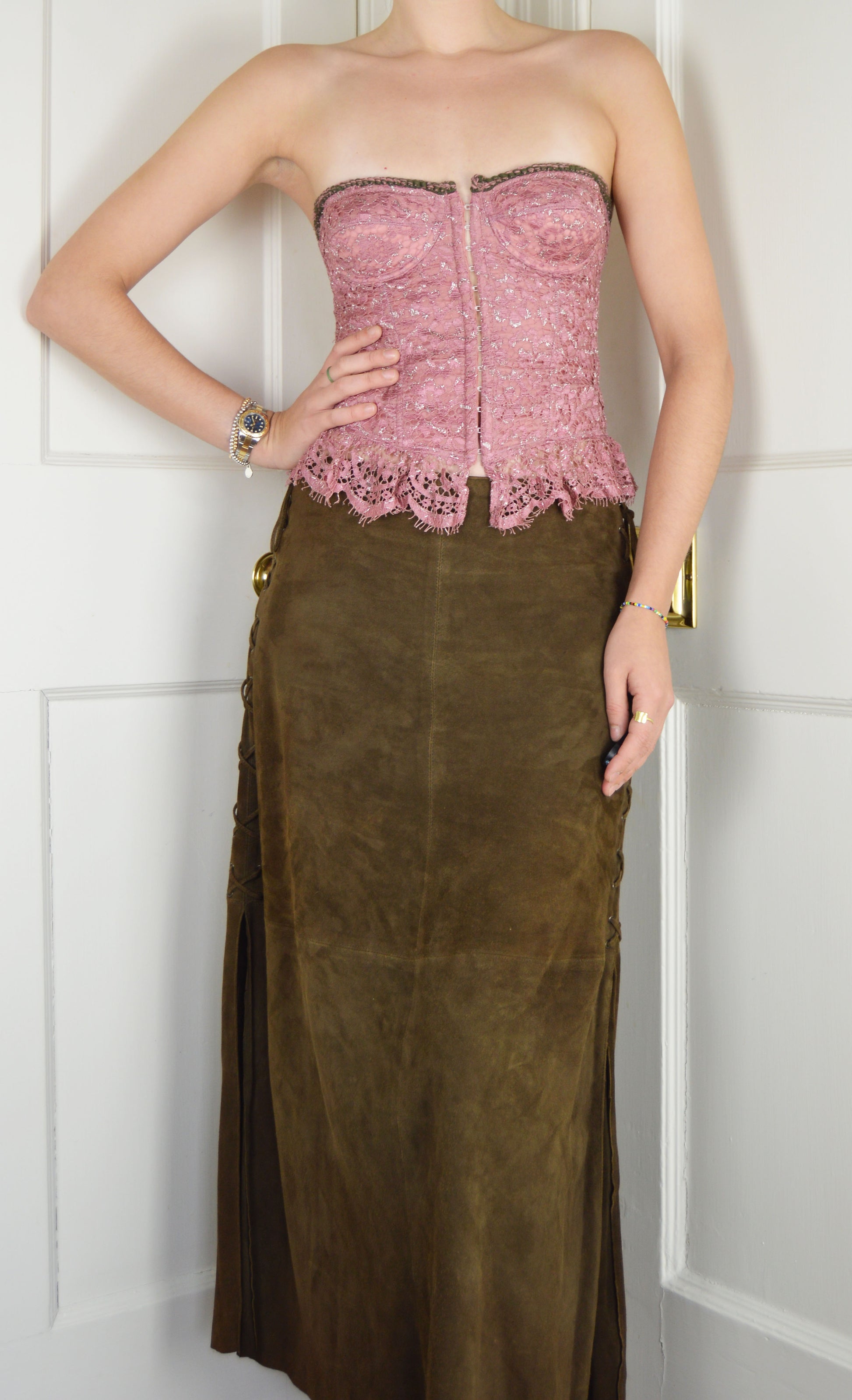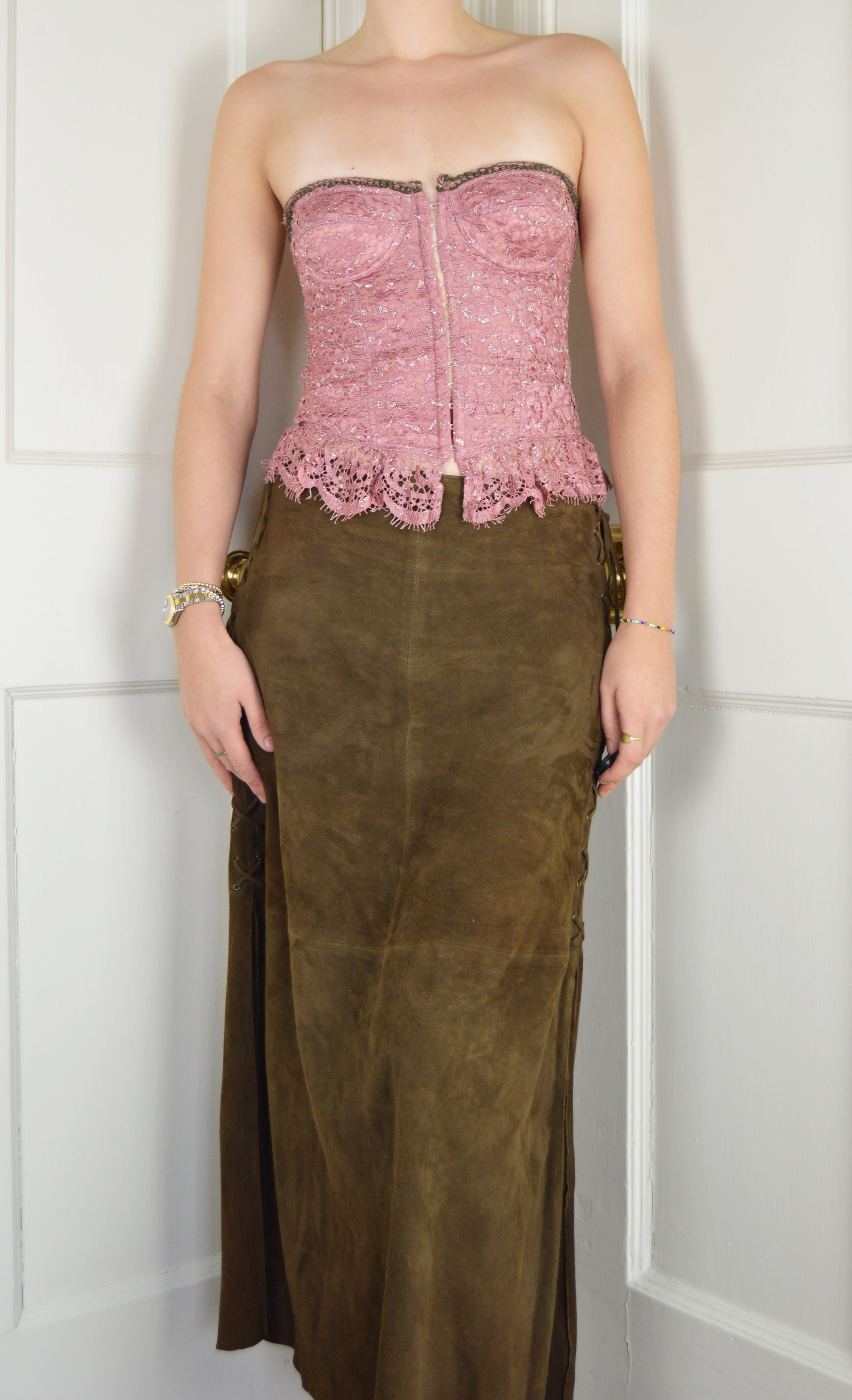 A gorgeous, Moschino corset in a lovely pink lace. The item seems to have featured straps, which are no longer there but it does not take away from the beauty of the piece. The size on the label is an 8 UK, but it comes up smaller so the best fit is for a size 6 UK, seen here on a size 6/8 UK, 5 7". Please refer to the measurements below for more detail. The item has no stretch to it.
