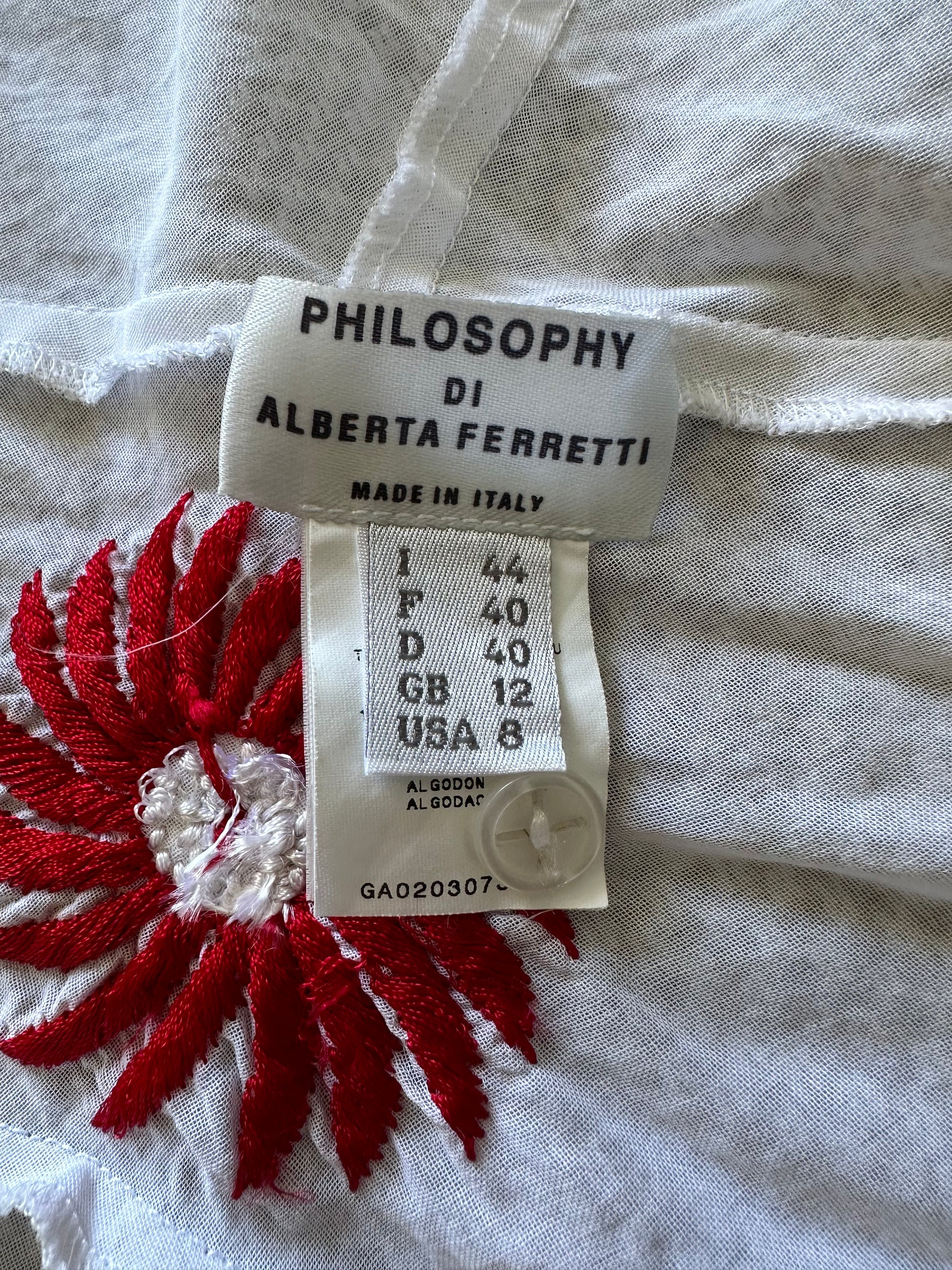 An absolutely gorgeous Philosophy di Alberta Ferretti top with embroidered red flowers. The size on the label is a 44 IT (12 UK), which is inaccurate as it would best fit a size 38/40 IT. It has been pictured here on a size 40 IT, 5 7" and fits well. There is absolutely no stretch to the item and the piece is very delicate so please refer to the measurements below for more information.