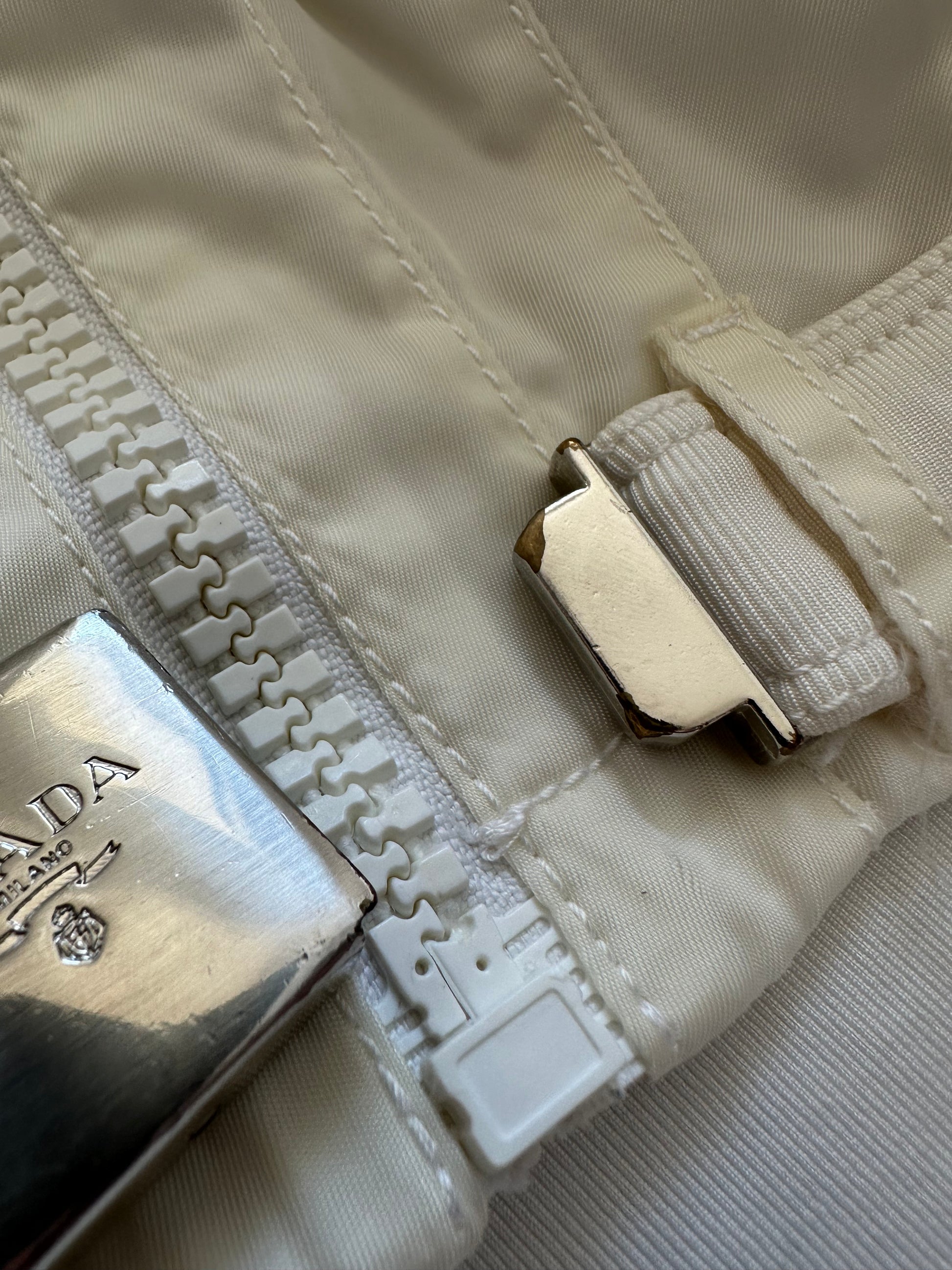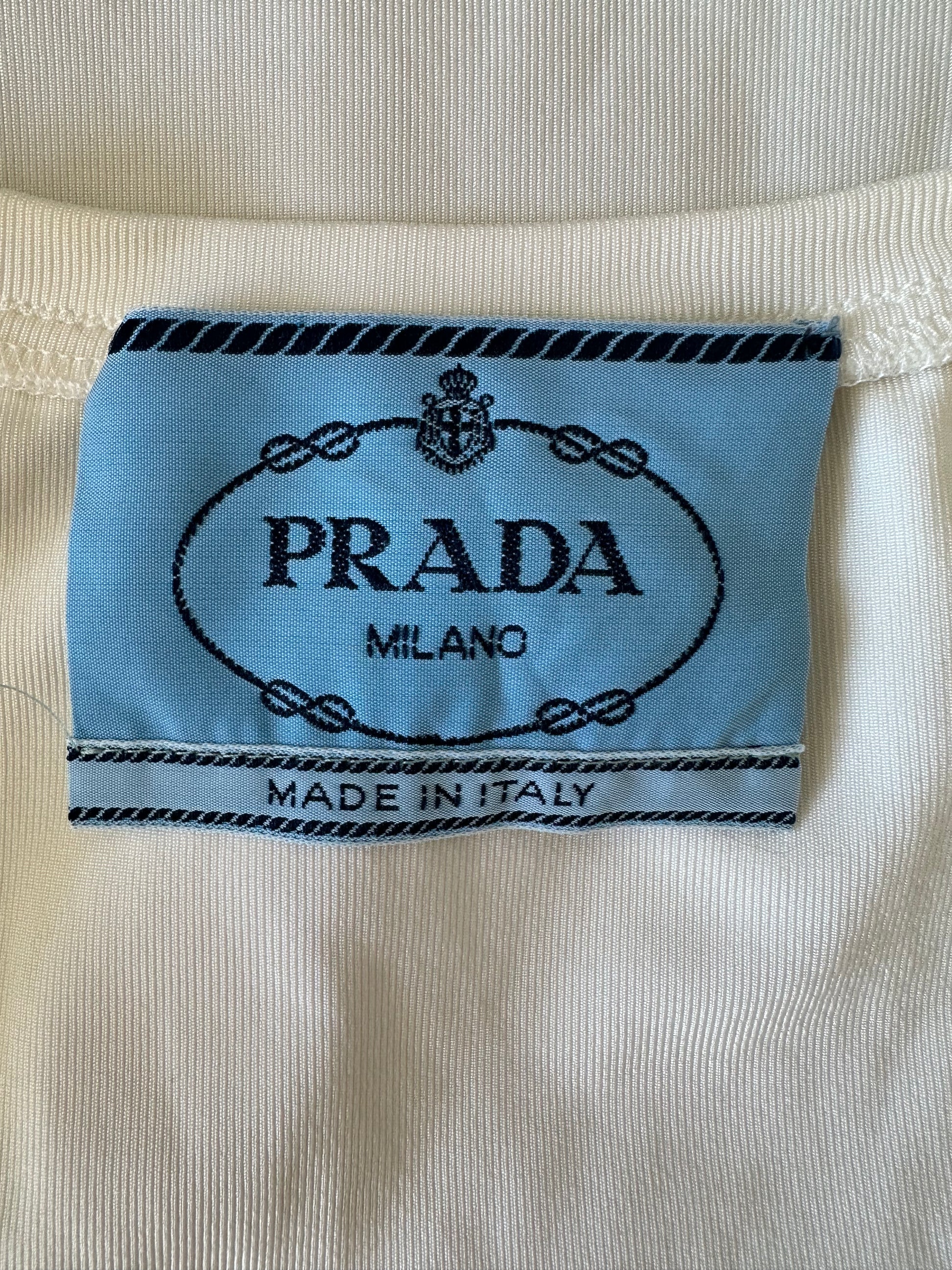 A fabulous Prada F/W 1994 top featuring at the buckle at the waist. The size on the label is a M, but it is definitely smaller and would best fit an XS/S but please refer to the measurements below for more information. It has been pictured here on a size 38/40 IT, 5 7". In great condition for its age with a little wear to the zip and very slight wear to the buckle.