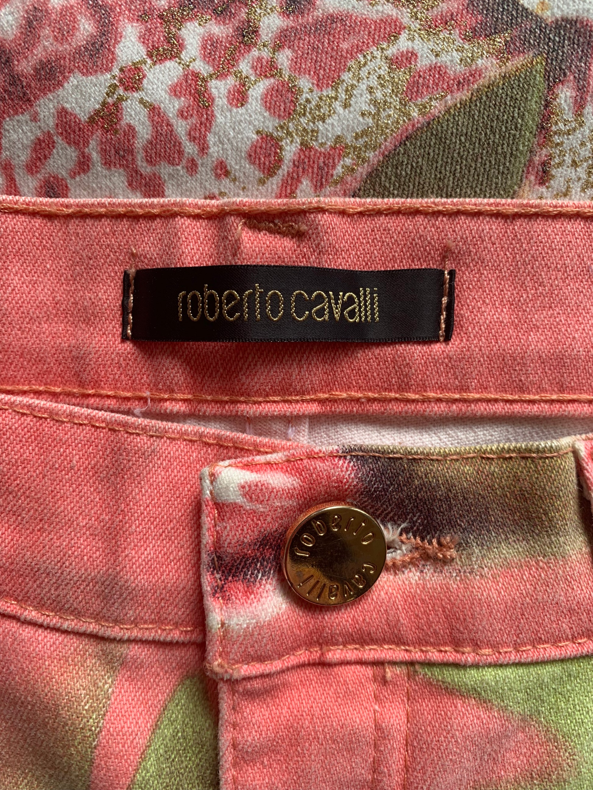 Immaculate Roberto Cavalli jeans in the most beautiful Orchid flower print. The size on the label is an XS so please refer to the measurements below for more information. They have been pictured here on size 8 UK, 5 7". Please be aware that the jeans are low waisted and that they have been previously hemmed.
