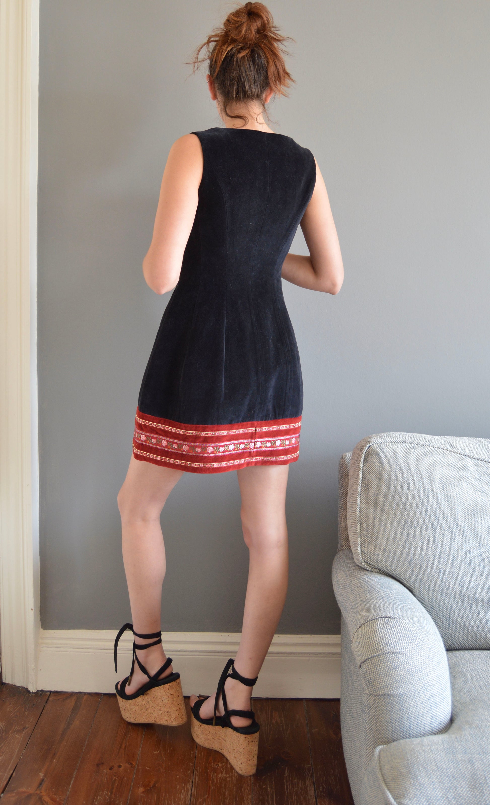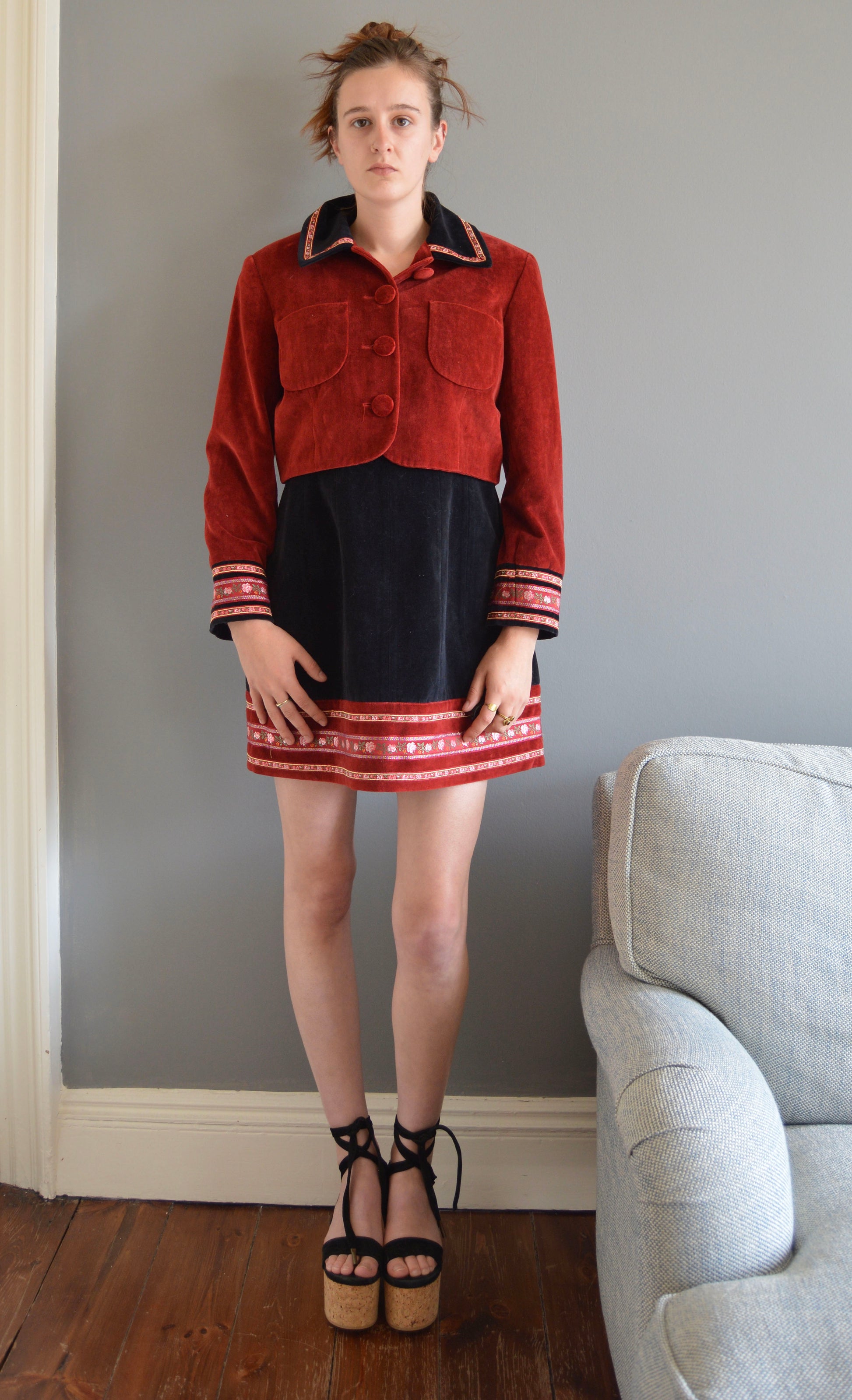 A lovely velvet duo by Kenzo. The size on label states it is a 40 FR, but I would say it comes up smaller so please refer to the measurements below for more accurate sizing. It has been pictured here on a size 8 UK, 5 7". The middle button of the jacket is attached but loosely and there is a slight loose thread on the hem detail of the dress, which has been pictured.