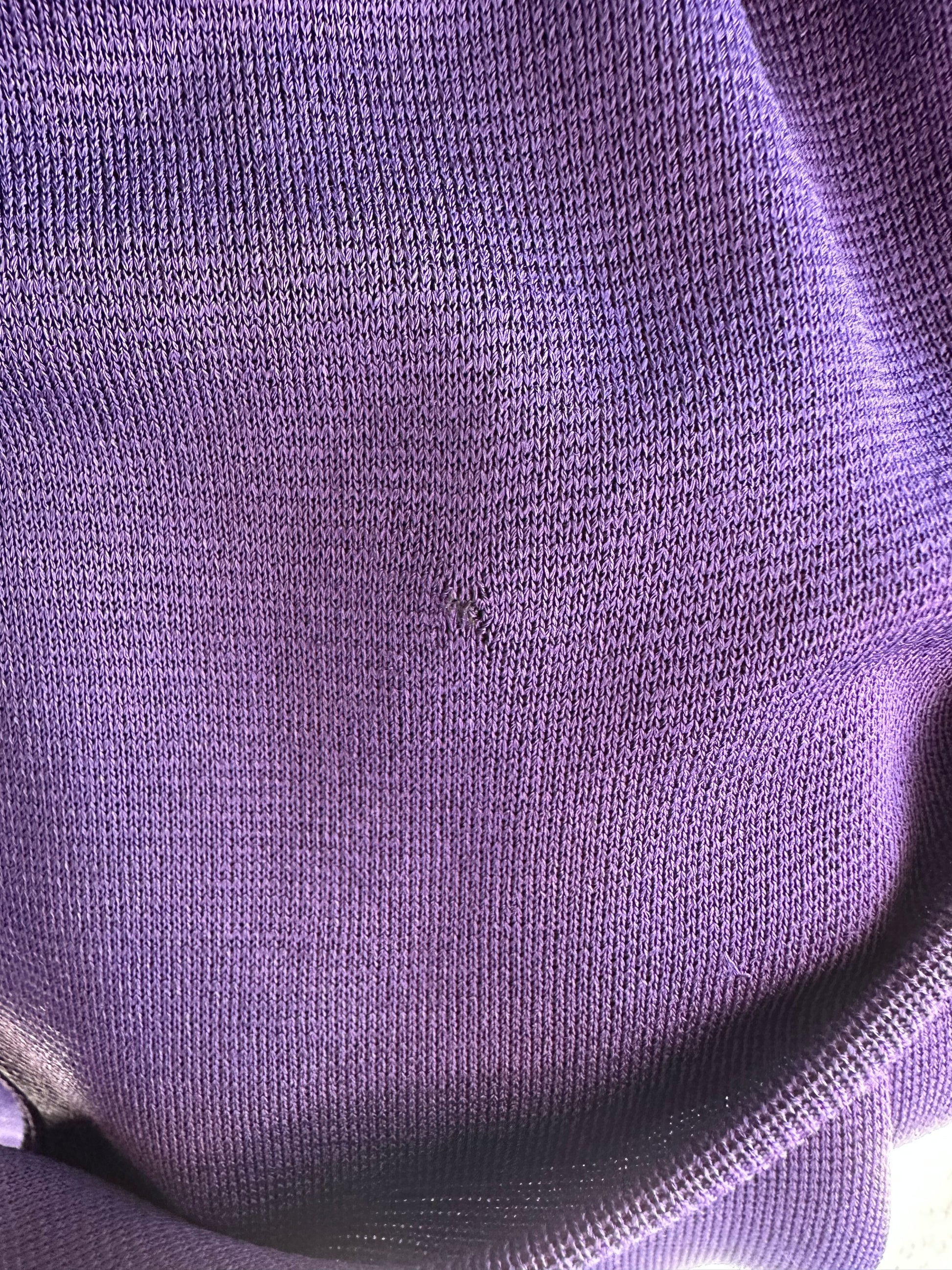 Lovely Alberta Ferretti purple dress, featuring four slits at the bottom. Pictured here on a size 8 UK, 5 7". There is no size label so please refer to the measurements below, there is not much stretch in the item, so it would probably fit an 8 UK best. There is a barely visible mark just above one of the slits a very small bit of discolouration to one of the armpits, please refer to the last images. Plus a small fixed hole.