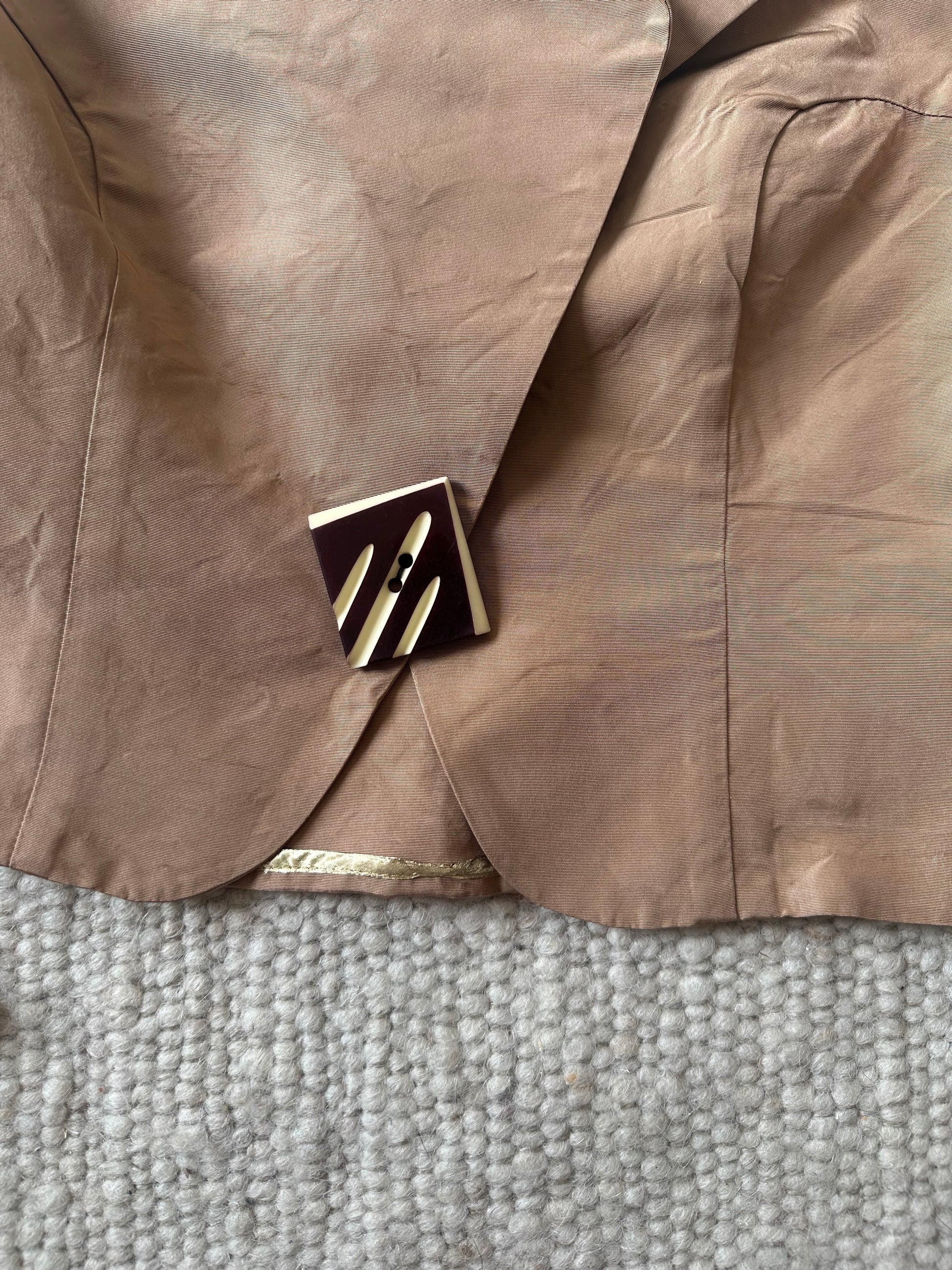 A beautifully cut Chloé S/S 2001 silk jacket in a dark beige tone. There is a statement button on the front (which is a little loose but still attached). The size on the label is a 42 FR, but it comes up smaller so please refer to the measurements below. It has been pictured here on a size 36 FR, 5 7".