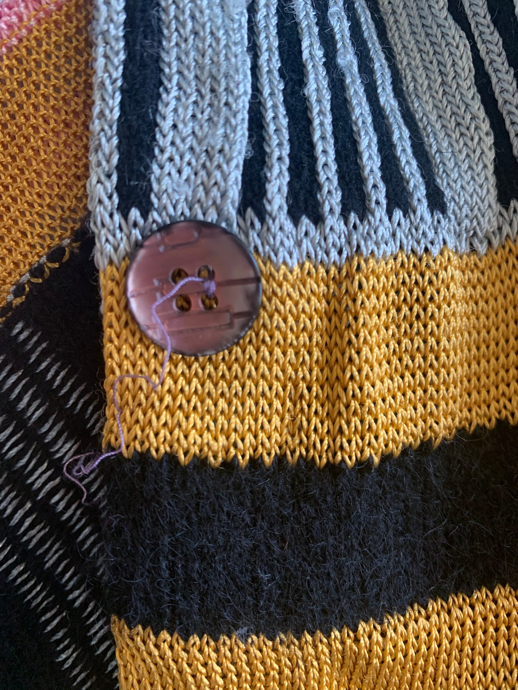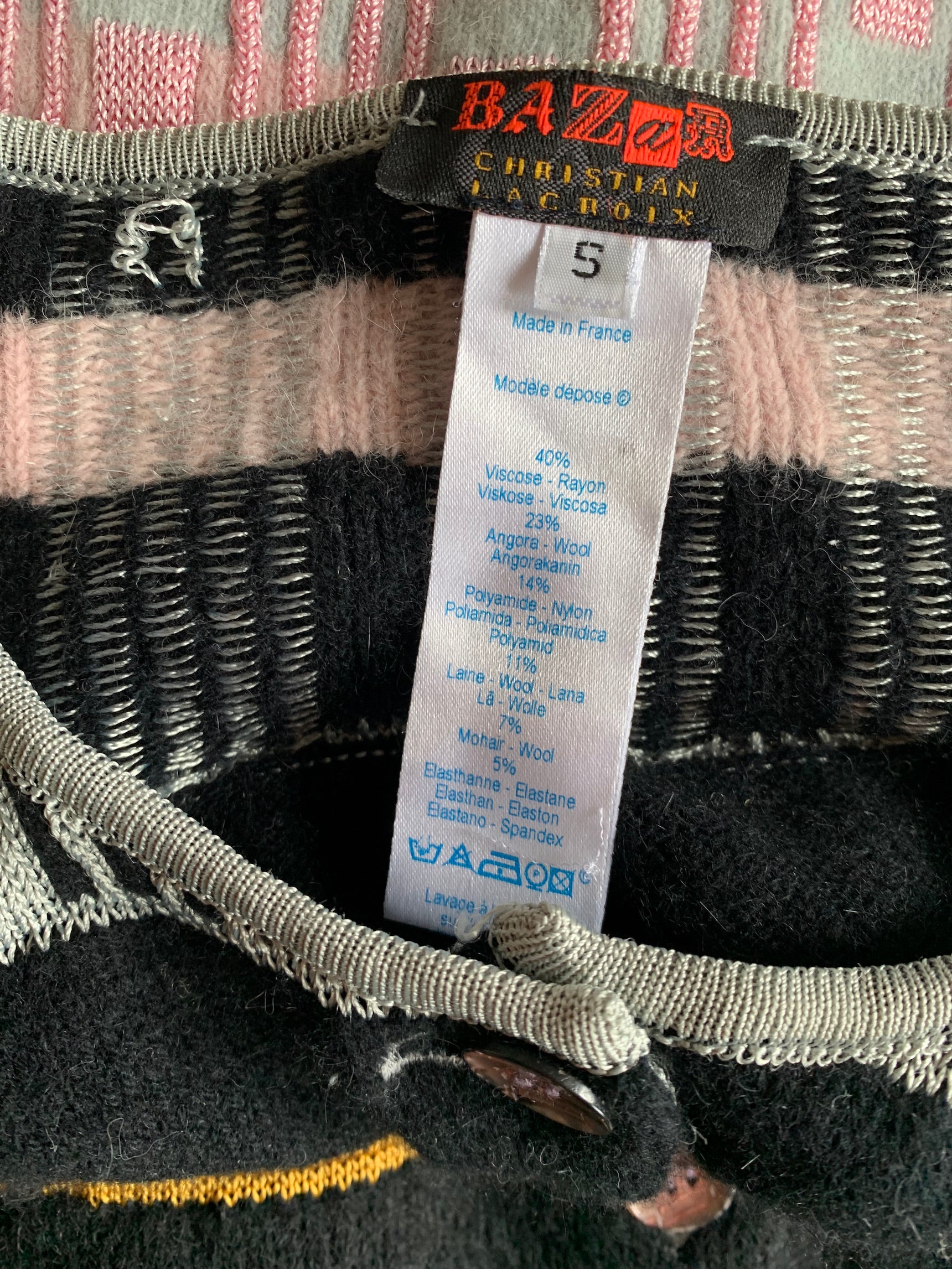 Beautiful knitted cardigan from Christian Lacroix, created using different fabrics and patterns. The size on the label is a S and there is some stretch but not a lot. It has been pictured here on a size 8 UK, 5 7". Please refer to the measurements below for further information. There is a small snag on the inside of collar, which cannot be seen when wearing the item. Also one of the buttons is losing its thread, so is slightly loose. It is easily fixable.