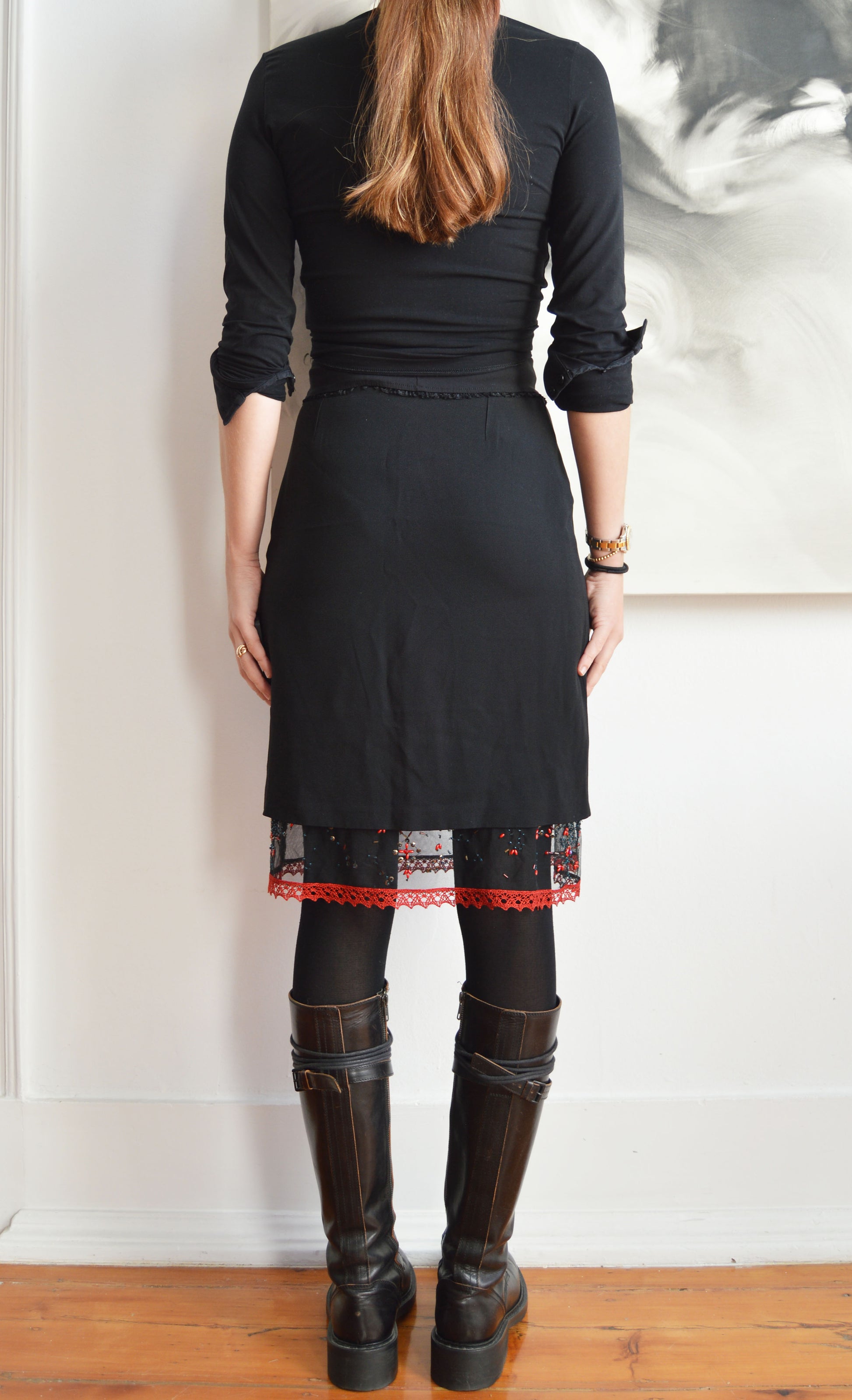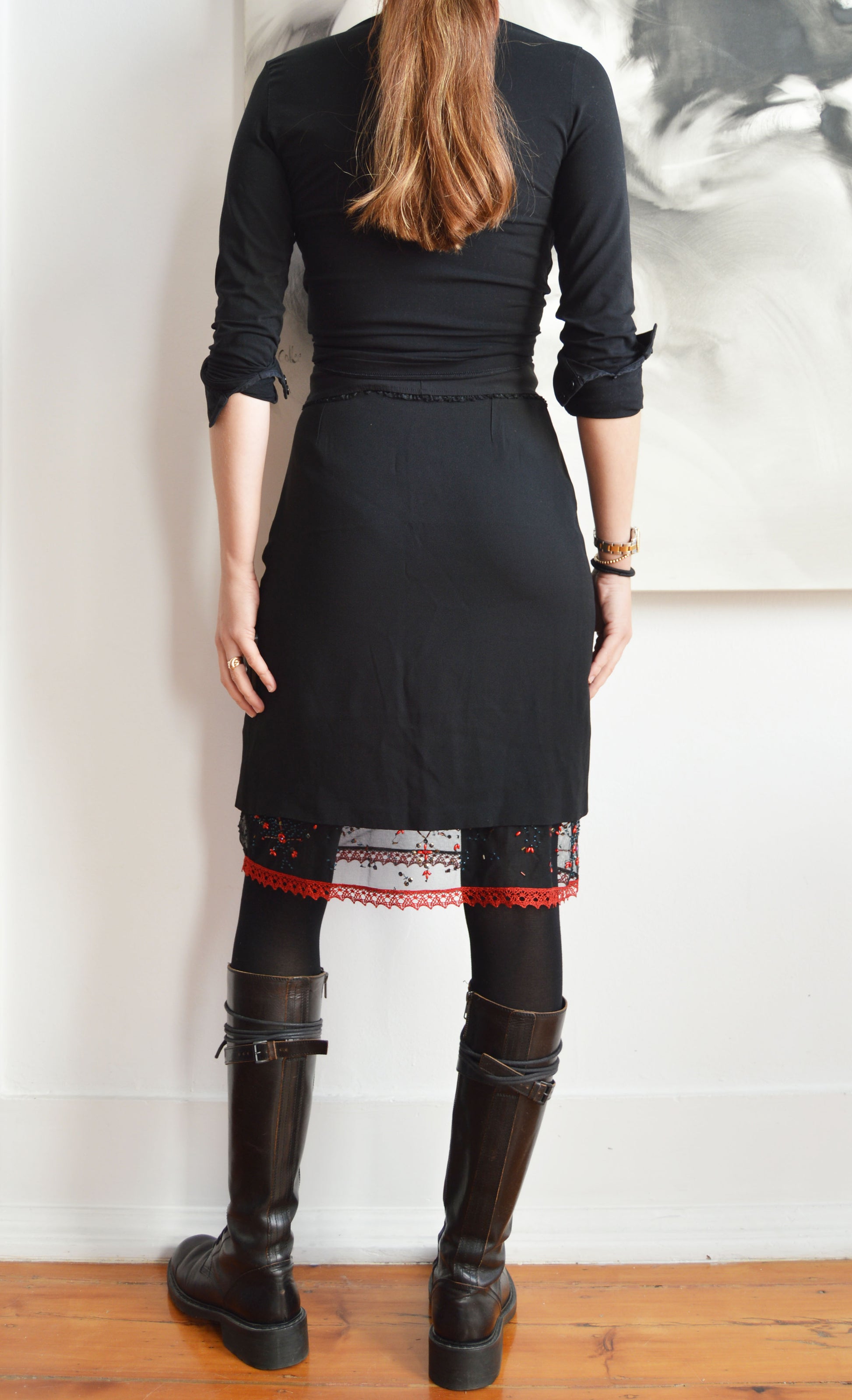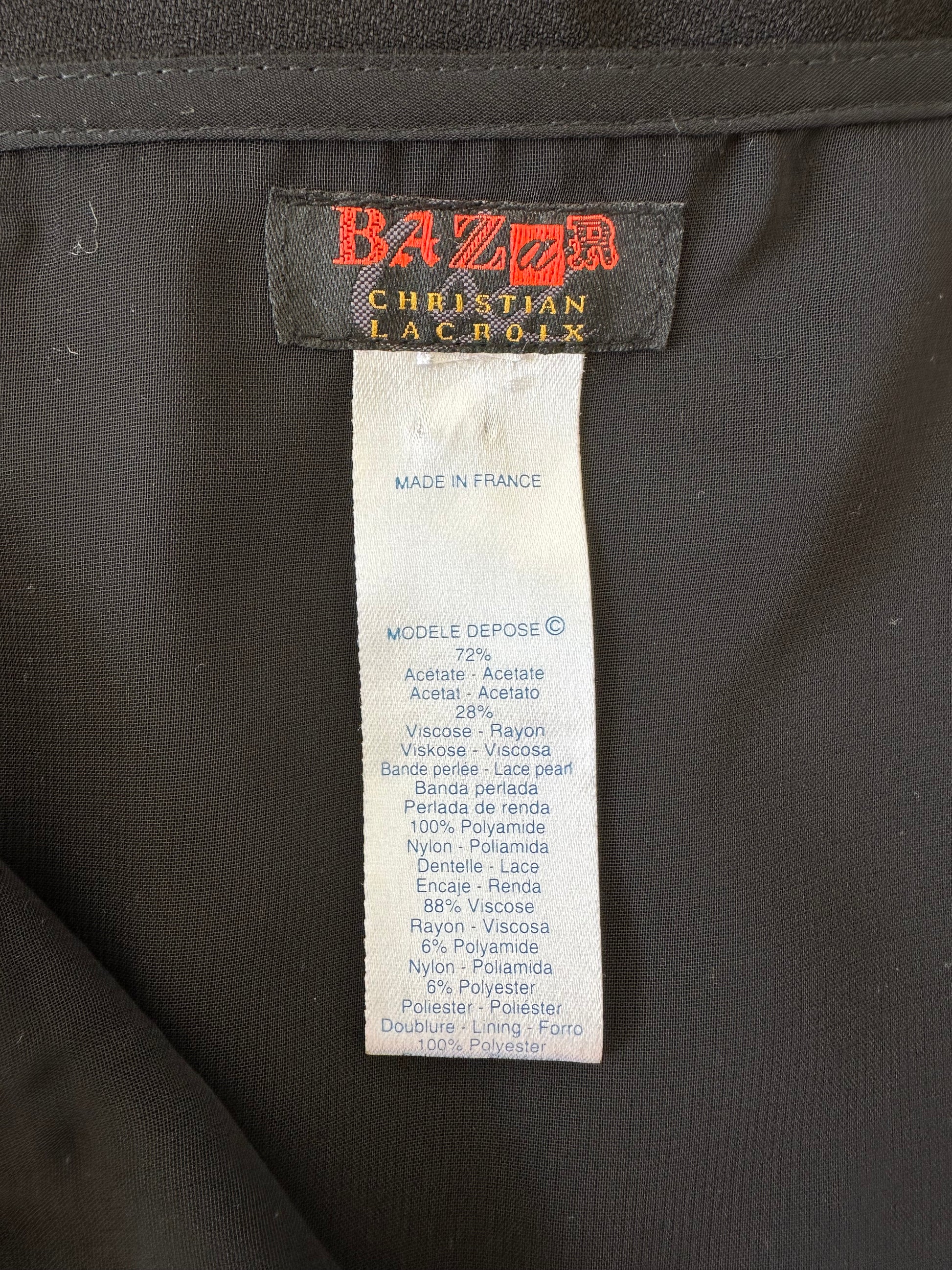 A gorgeous Christian Lacroix Bazar layered pencil skirt. The size label has been removed so please refer to the measurements below for more information. The skirt has been pictured here on a size 36 FR, 5 7". In great condition.