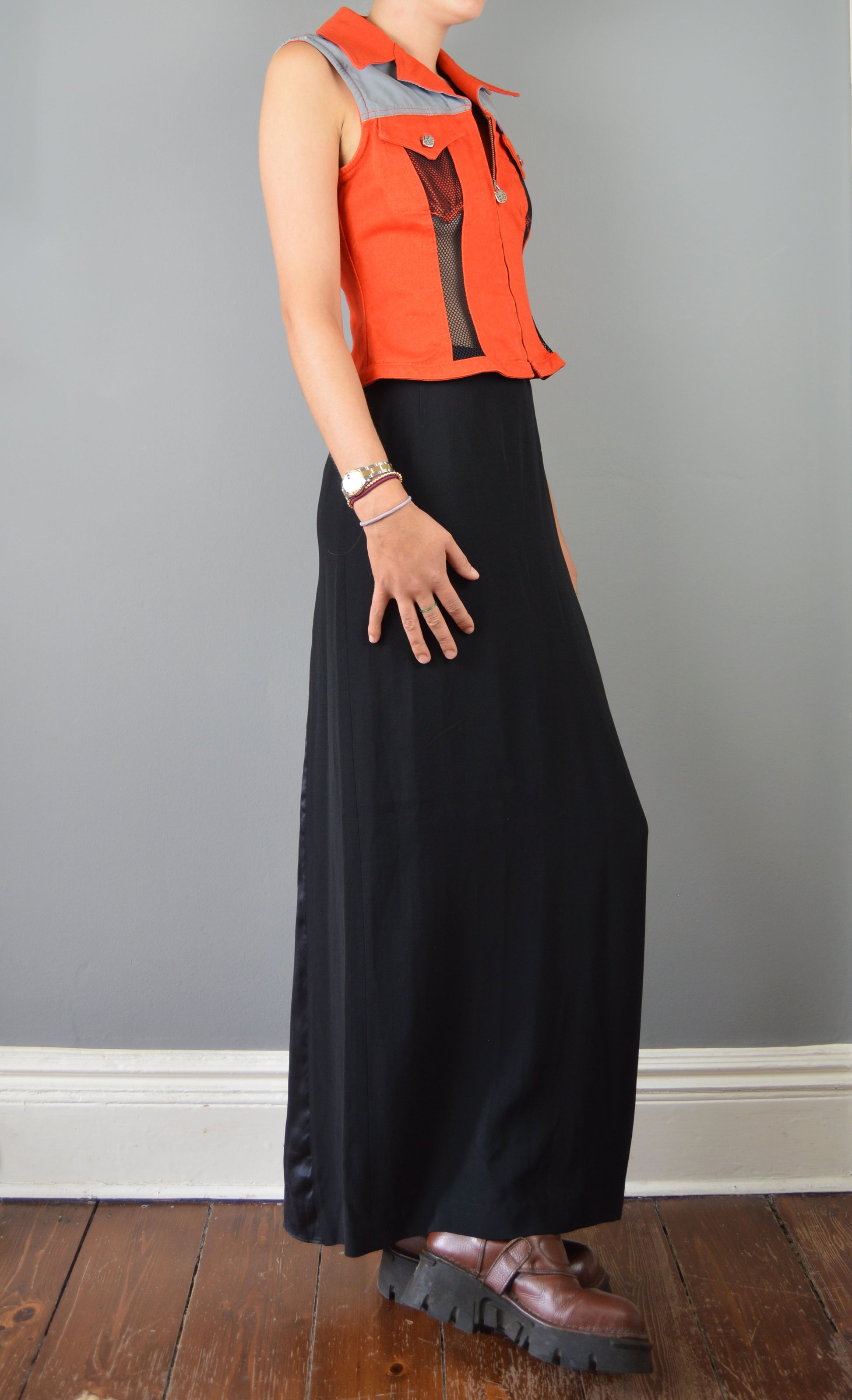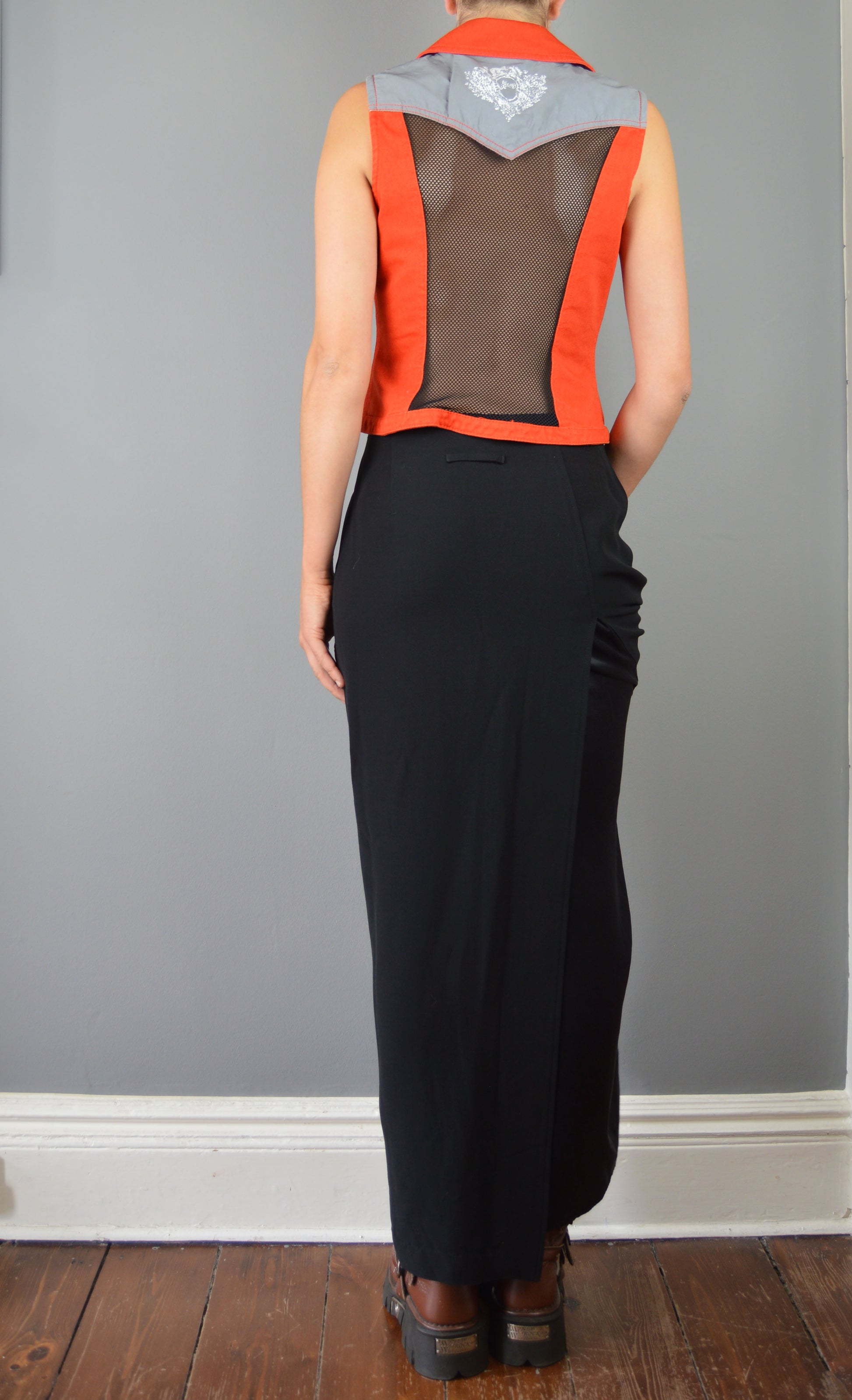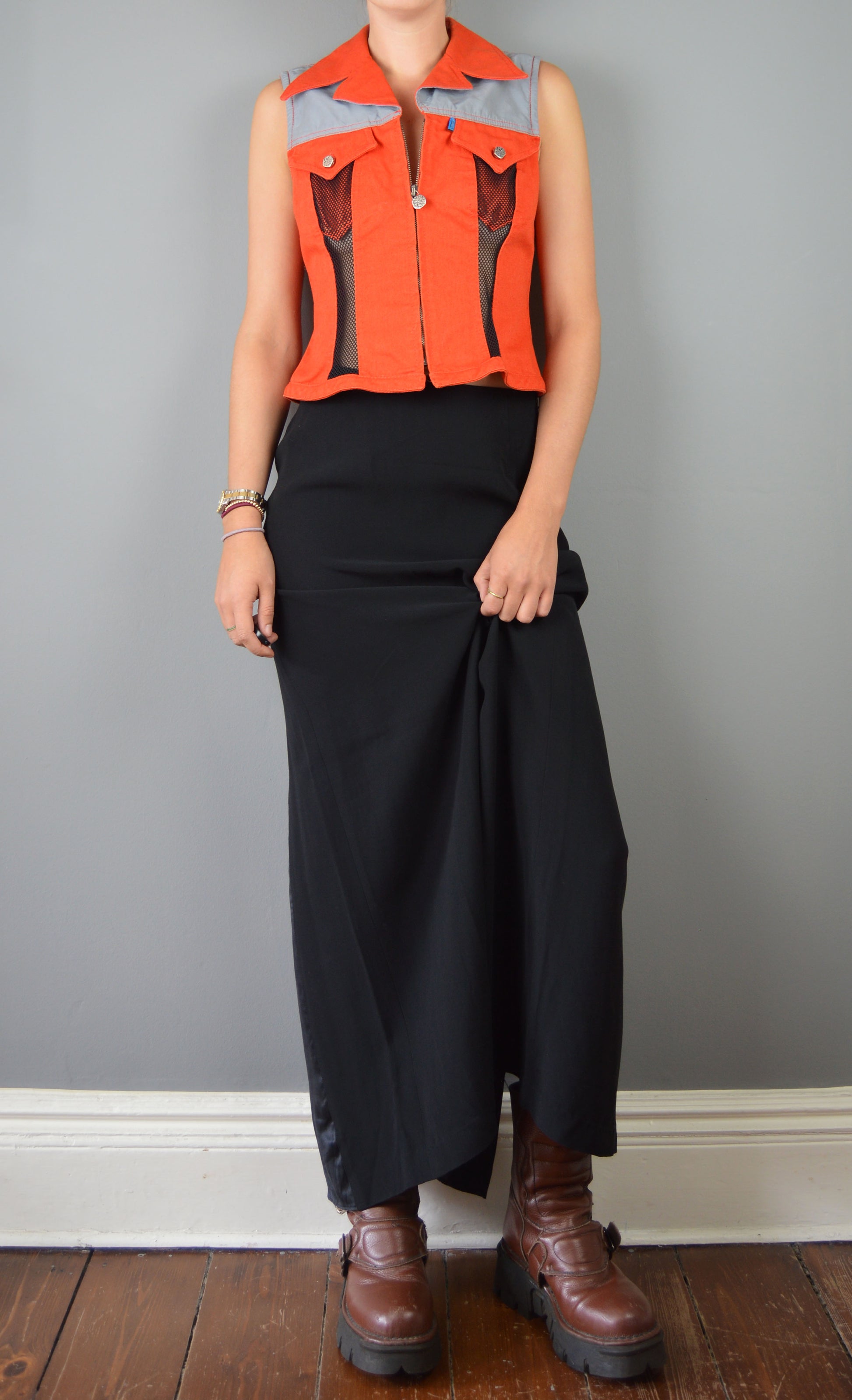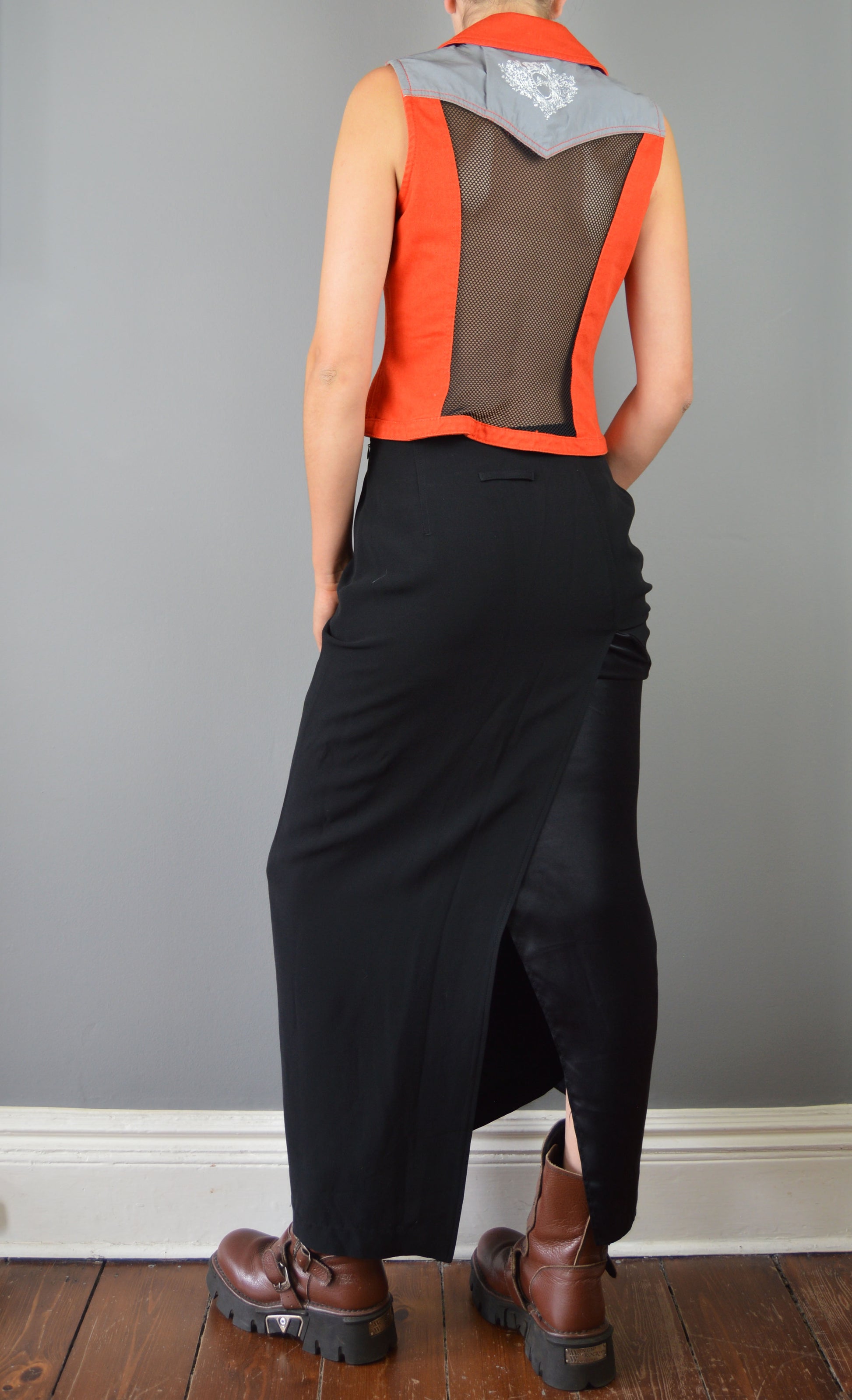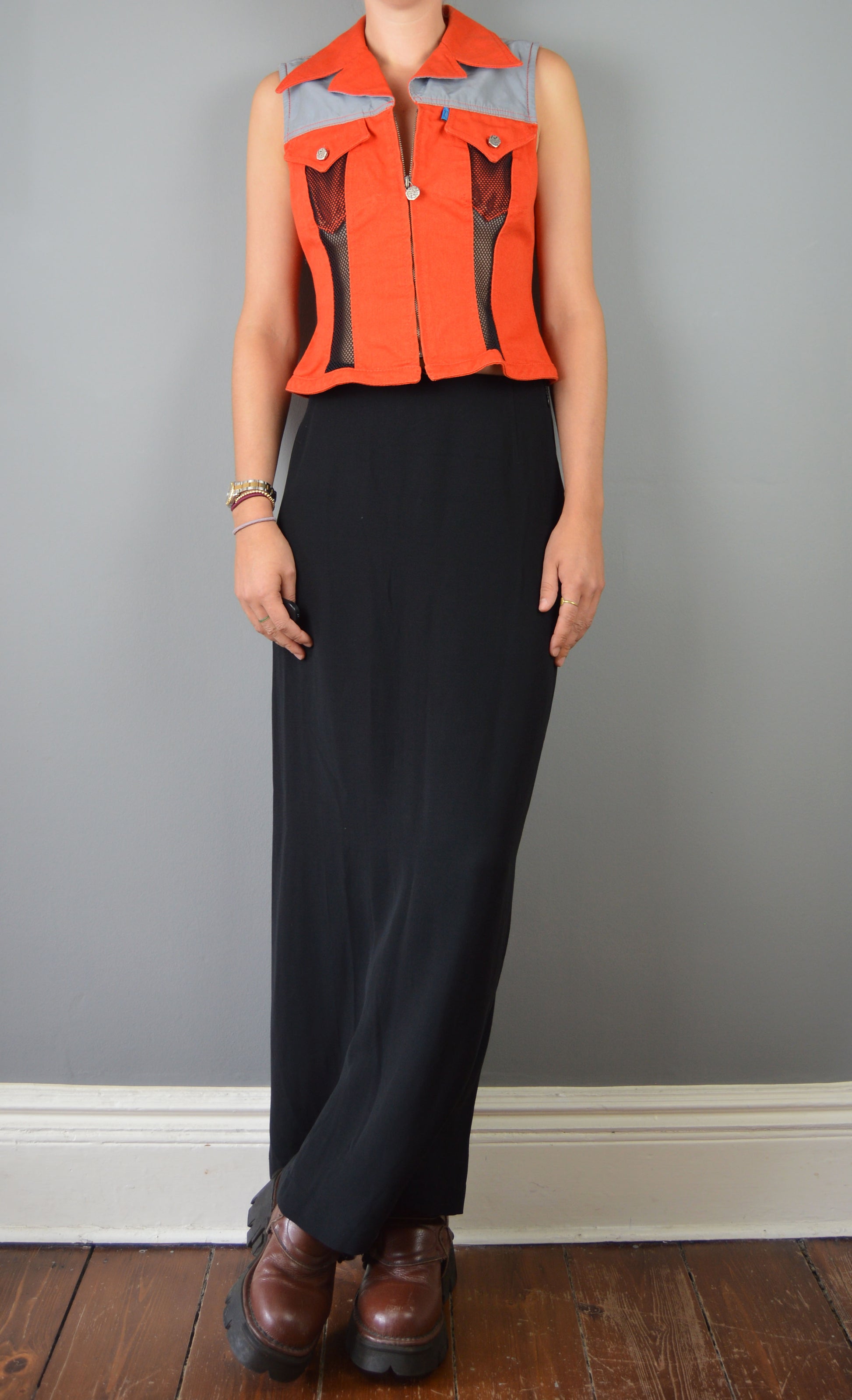 A funky and stylish denim gilet with mesh inserts on the front and back. In great vintage condition, with no flaws. The piece has been pictured here on a size 6/8 UK, 5 7". The size on the label states that it is 44 FR (16 UK), which is very inaccurate and it would best fit a 36 FR (40 IT), depending on the desired fit.