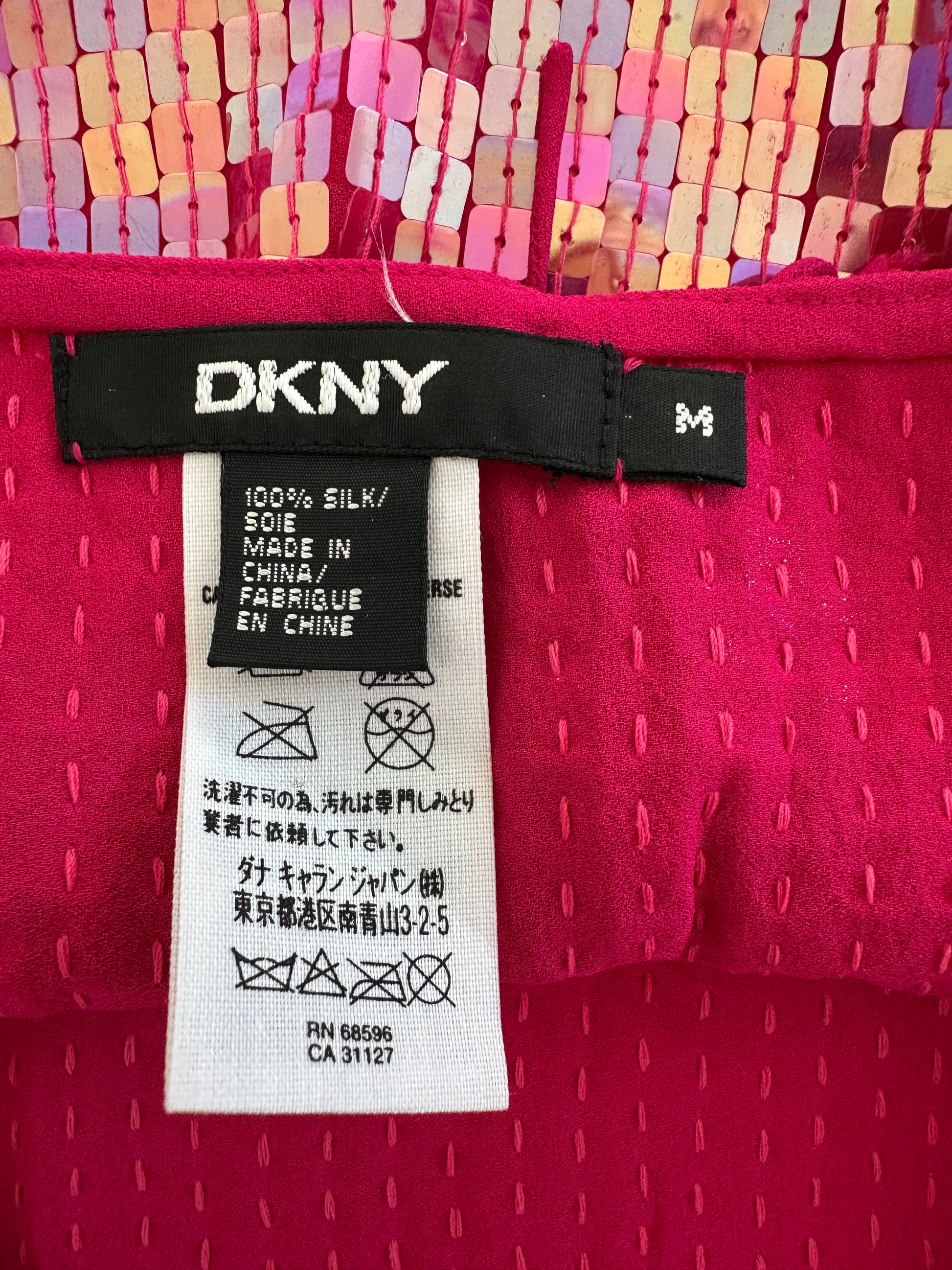 This DKNY hot pink sequin top is the perfect piece for a party! It has been pictured here on a size 40 IT, 5 7" and it is a size M on the label. In great condition apart from two missing sequins (please refer to the last image). Please refer to the measurements below for more information.