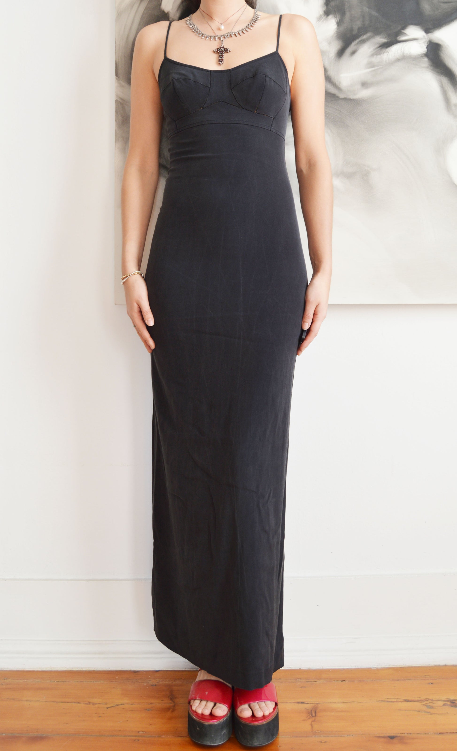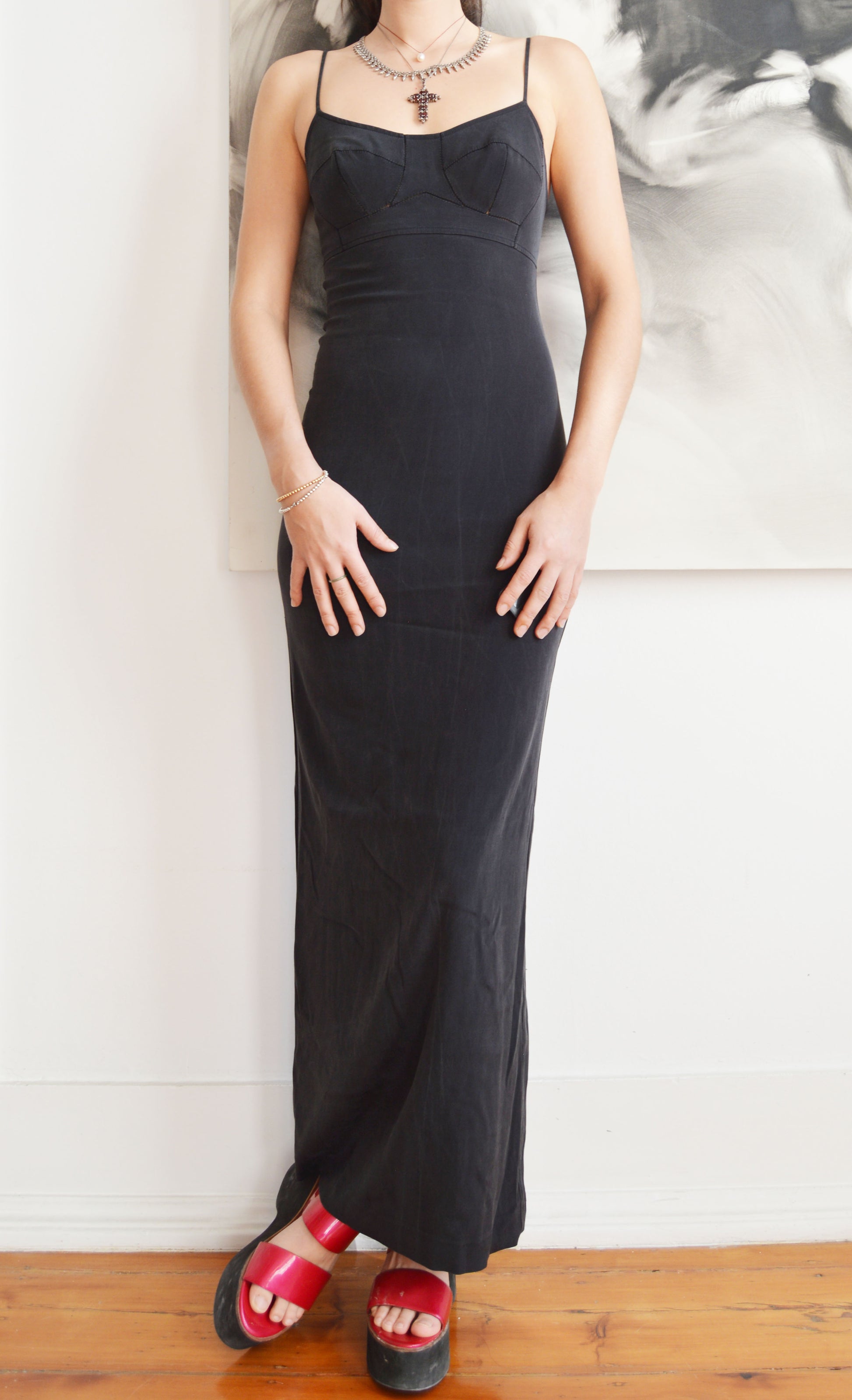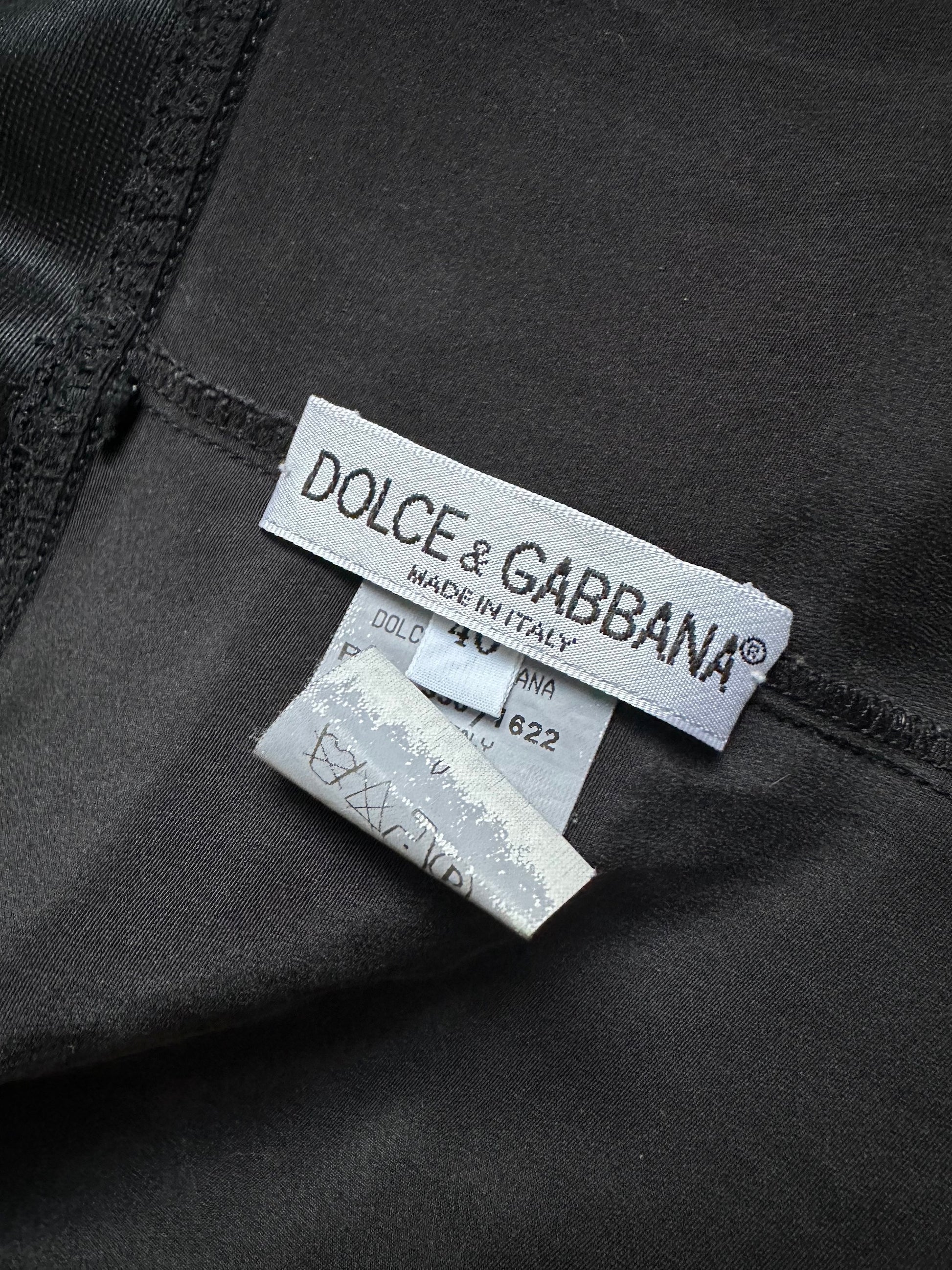 A gorgeous, vintage Dolce & Gabbana black silk dress with delicate stitching in the bust area. The size of the piece is a 40 IT (8 UK) and it has been pictured here on a size 6/8 UK, 5 7". The piece is very tight fitting. There are lines on the fabric, presumably from the previous owner washing it (it has been dry cleaned) and the delicate stitching in the bust area is a little loose in places.