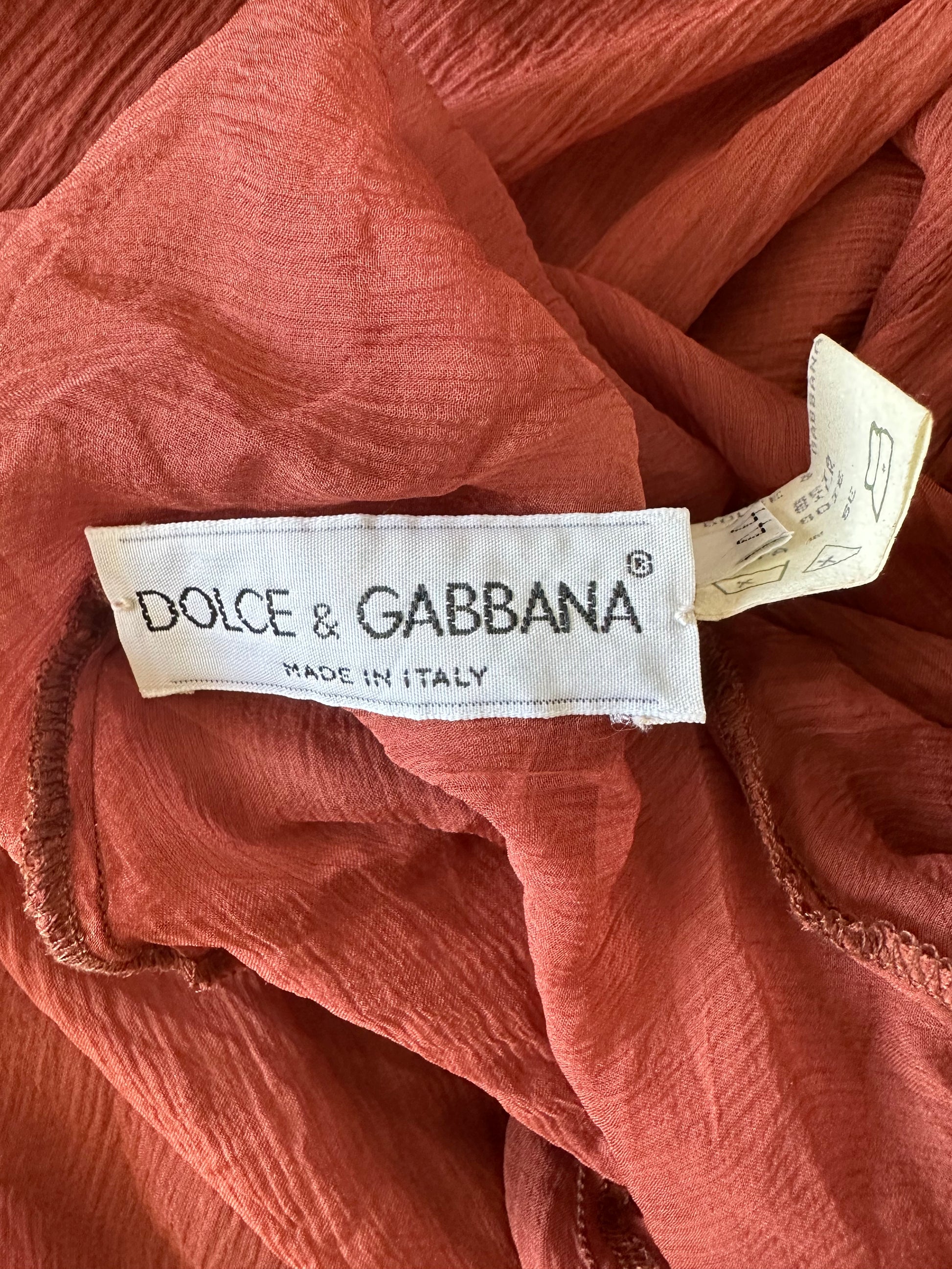 An ethereal Dolce & Gabbana S/S 1991 silk blouse with lots of layers. We love the pieces from this collection. The blouse is in perfect condition with absolutely no flaws. It has been pictured here on a size 40 IT, 5 7" and is a size 44 IT on the label. Please refer to the measurements below for more detail.