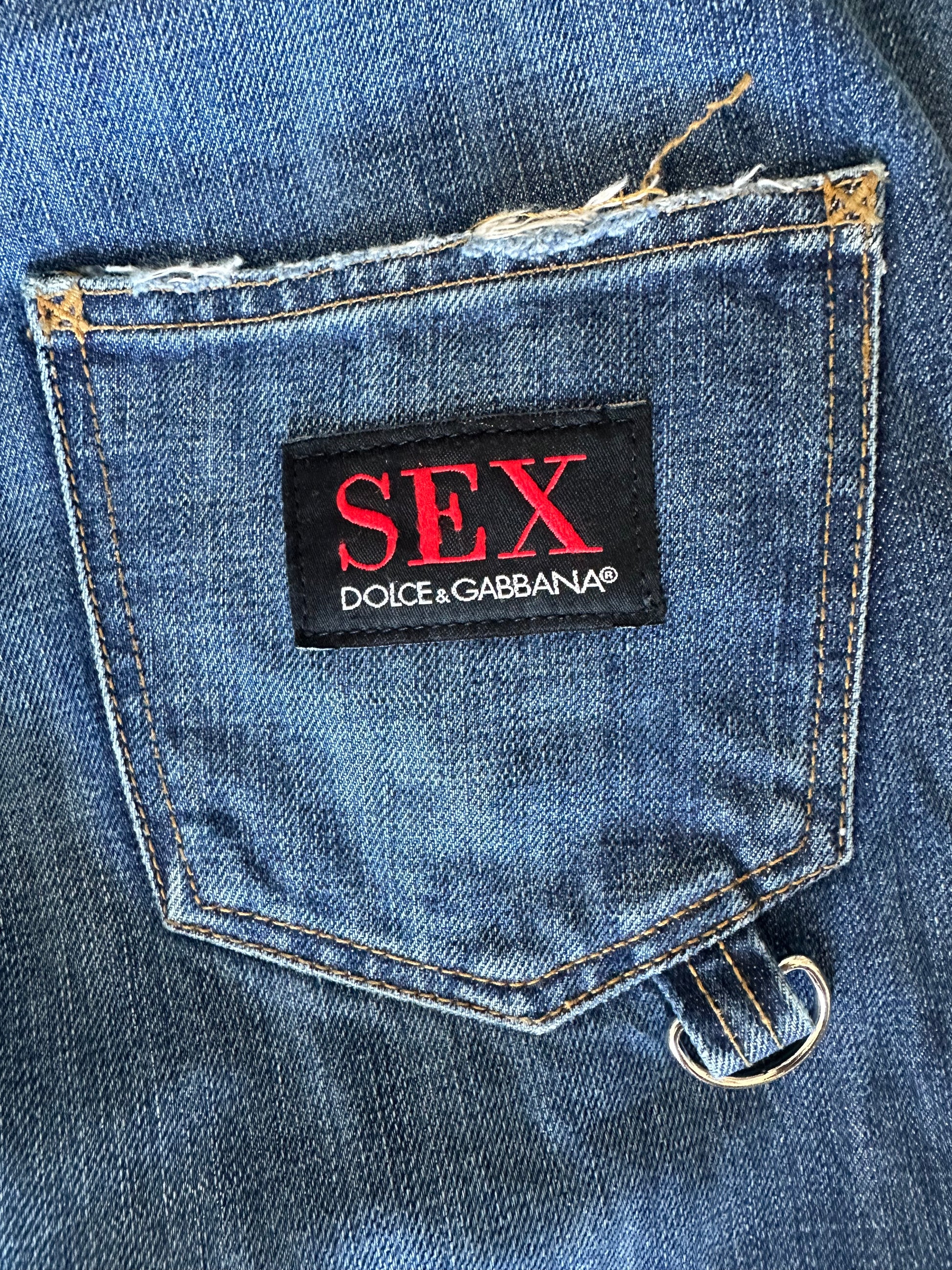 An amazing pair of Dolce & Gabbana S/S 2003 jeans with button fastening at the waist and the 'sex' badge on the back pocket. The jeans are distressed in places, whether from age or designed this way is unknown. Please refer to the images for further detail. The size on the label is a 42 IT and they have been pictured here on a size 40 IT, 5 7" (with the model holding the jeans in place).