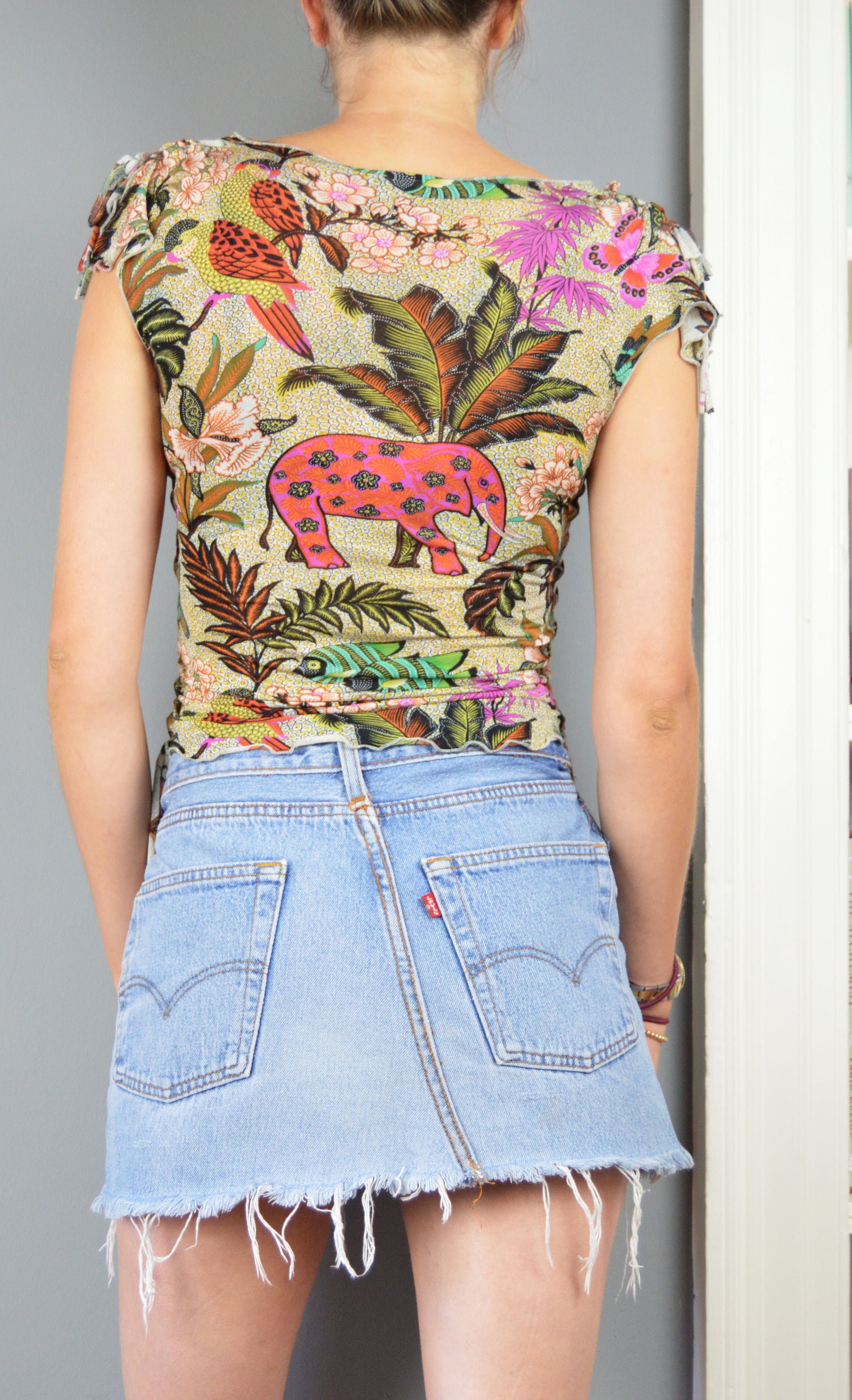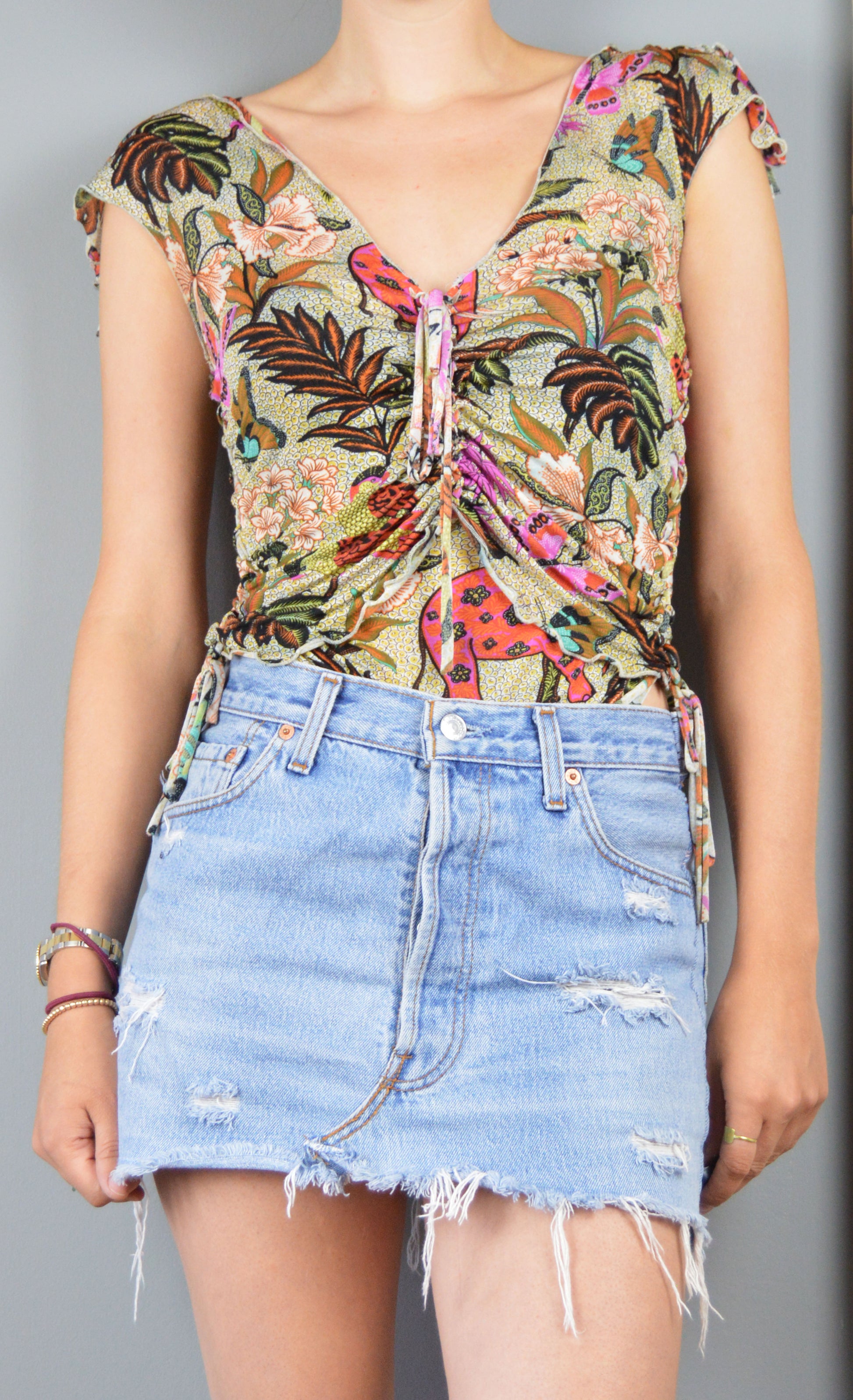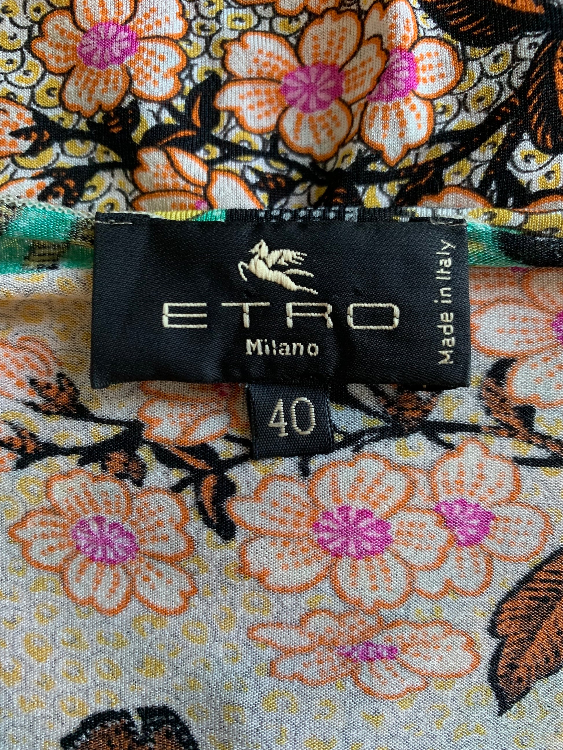 A lovely, playful top with a multicoloured pattern. The size on the label is an IT 40 (8 UK), which is accurate and it has been pictured here on a size 6/8 UK, 5 7". The top does have some stretch to it, so it would also fit a size 10 UK, depending on the desired fit. The top is in perfect condition and it is a viscose blend.
