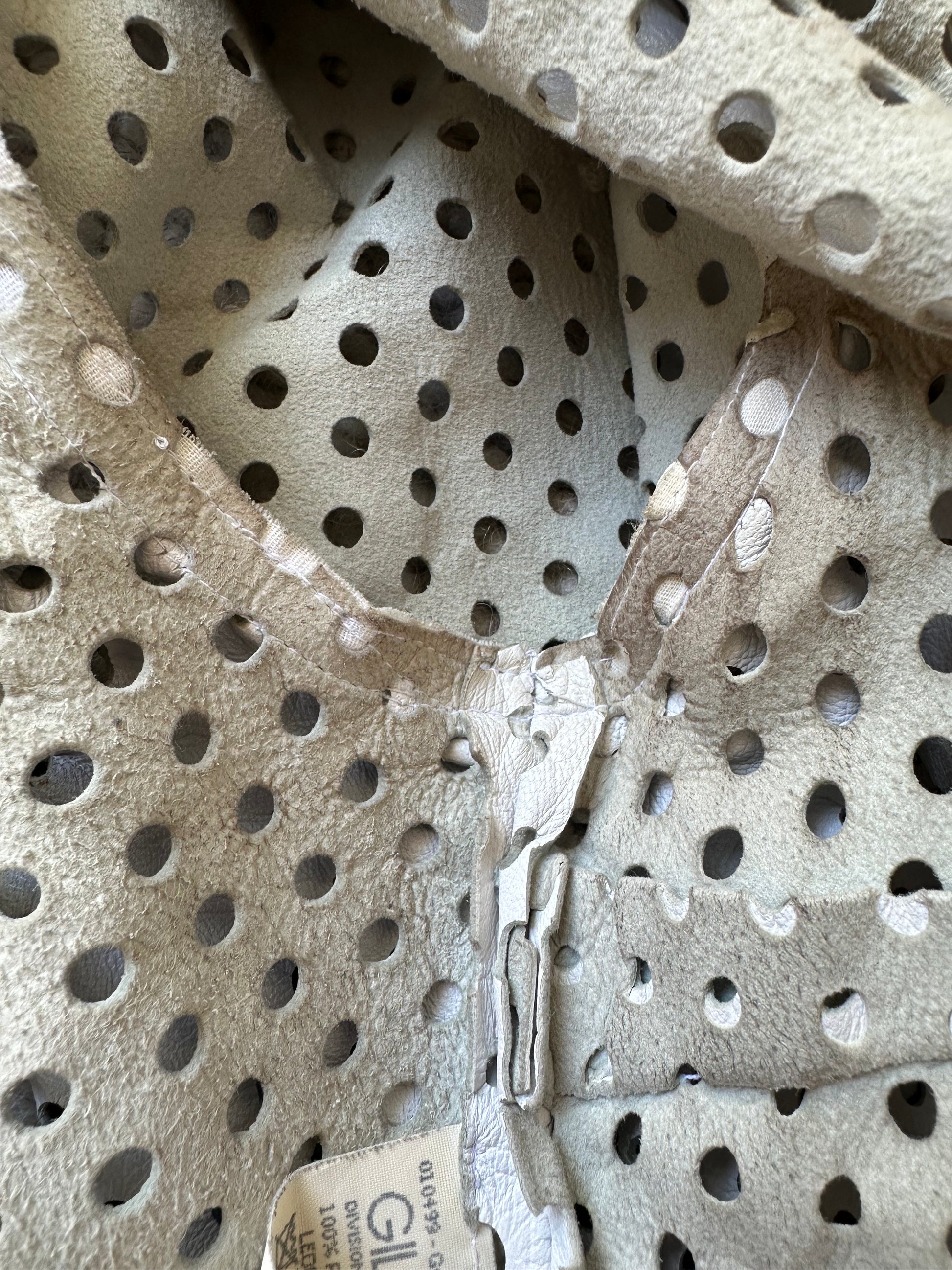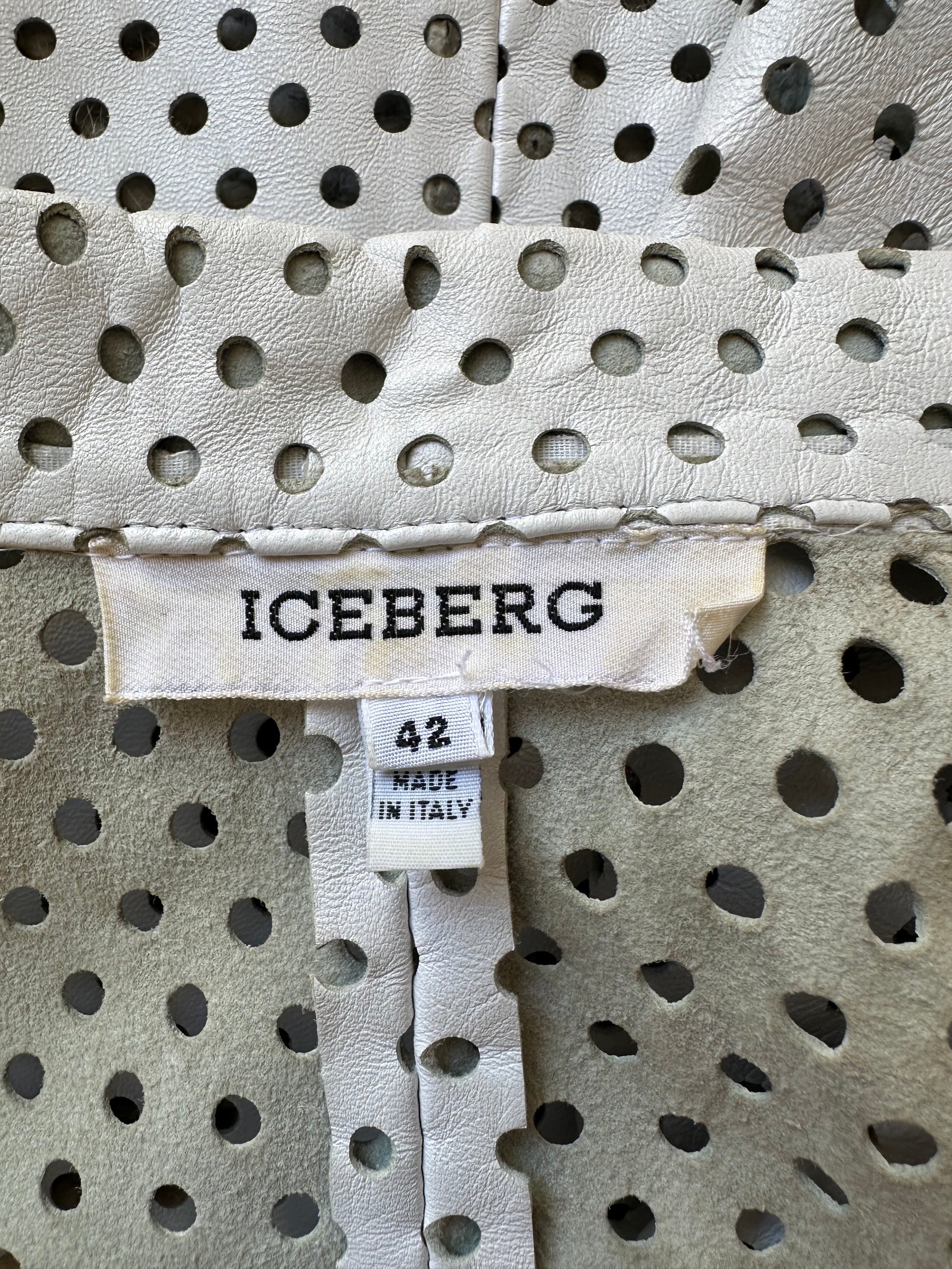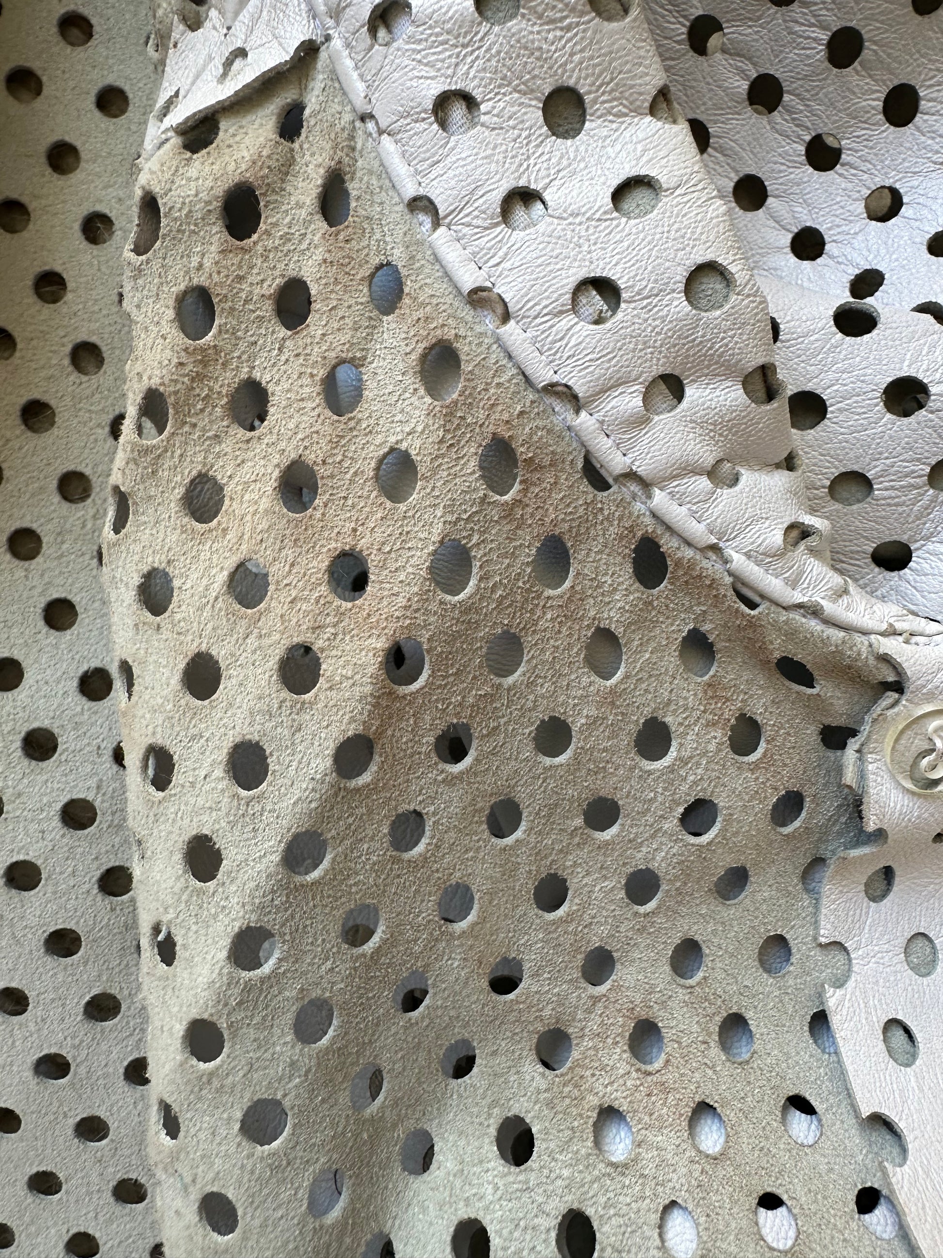 A gorgeous, vintage Iceberg perforated white leather jacket. The size on the label is a 42 IT, but it has been pictured here on a size 40 IT, 5 7" and fits more accurately. For further information please refer to the measurements below. The jacket is in great condition on the exterior, but the interior has some discolouration (please refer to the last images).