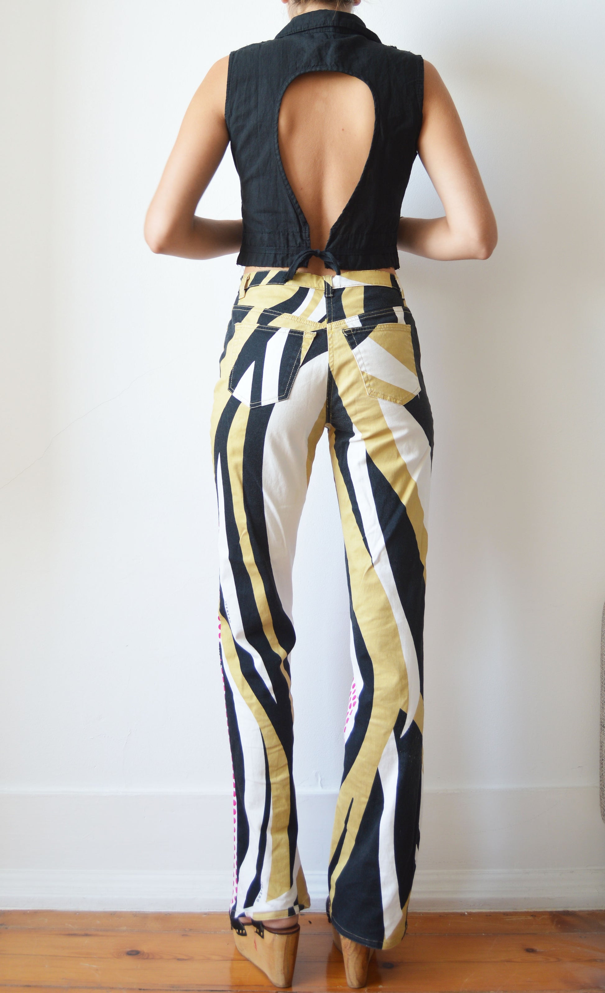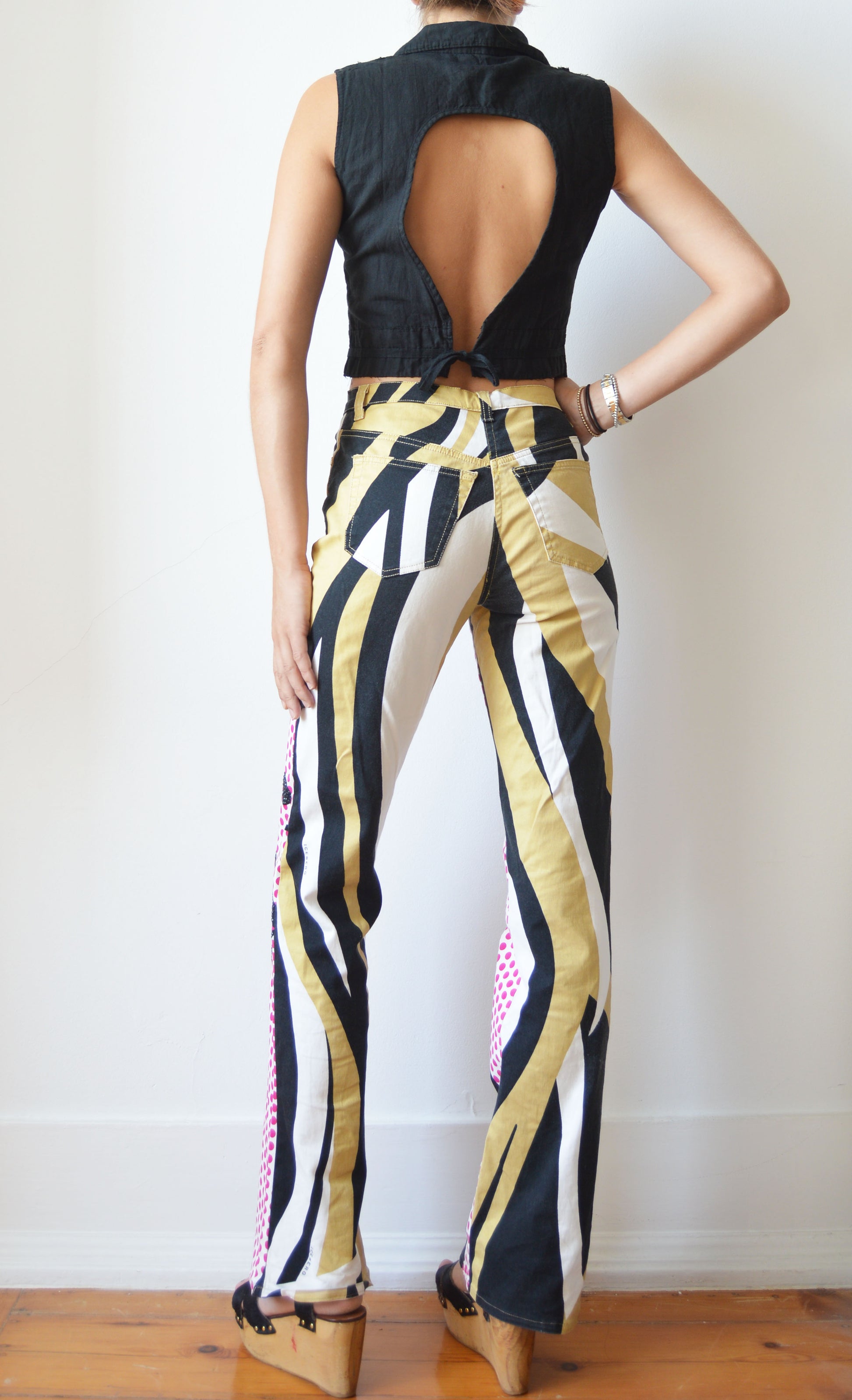 The most gorgeous Iceberg S/S 2001 jeans featuring different patterns on the front and back as well as sequin detailing. The size on the label is a 44 IT, and they have been pictured here on a size 40 IT, 5 7". Please refer to the measurements below for more information. The jeans do have a little stretch to them. They are in good condition, with all flaws pictured.