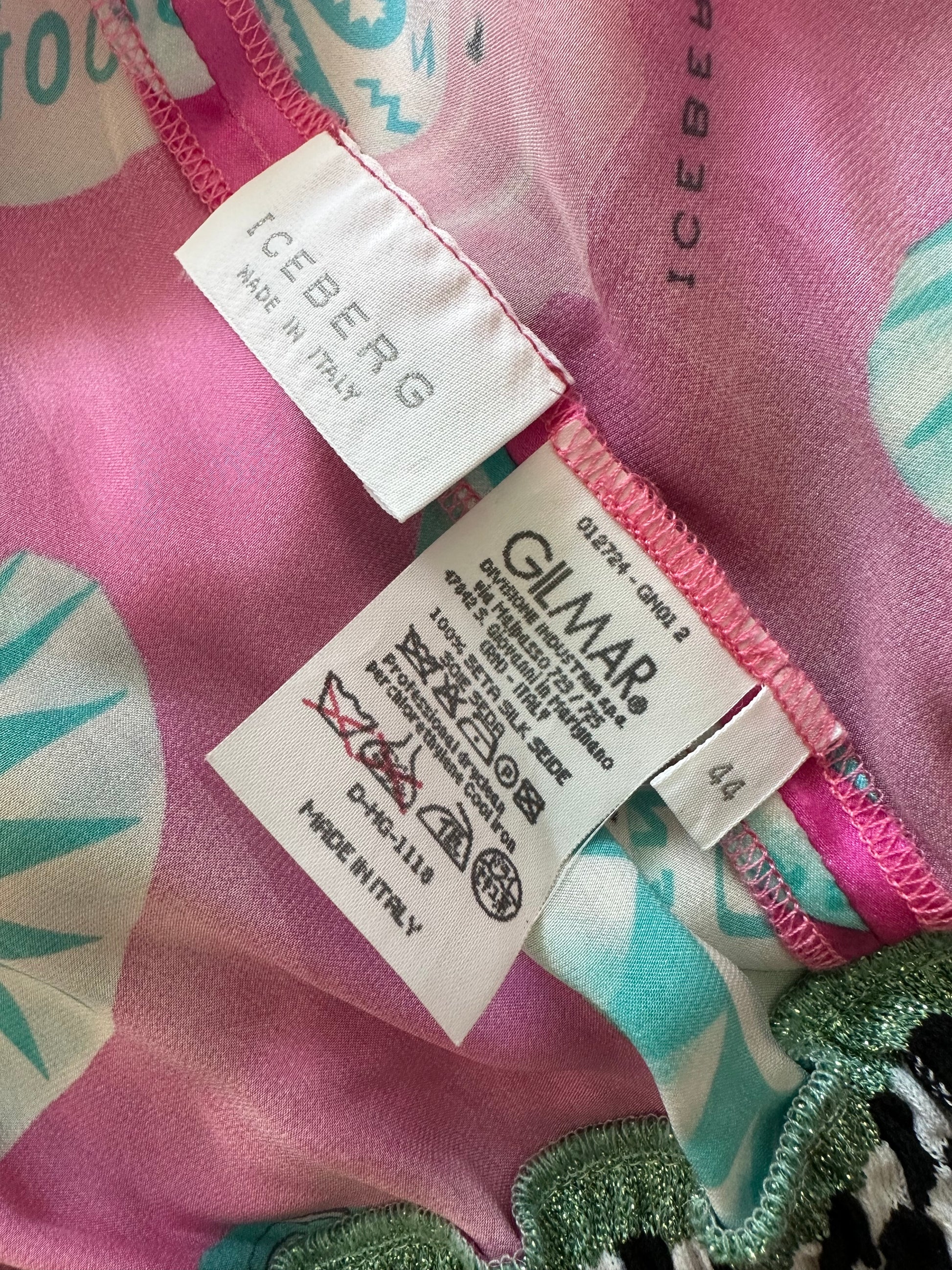 A stunning top by Iceberg, with the pattern seen on the S/S 2001 runway. The piece is a size 44 IT on the label and has been pictured here on a size 8 UK, 5 7". It would fit a variety of sizes as the neck and hem have some stretch to them (40-44 IT). In good condition apart from a couple of very small stains on the back of the collar, which have been pictured.