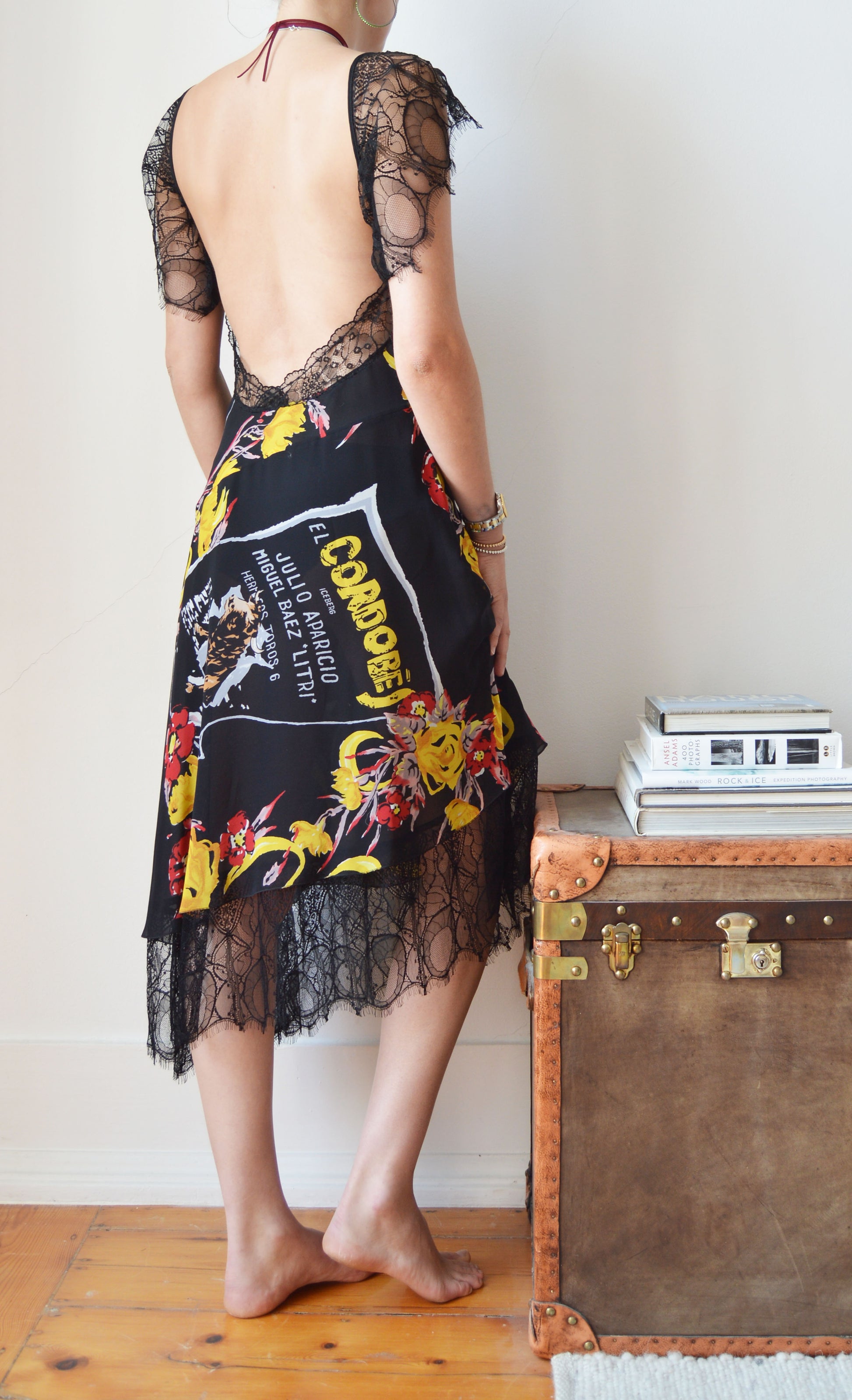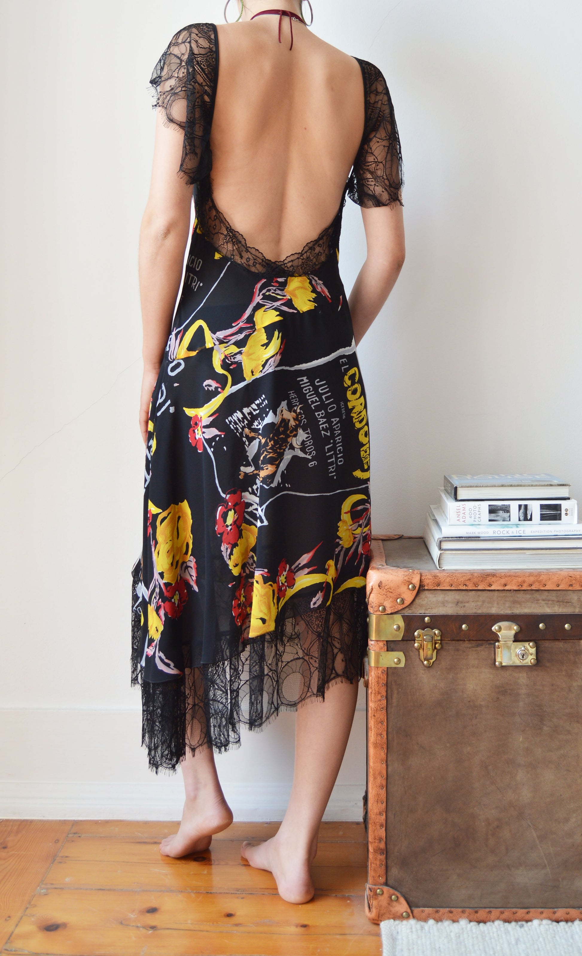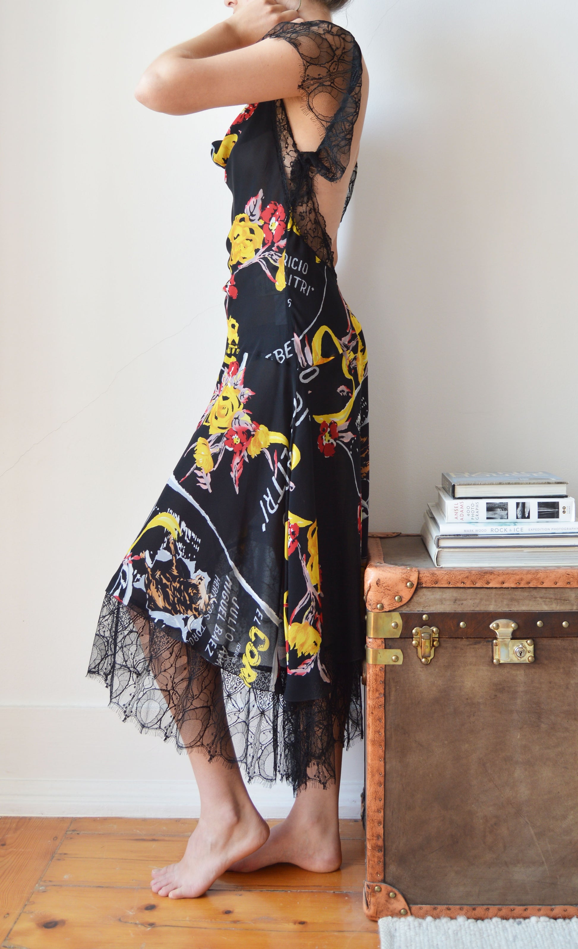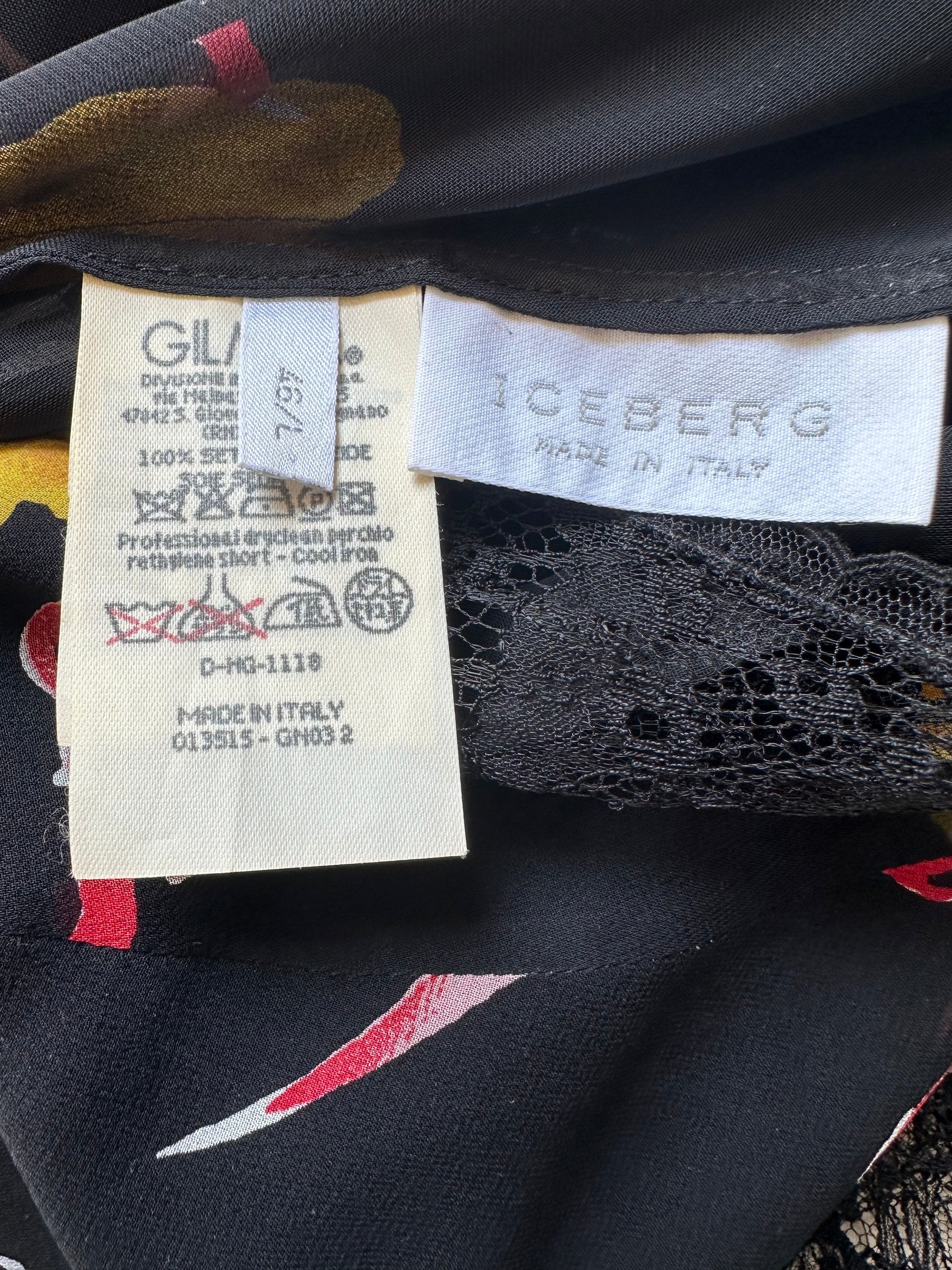 The most utterly, gorgeous Iceberg silk dress. Featuring lace detailing as well as a backless silhouette. The size on the label is a L (46 IT) but it fits a size 42 IT better. Seen here on a size 40 IT, 5 7". In perfect condition and comes with a matching shawl.
