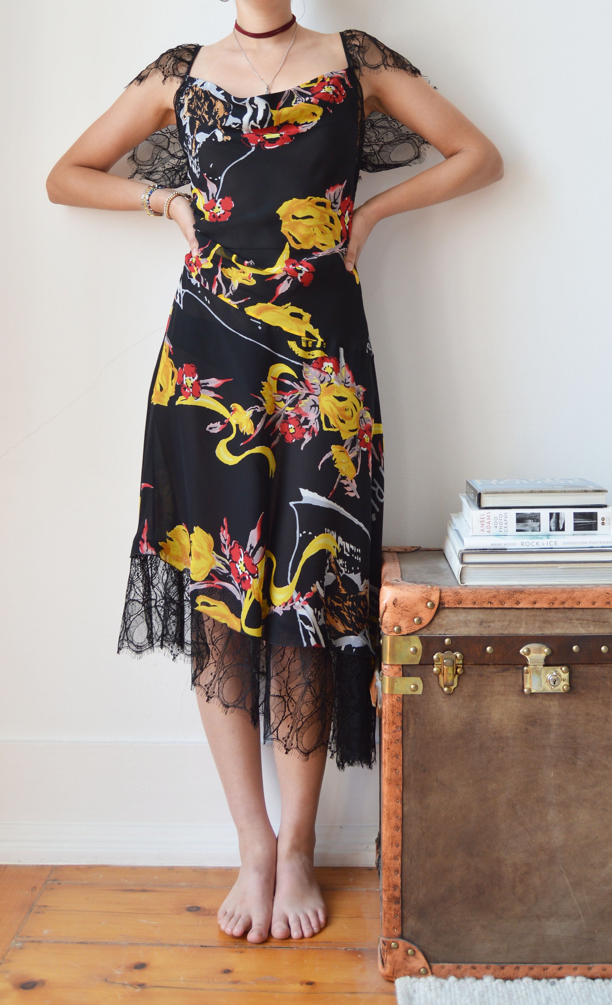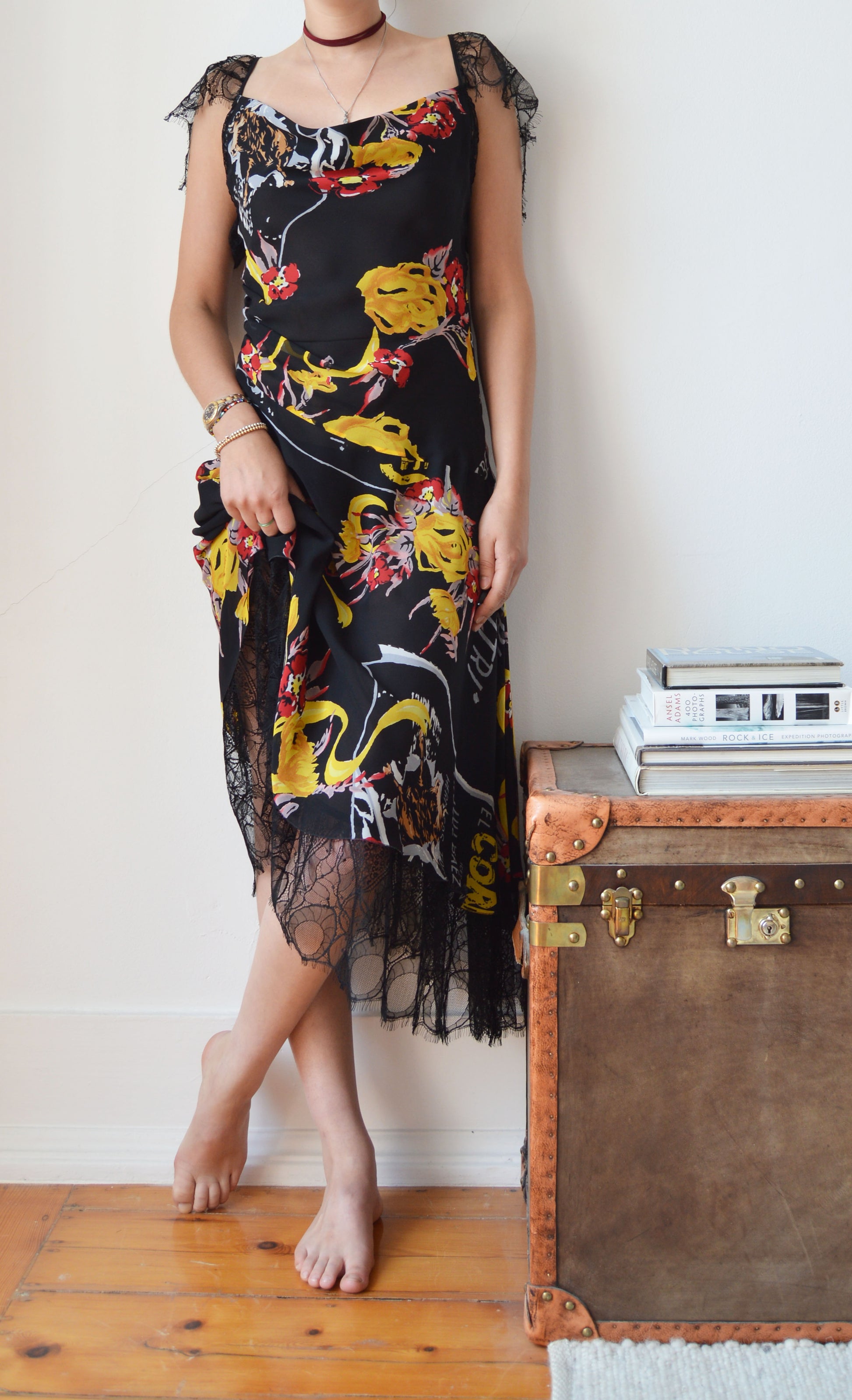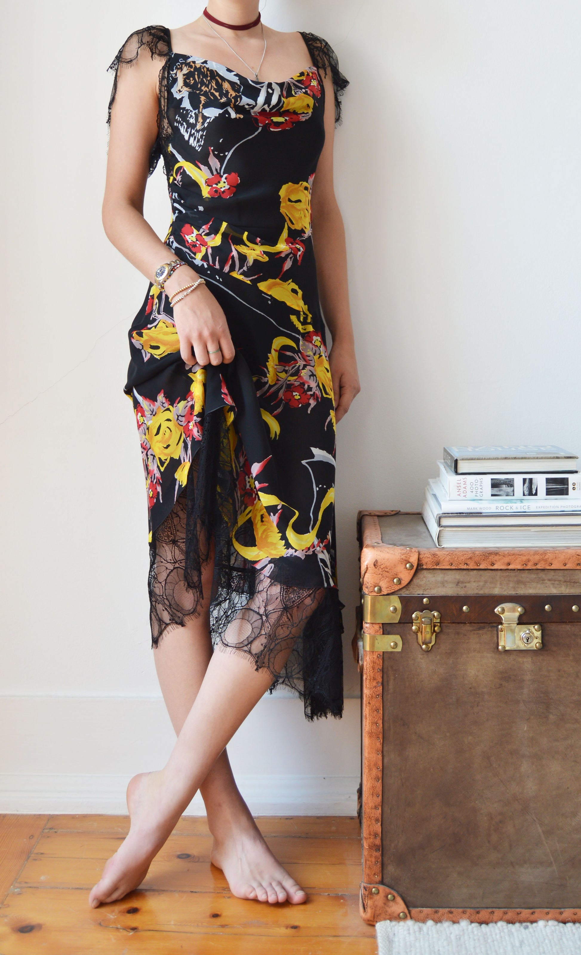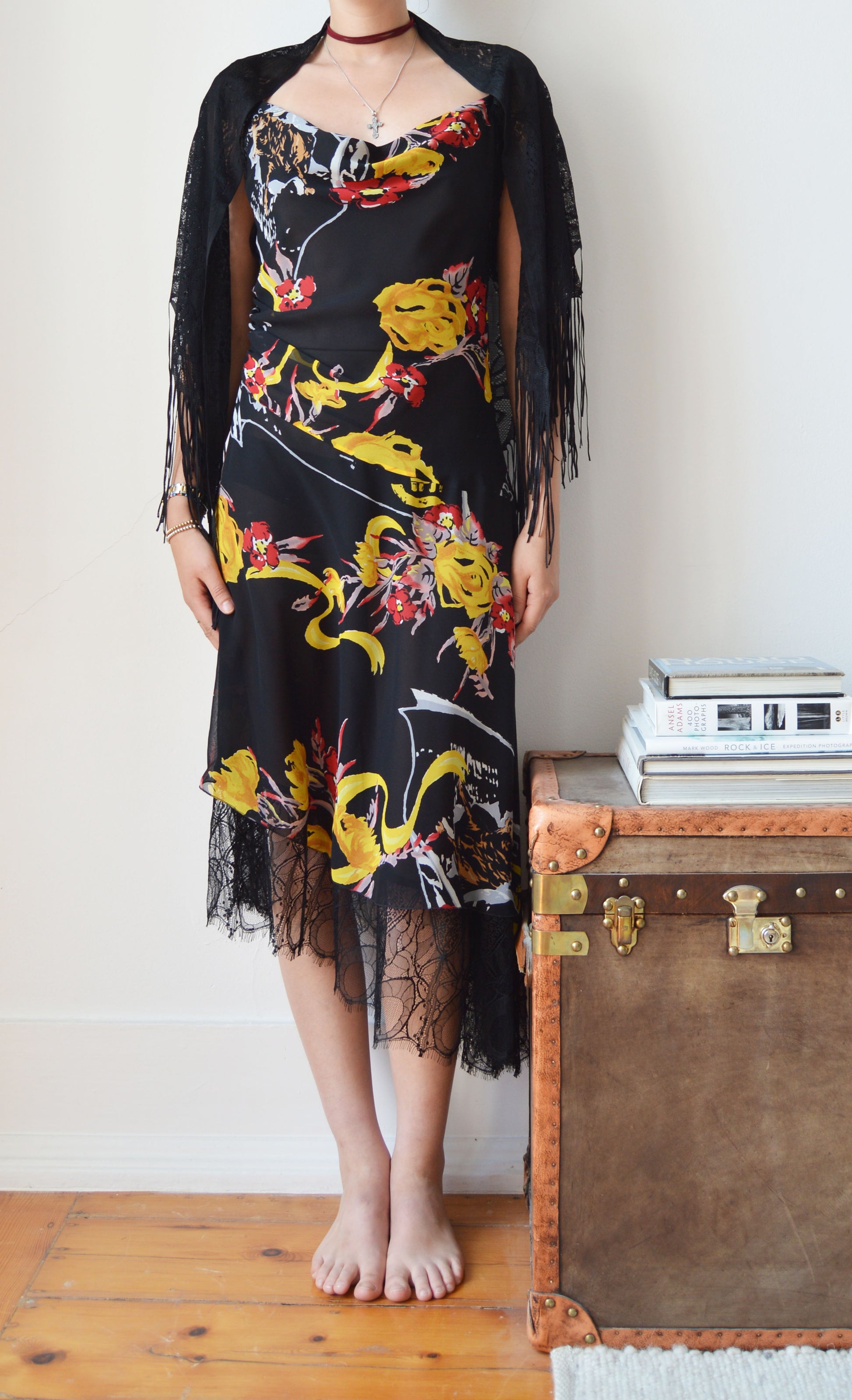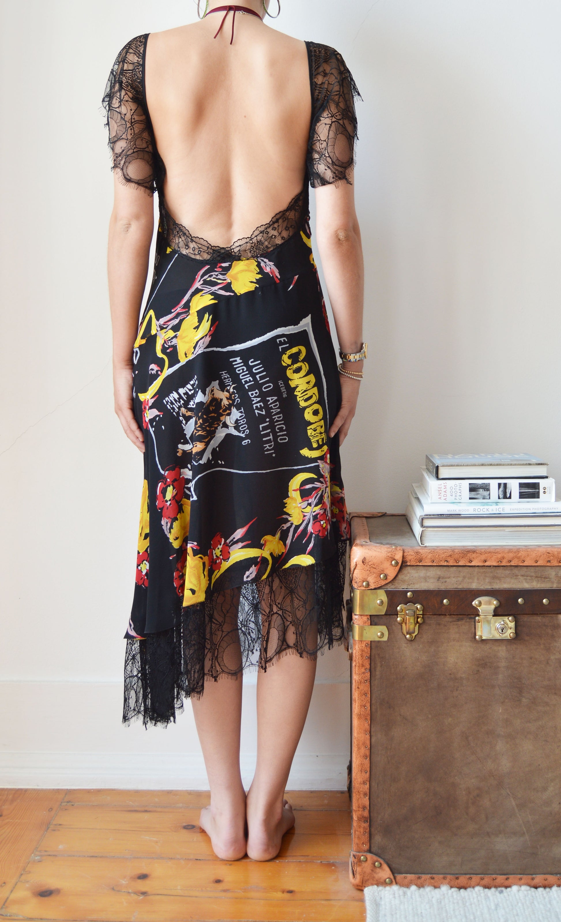 The most utterly, gorgeous Iceberg silk dress. Featuring lace detailing as well as a backless silhouette. The size on the label is a L (46 IT) but it fits a size 42 IT better. Seen here on a size 40 IT, 5 7". In perfect condition and comes with a matching shawl.