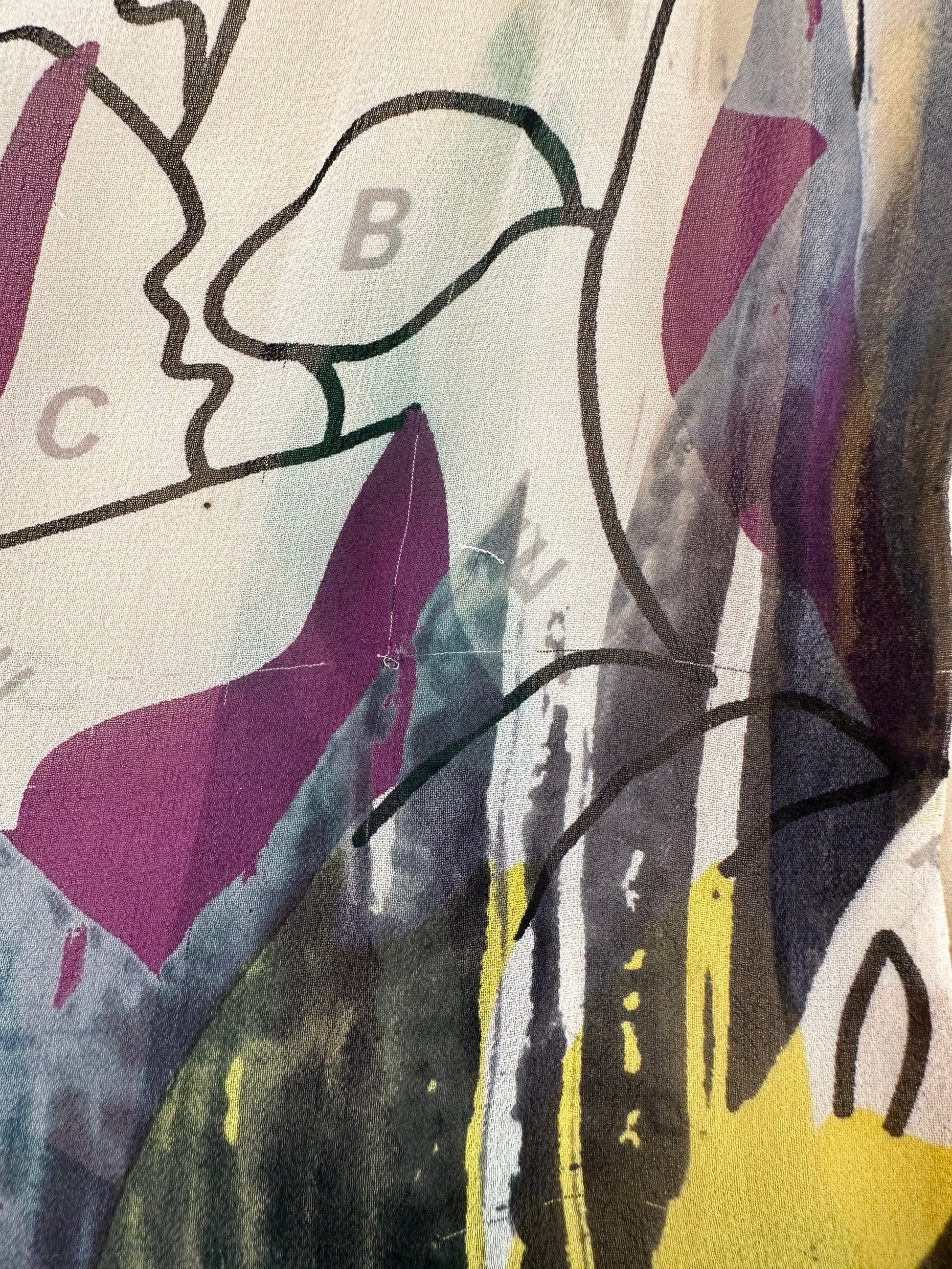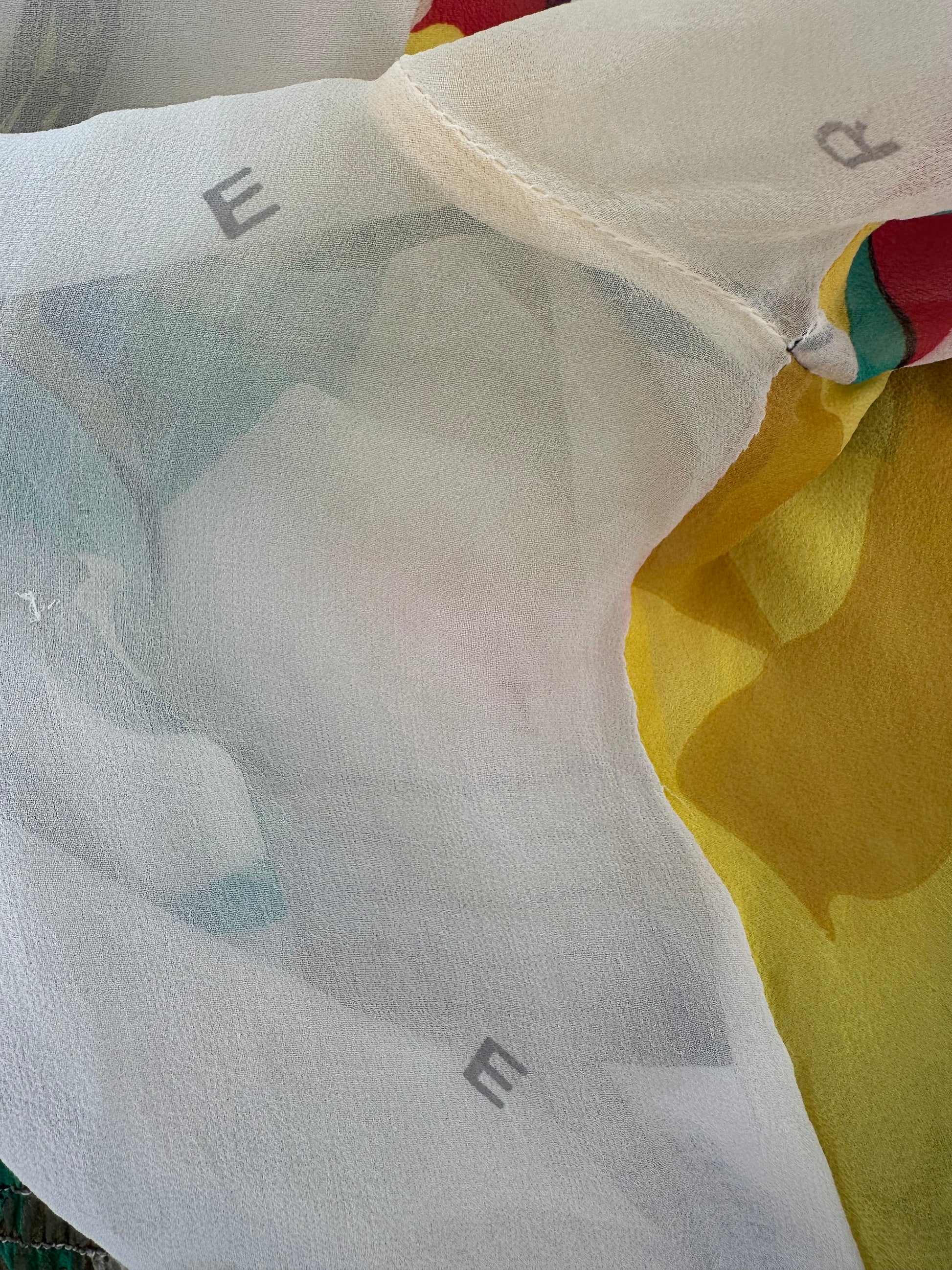 A lovely, silk smocked Iceberg blouse with an abstract print from S/S 2002. The size on the label is a 42 IT and it has been pictured here on a size 40 IT, 5 7". Please refer to the measurements below for more information. The blouse fastens up the front with poppers and there is also a tie. In fine condition but there is a snag as well as some staining in the armpit area. Fortunately due to the nature of the print this is not too obvious.