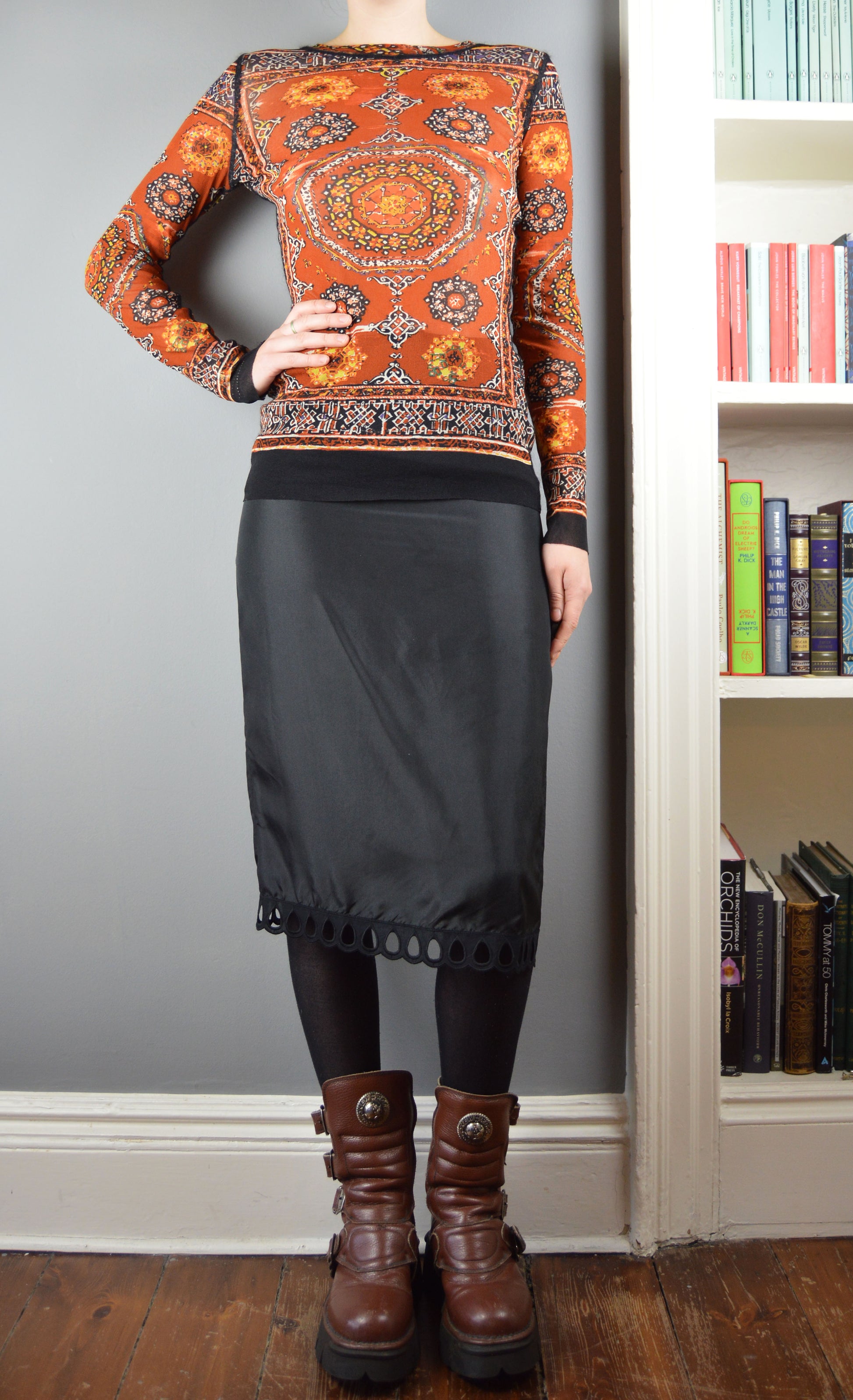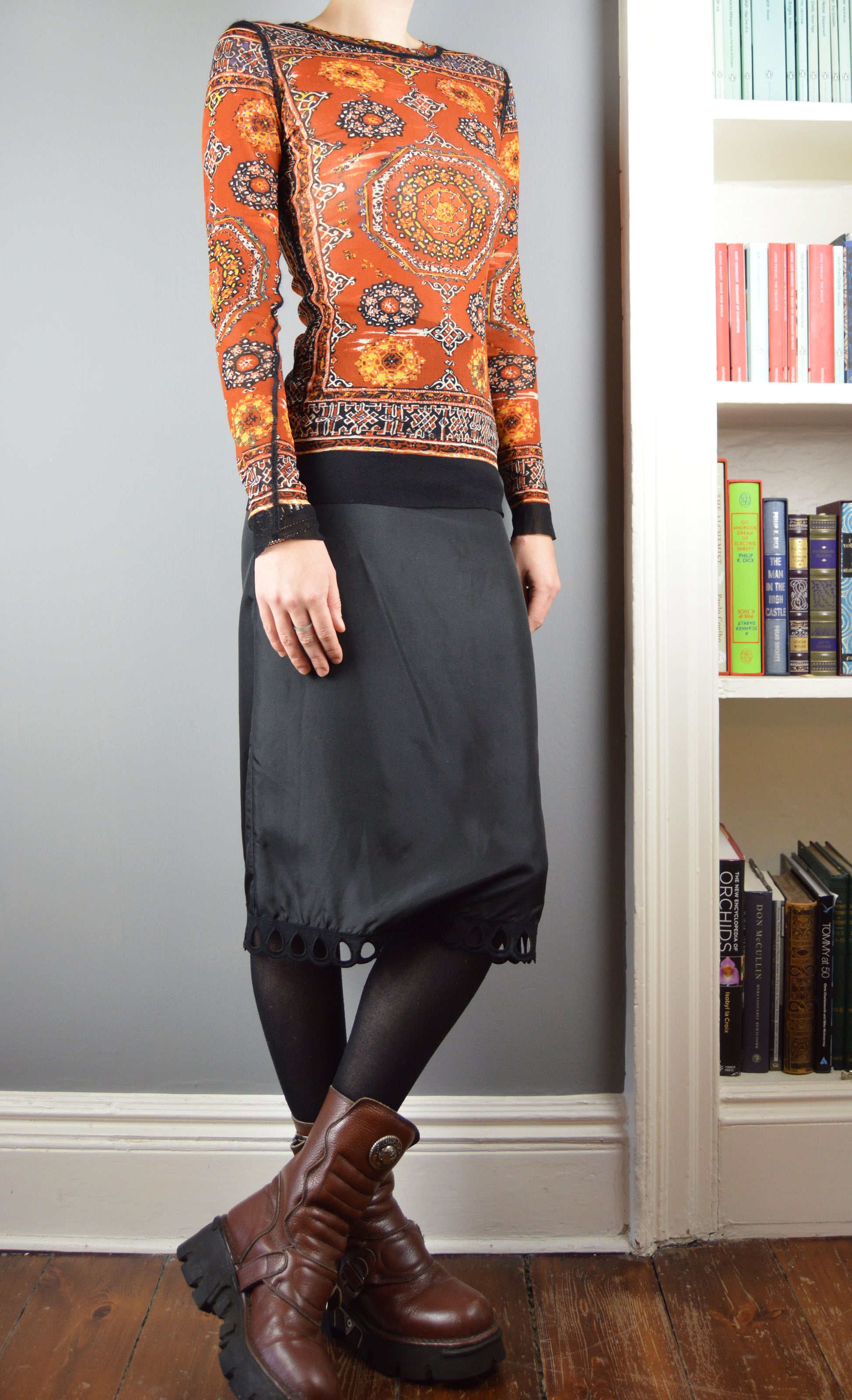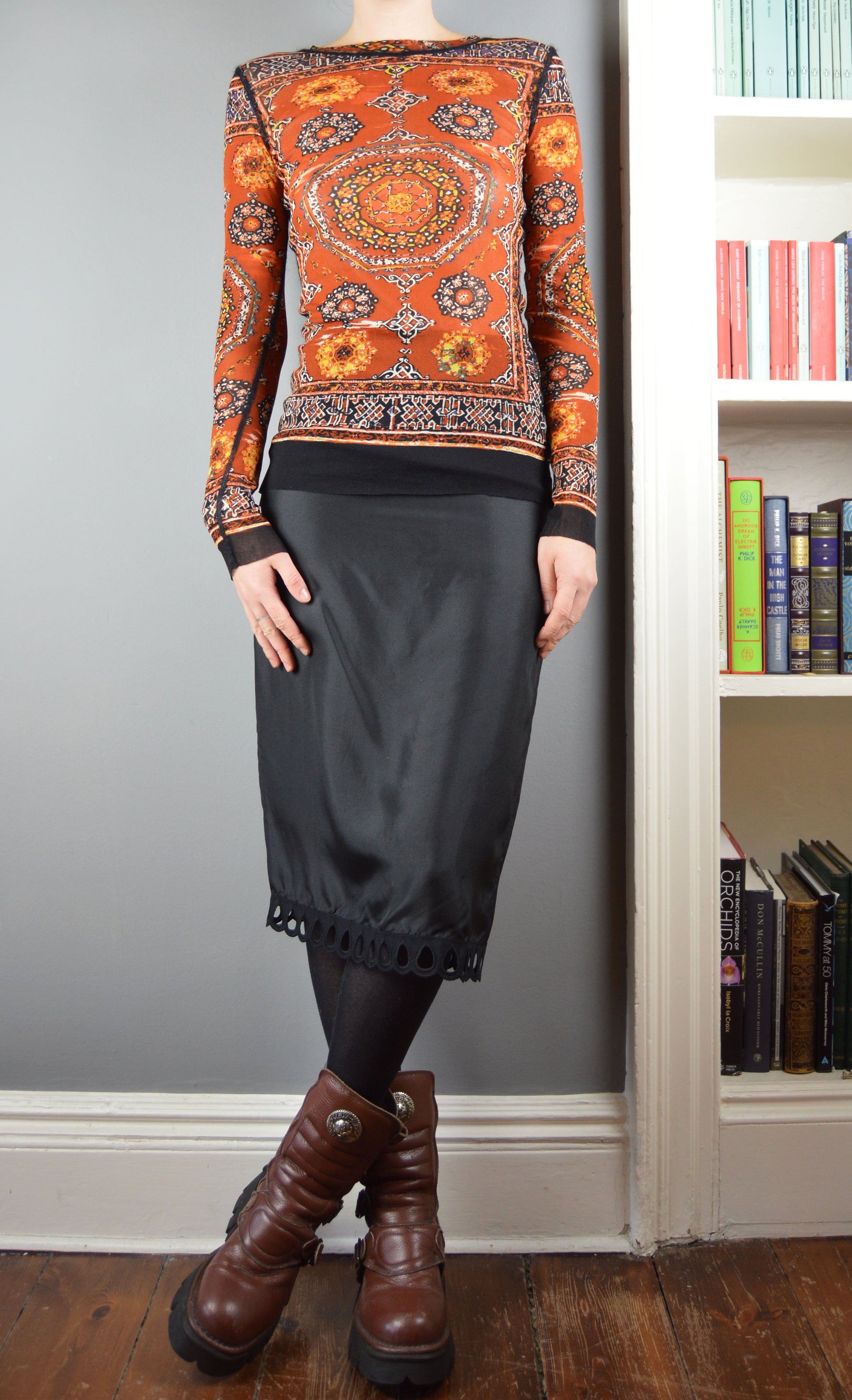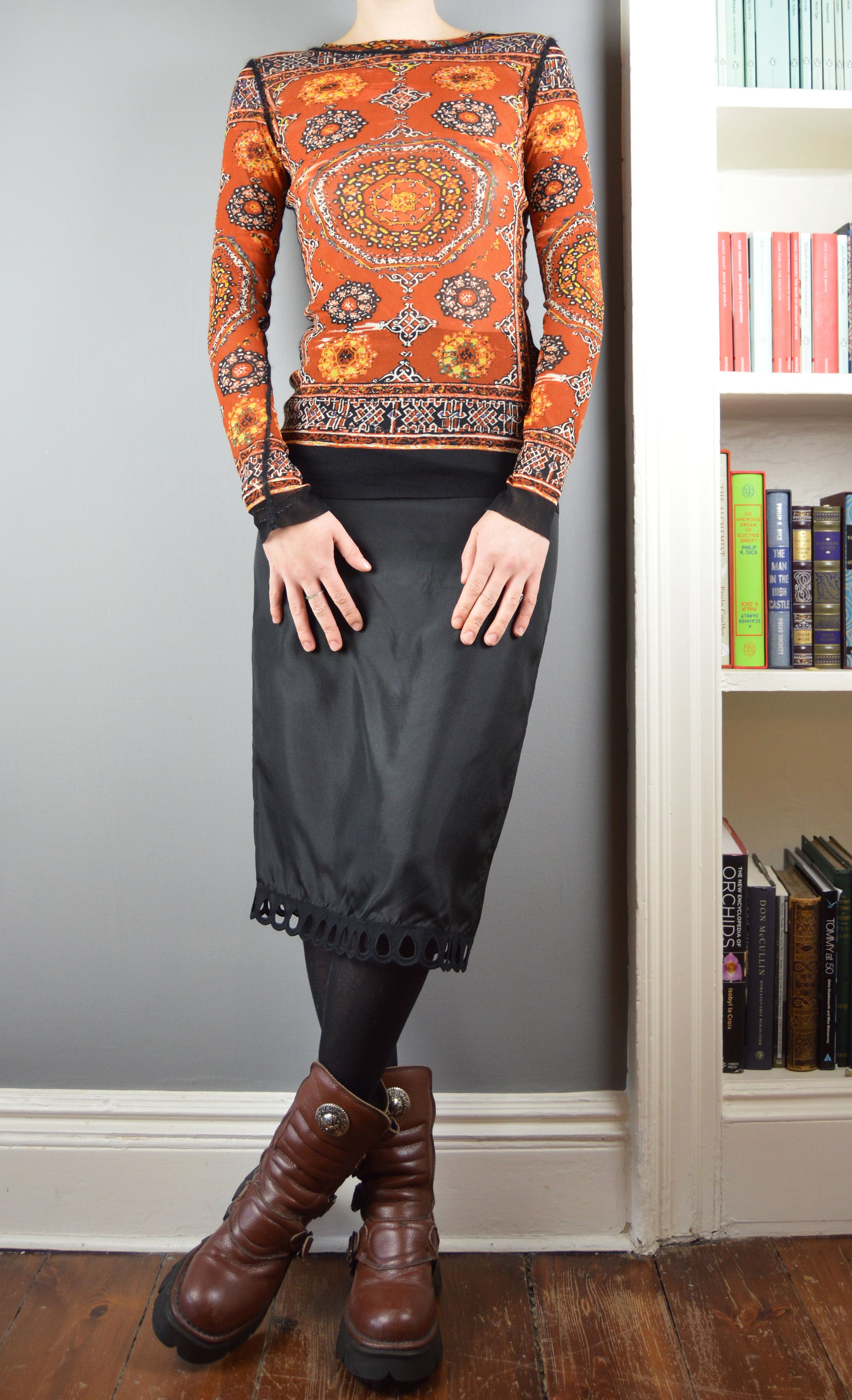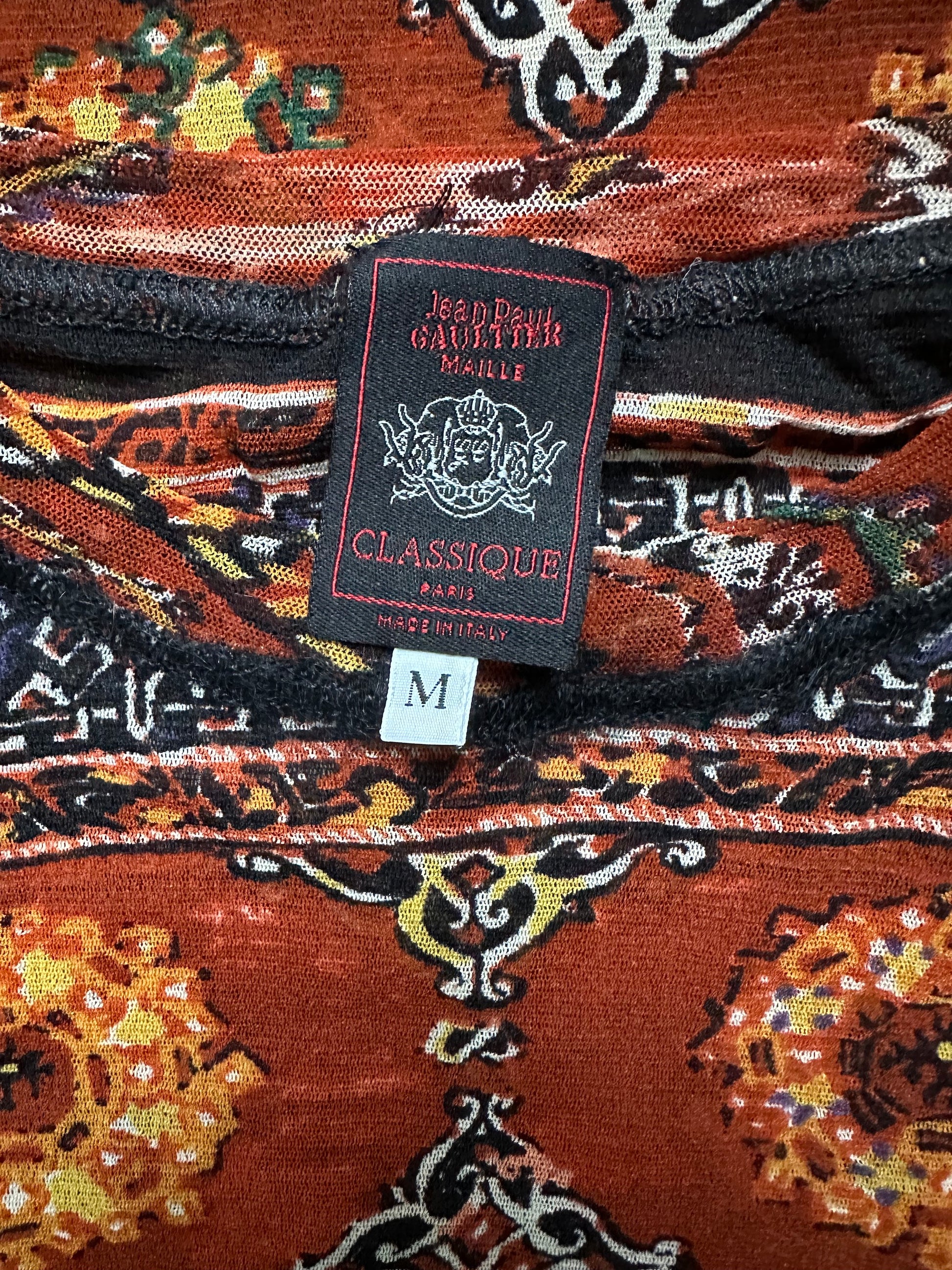 A wonderful, vintage Jean Paul Gaultier Classique mesh top in a stained glass window pattern. The size on the label is a M and it has been pictured here on a size 6/8 UK, 5 7". As with all Gaultier mesh tops, there is a lot of stretch to the item so it would fit a large variety of sizes. In perfect condition.