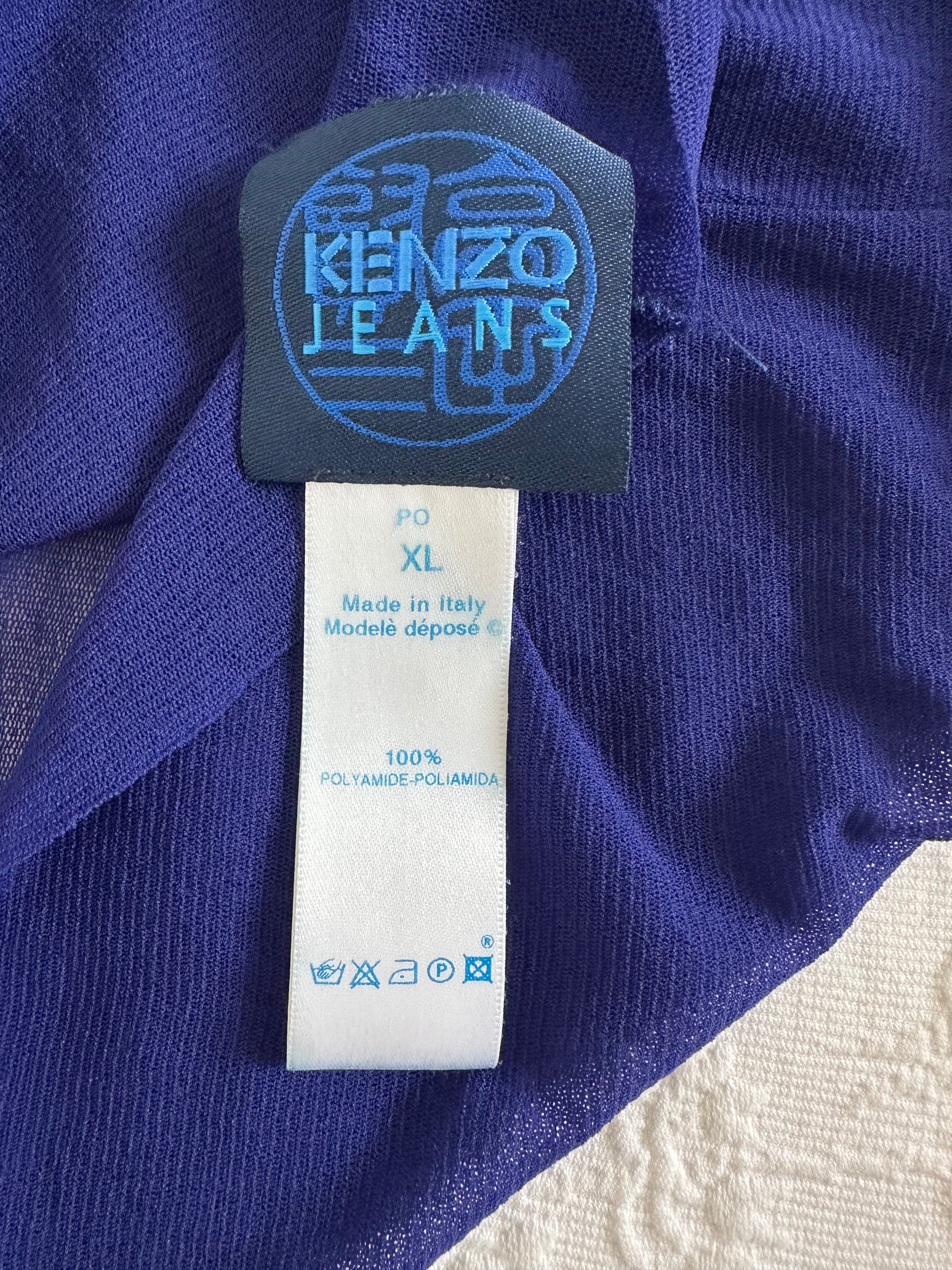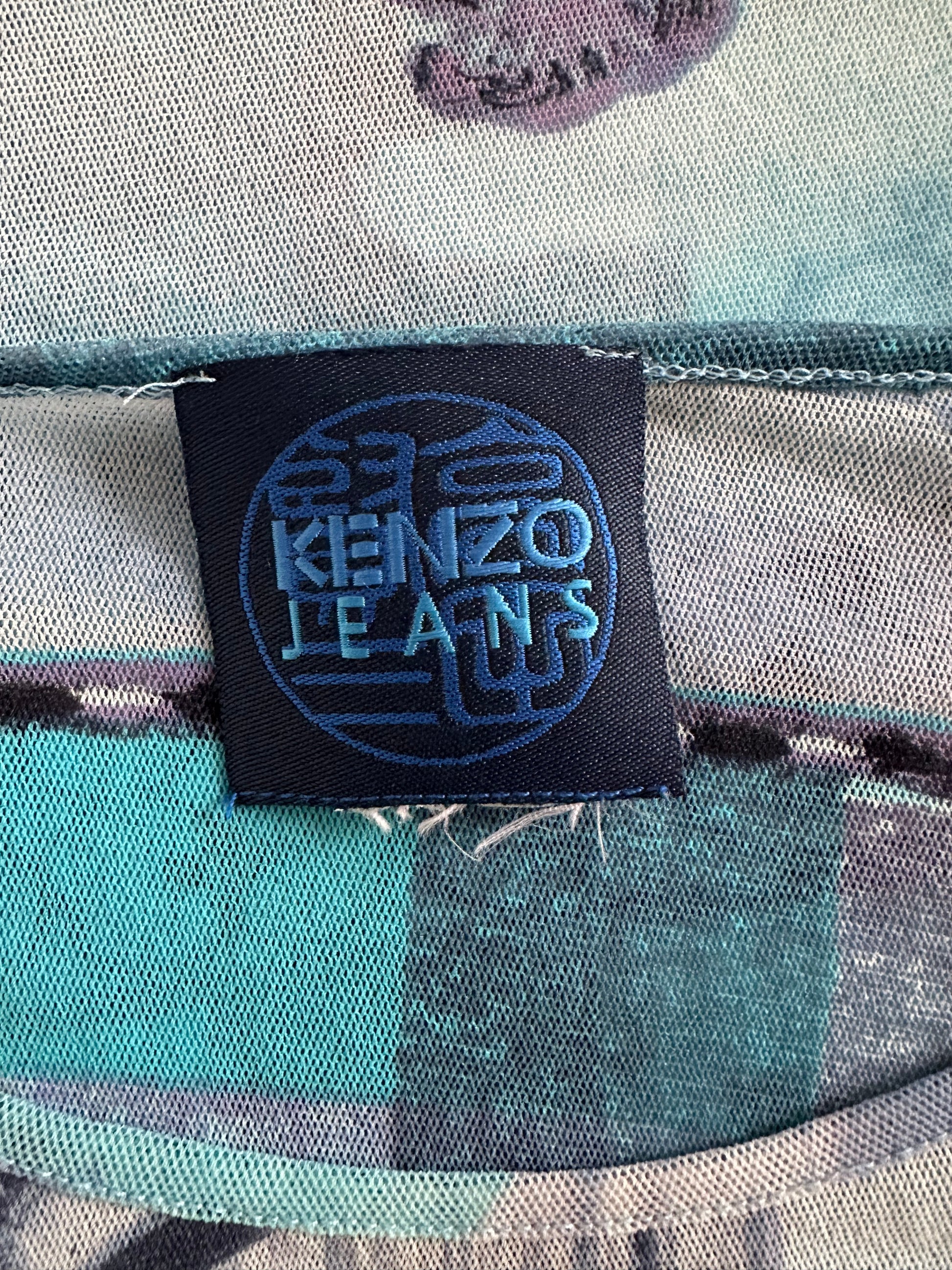 A lovely, vintage Kenzo Jeans mesh top set with a blue abstract print featuring an elephant. On the long sleeved top there is no size label but on the under top the size label states XL. The set has been pictured here on a size 40 IT, 5 7". As usual with mesh pieces they have a lot of stretch to them. In great condition apart from some slight wear to the under top, which has been pictured.