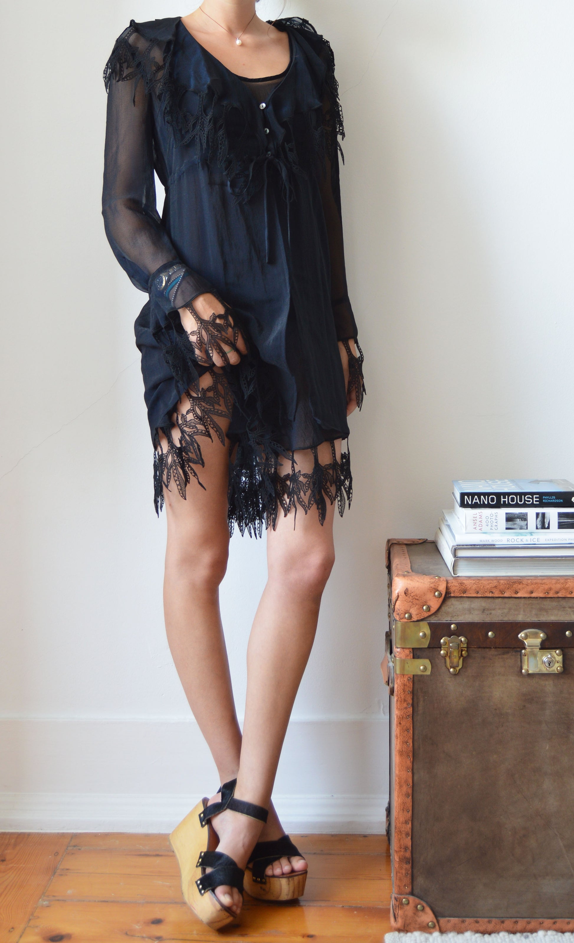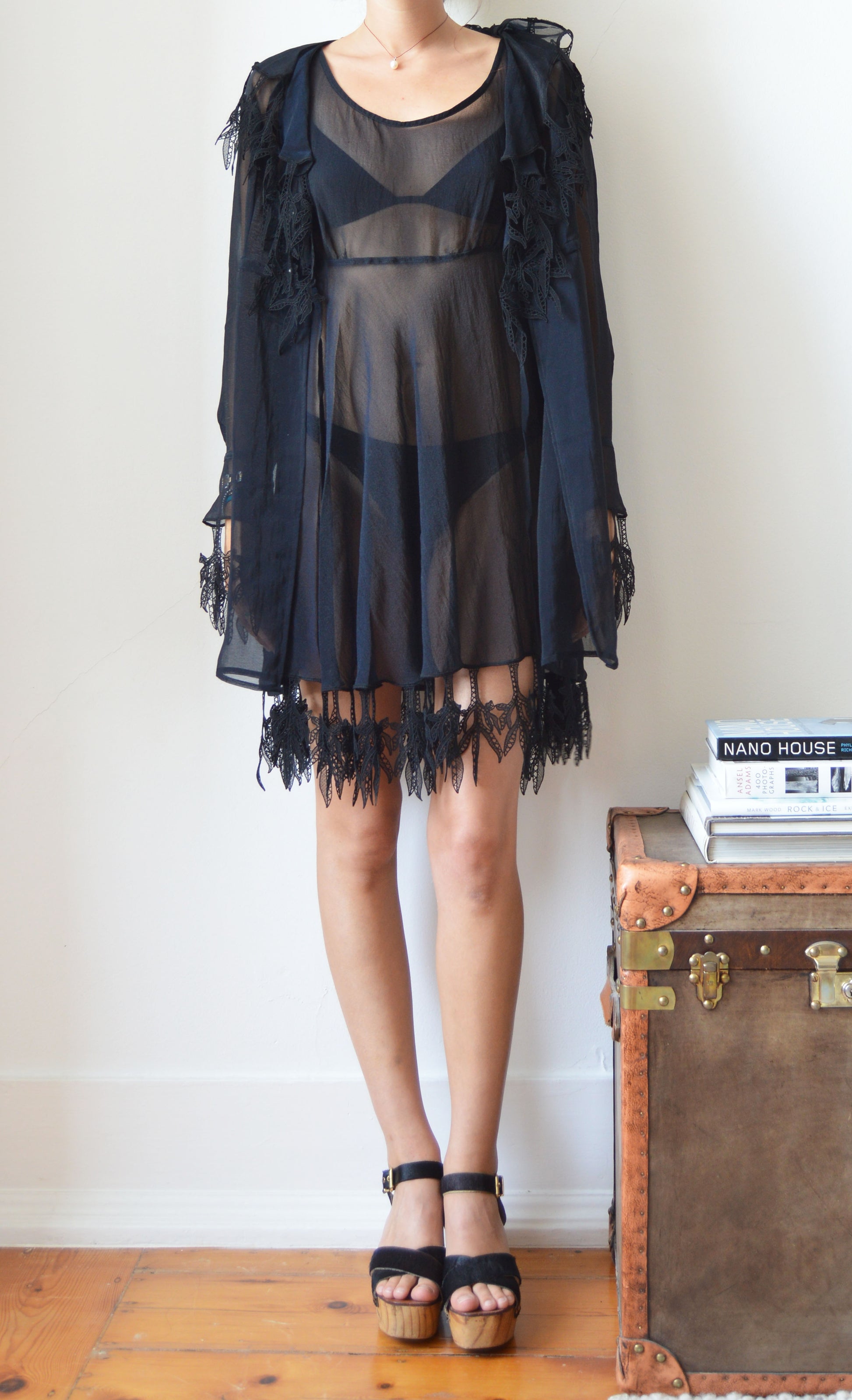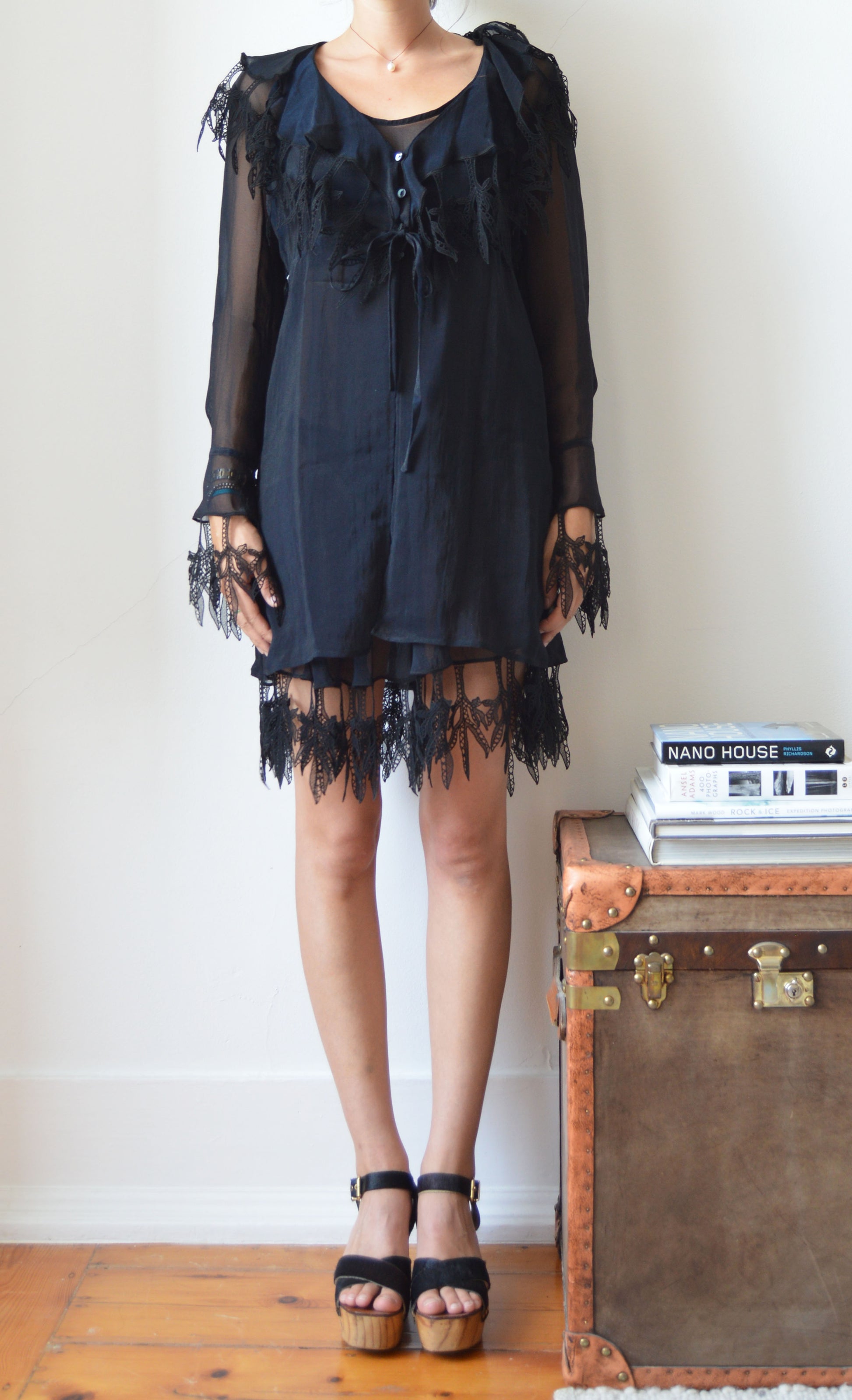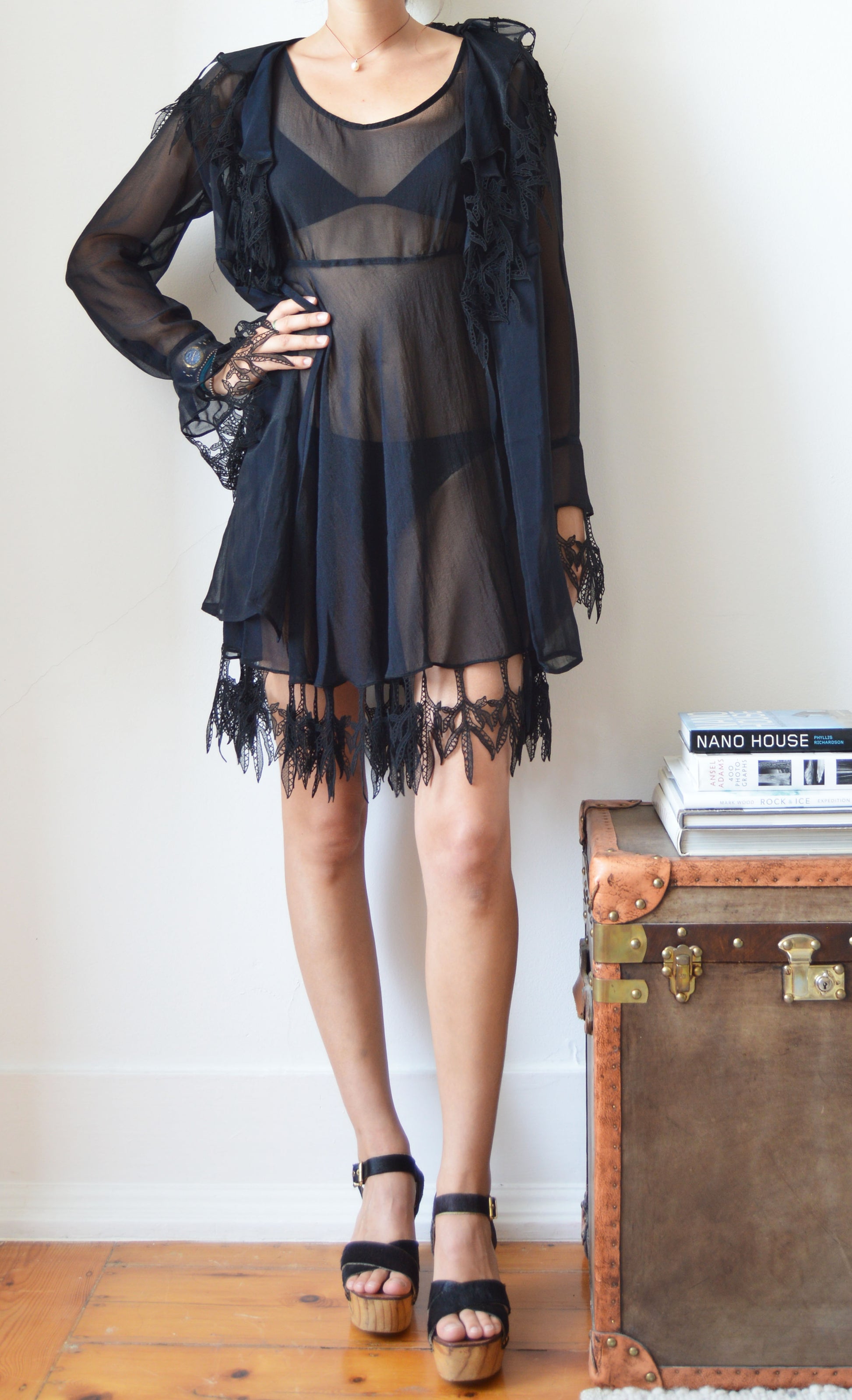 A gorgeous, vintage Lolita Lempicka set consisting of a sheer dress and a sheer jacket. The size on the label for the dress is a 38 FR (10 UK) and the jacket is a size 40 FR (12 UK), and it has been pictured here on a size 8 UK, 5 7". Please refer to the measurements below for further information. In great condition with no flaws and gorgeous lace detailing.