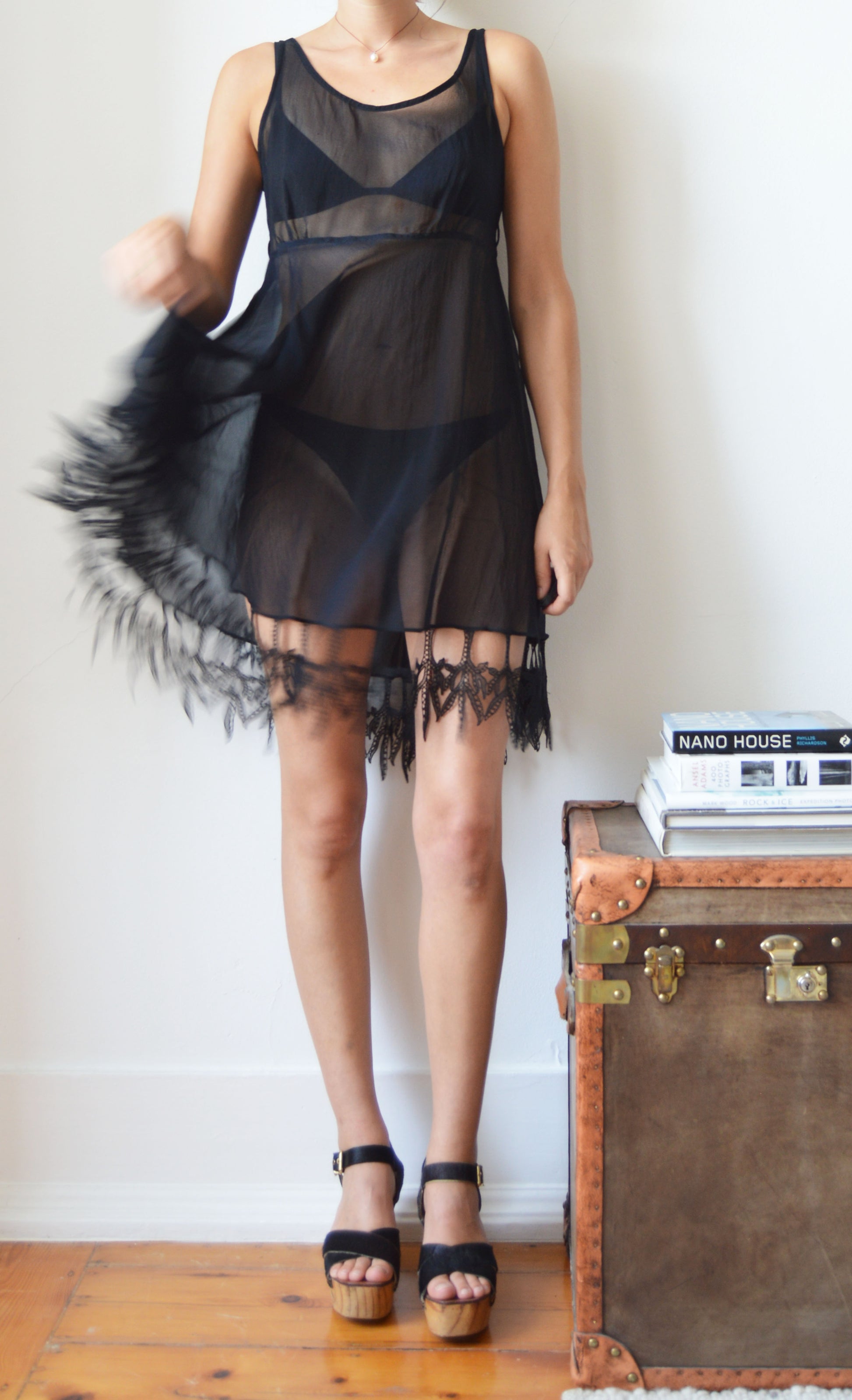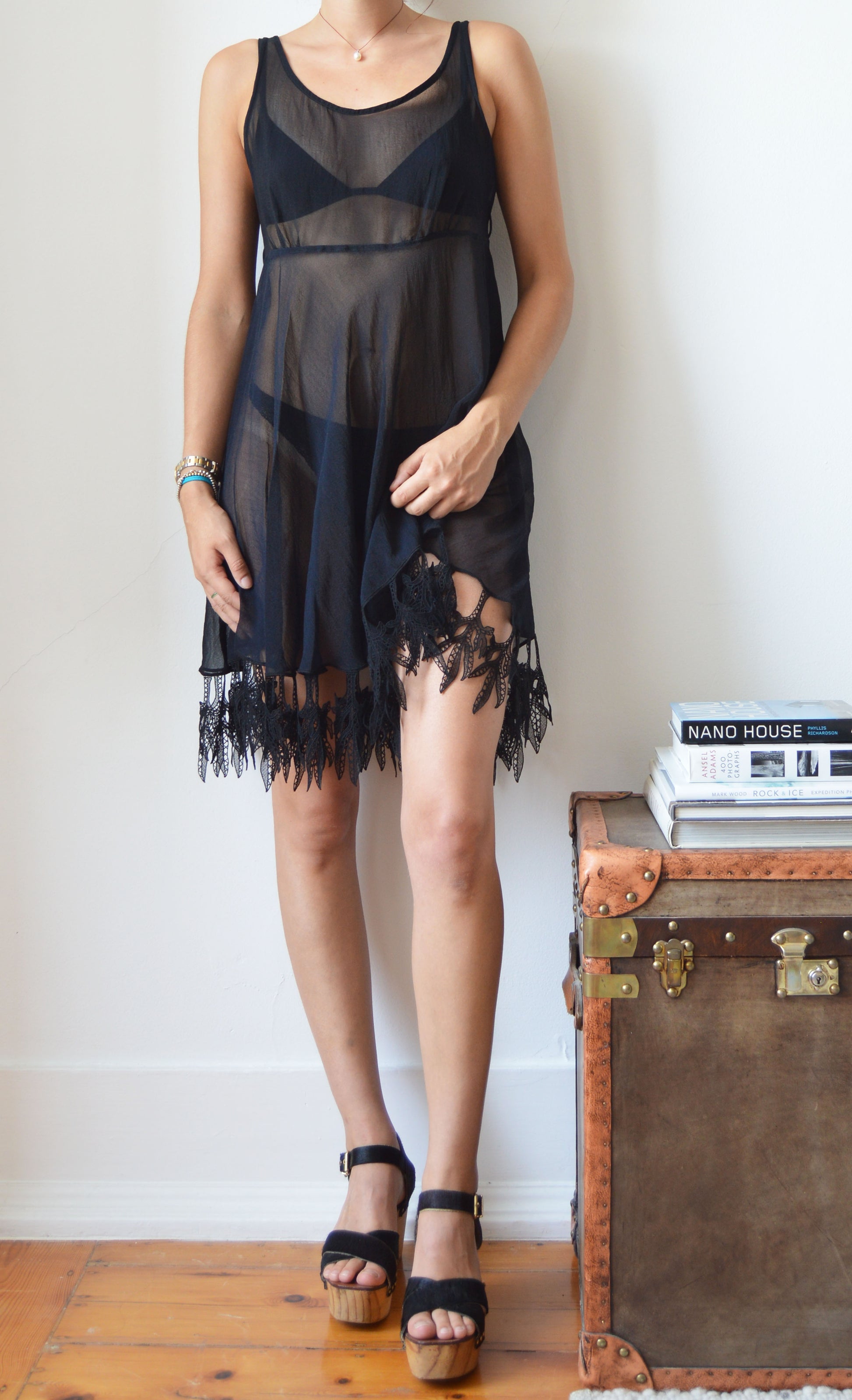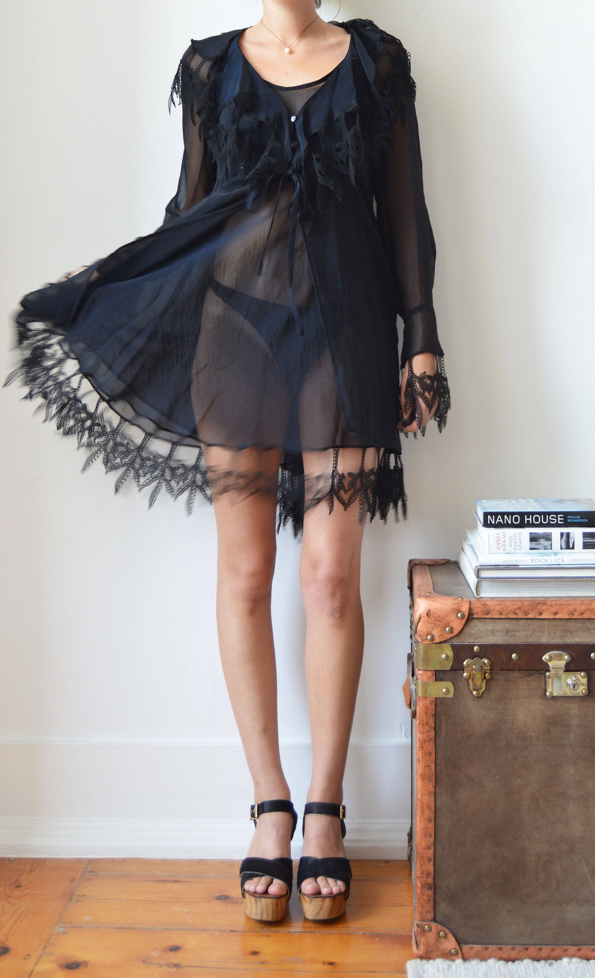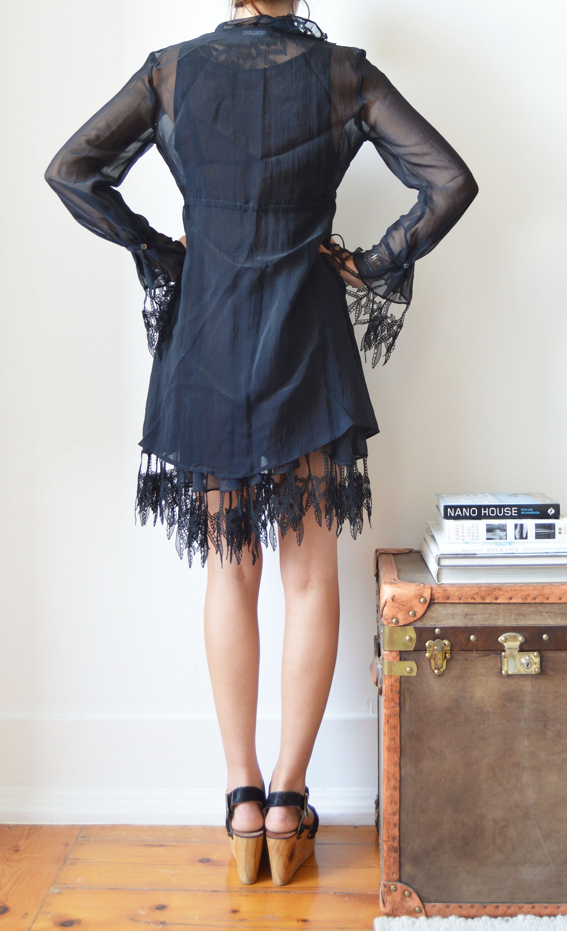 A gorgeous, vintage Lolita Lempicka set consisting of a sheer dress and a sheer jacket. The size on the label for the dress is a 38 FR (10 UK) and the jacket is a size 40 FR (12 UK), and it has been pictured here on a size 8 UK, 5 7". Please refer to the measurements below for further information. In great condition with no flaws and gorgeous lace detailing.