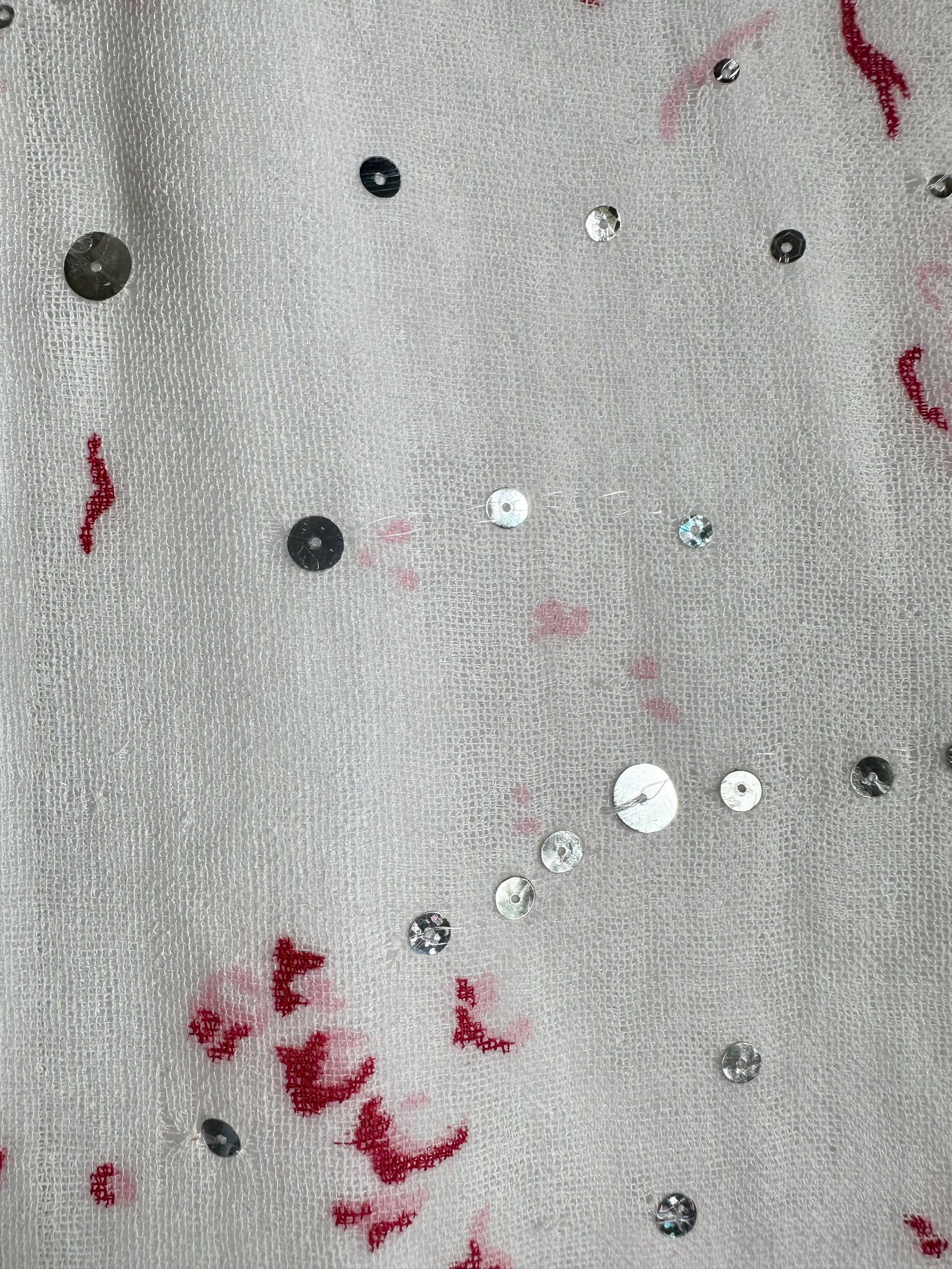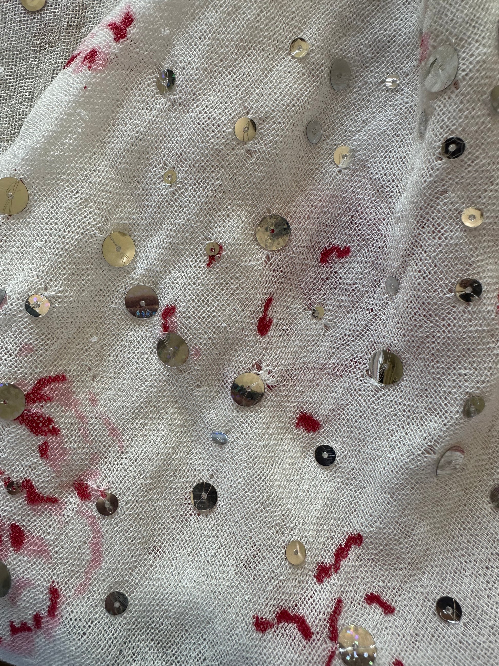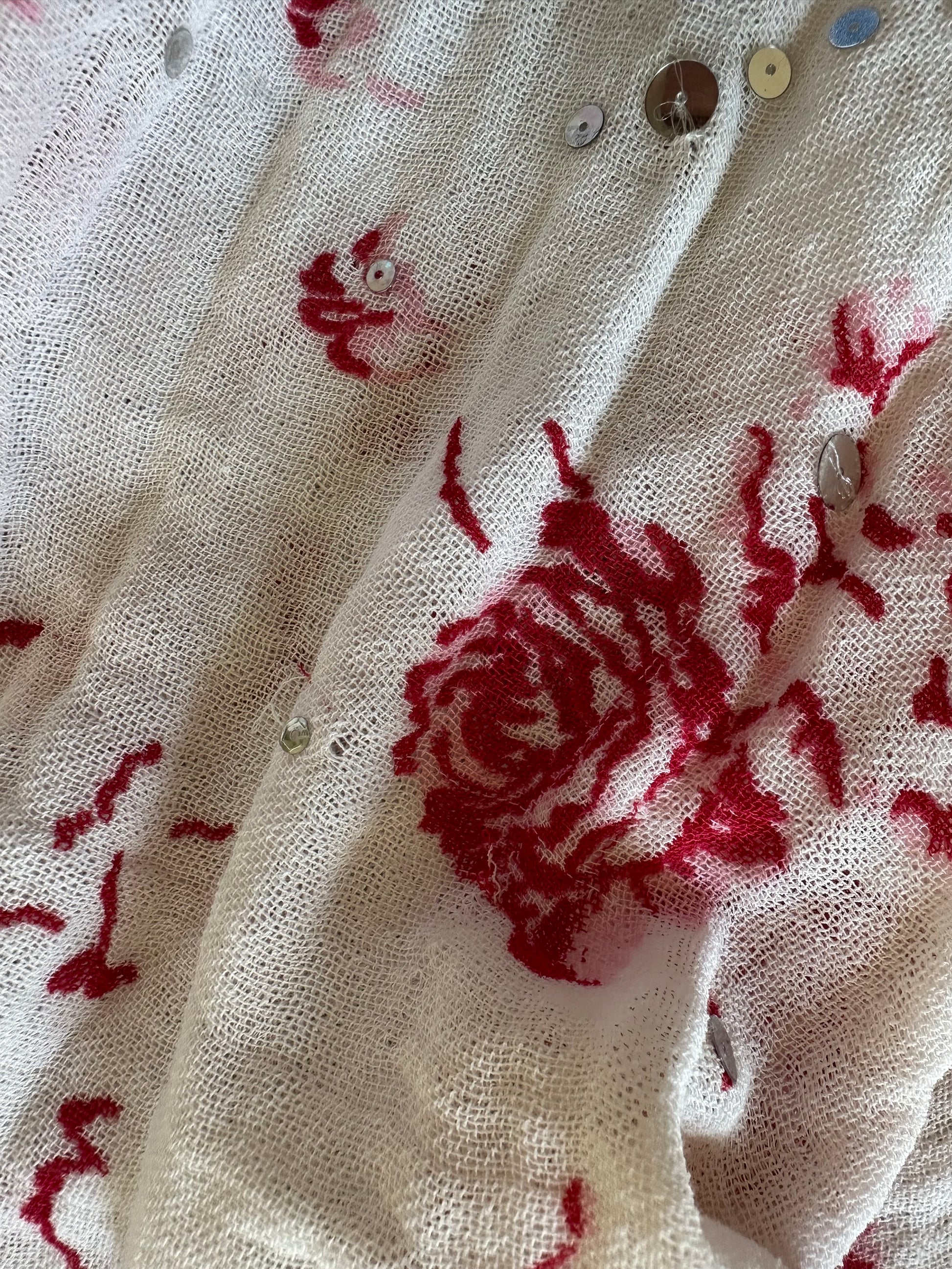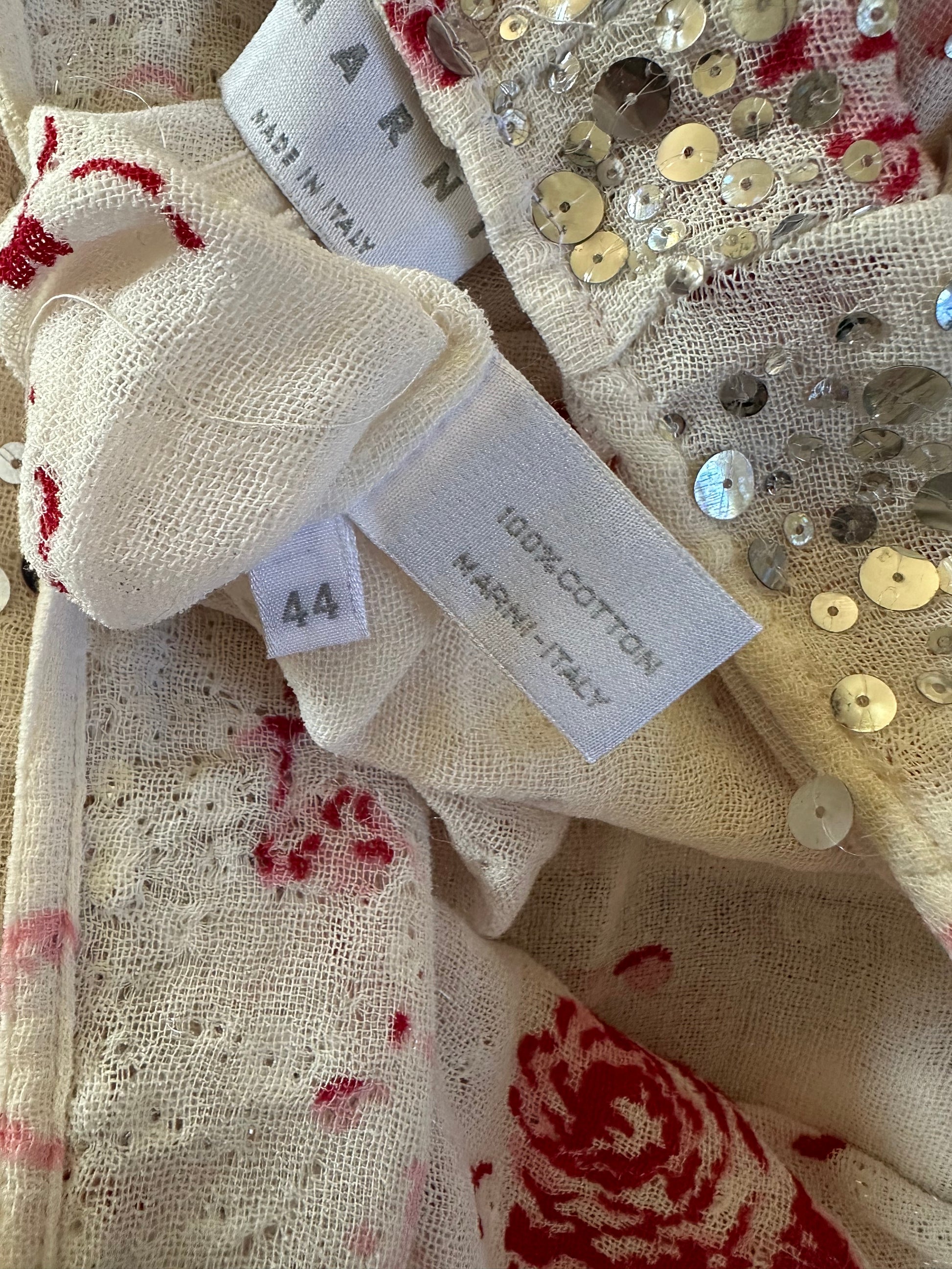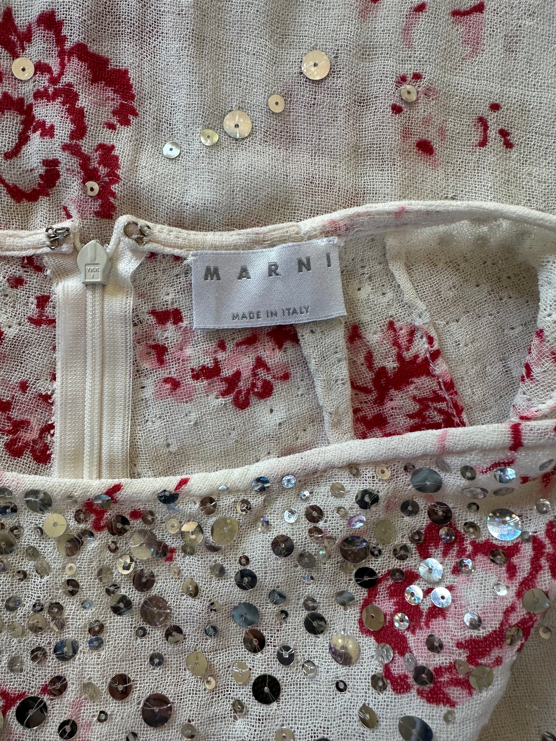 A gorgeous, vintage Marni cotton floral skirt adorned with sequins. Size 44 IT on the label but fits smaller. It has been pictured here on a size 40 IT, and fits well. The skirt is not in the best condition due to the delicate nature of the fabric. A couple of pictures have been added to show this but it occurs throughout the skirt. There is a slip included, which has a mark on it.