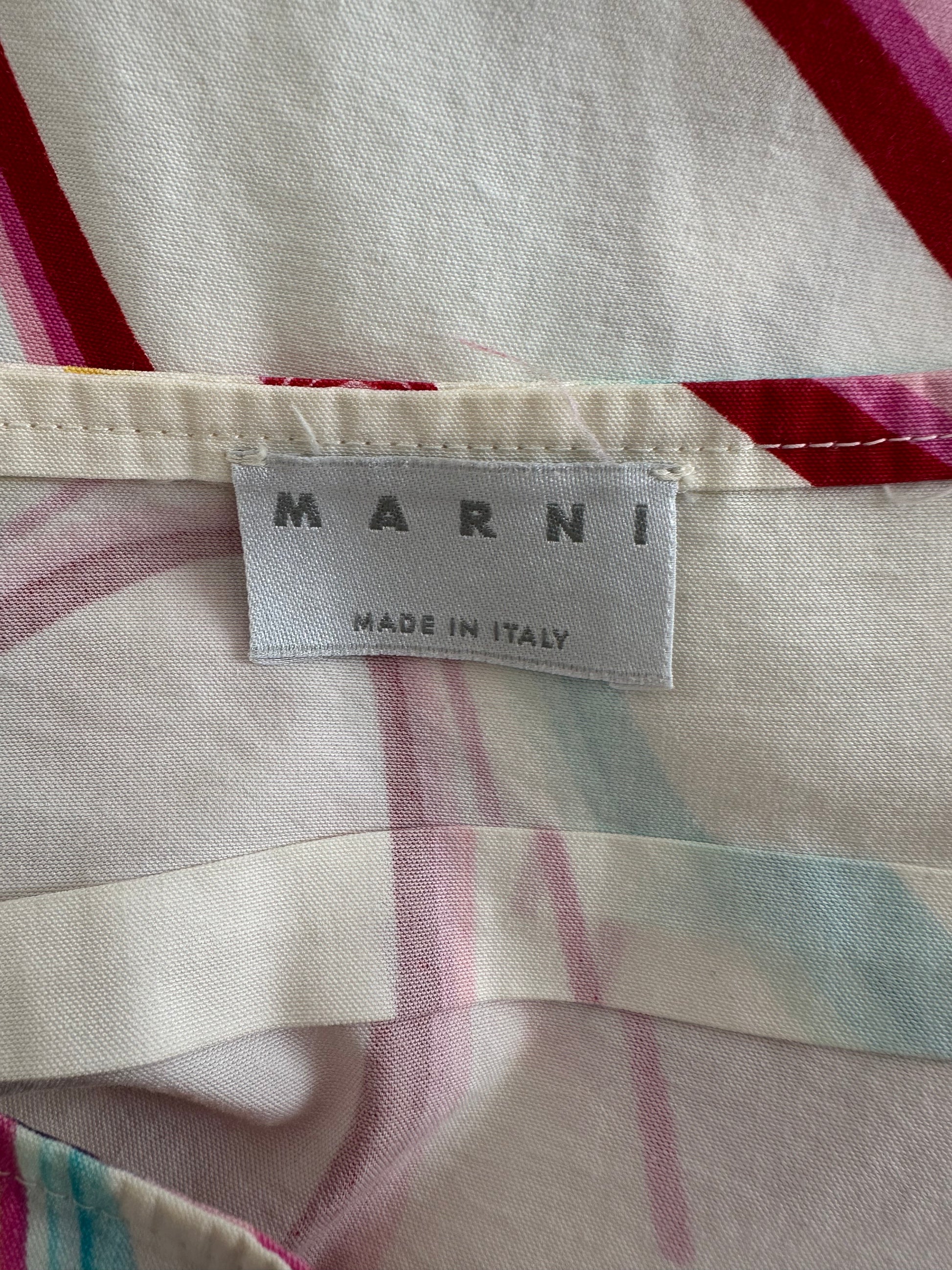 A fun statement skirt from Marni S/S 2000 featuring a print that was seen on Carrie Bradshaw in Sex & The City. The skirt also has detachable floral appliqués (which are missing various pieces, so please refer to the images). There are button fastenings on the back, where these appliqués can also be placed. There is also a tiny of bit of loose stitching at the bottom end of the zip. The skirt is a size 40 IT and it has been pictured here on a size 40 IT, 5 7".