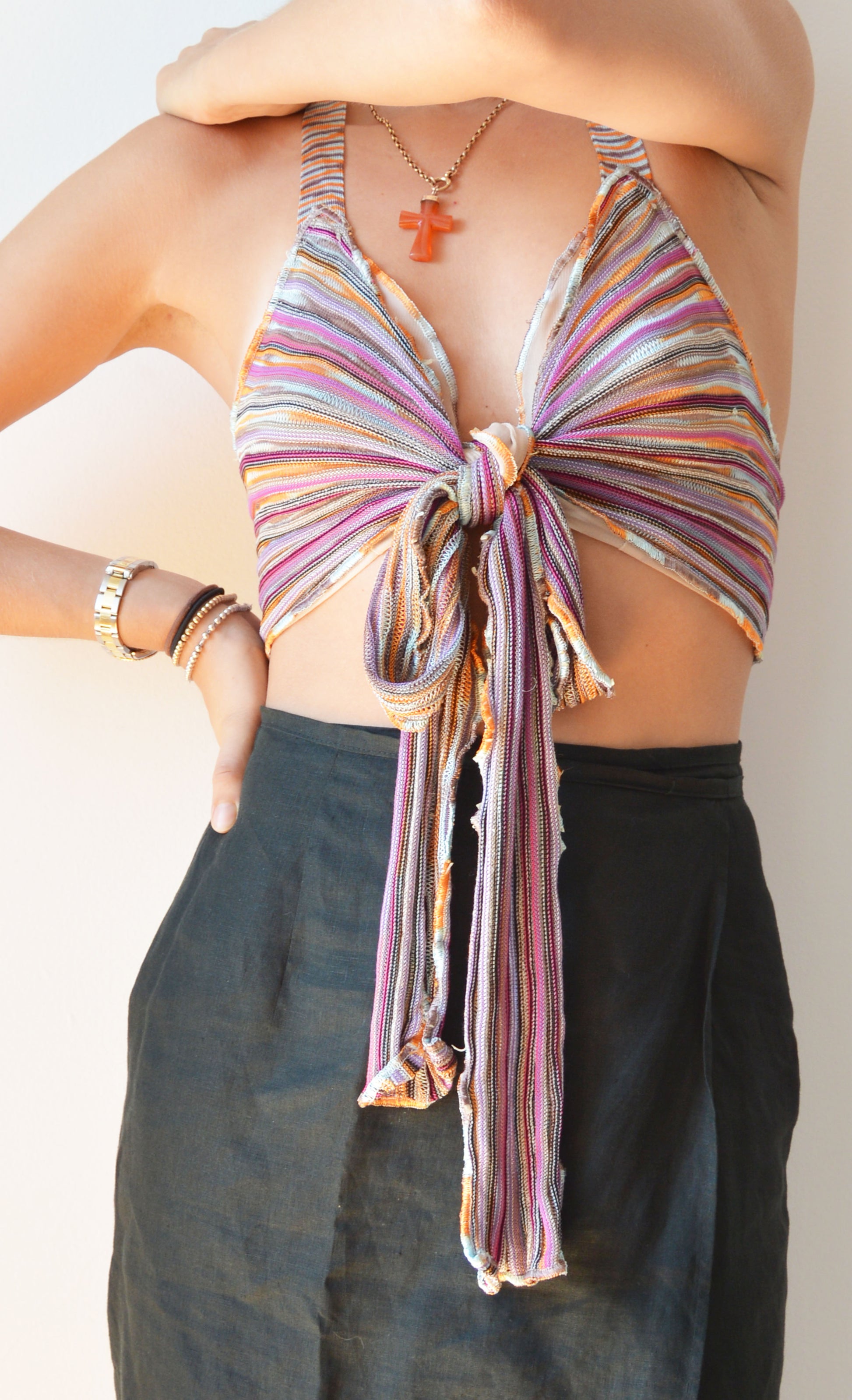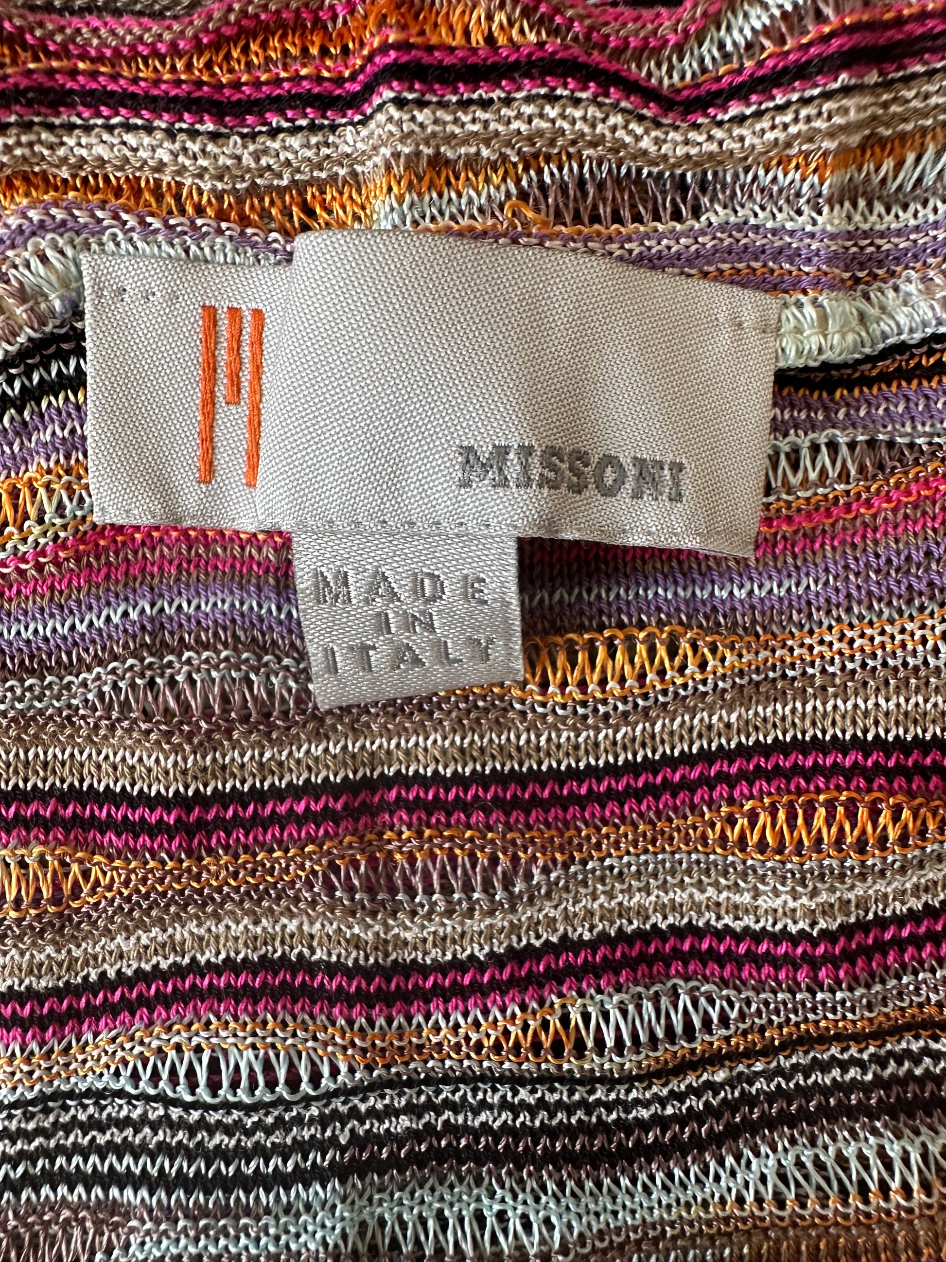 A lovely, little Missoni crop top which is tied at the front. The item has no size label and has been seen here on an IT 40, 5 7" and fits well but due to the nature of the piece it would fit a variety of sizes. In good condition, with just a small snag to the fabric.