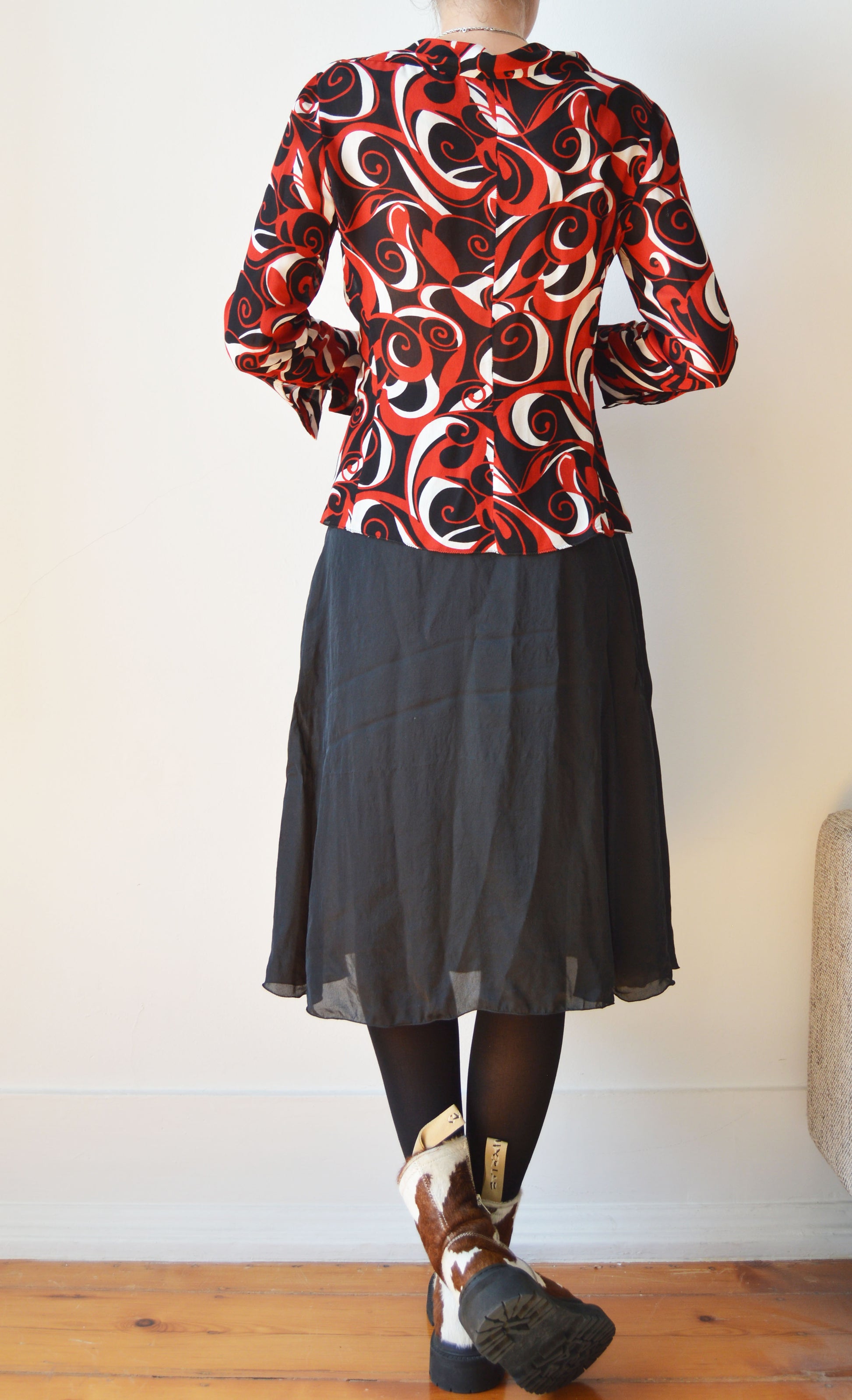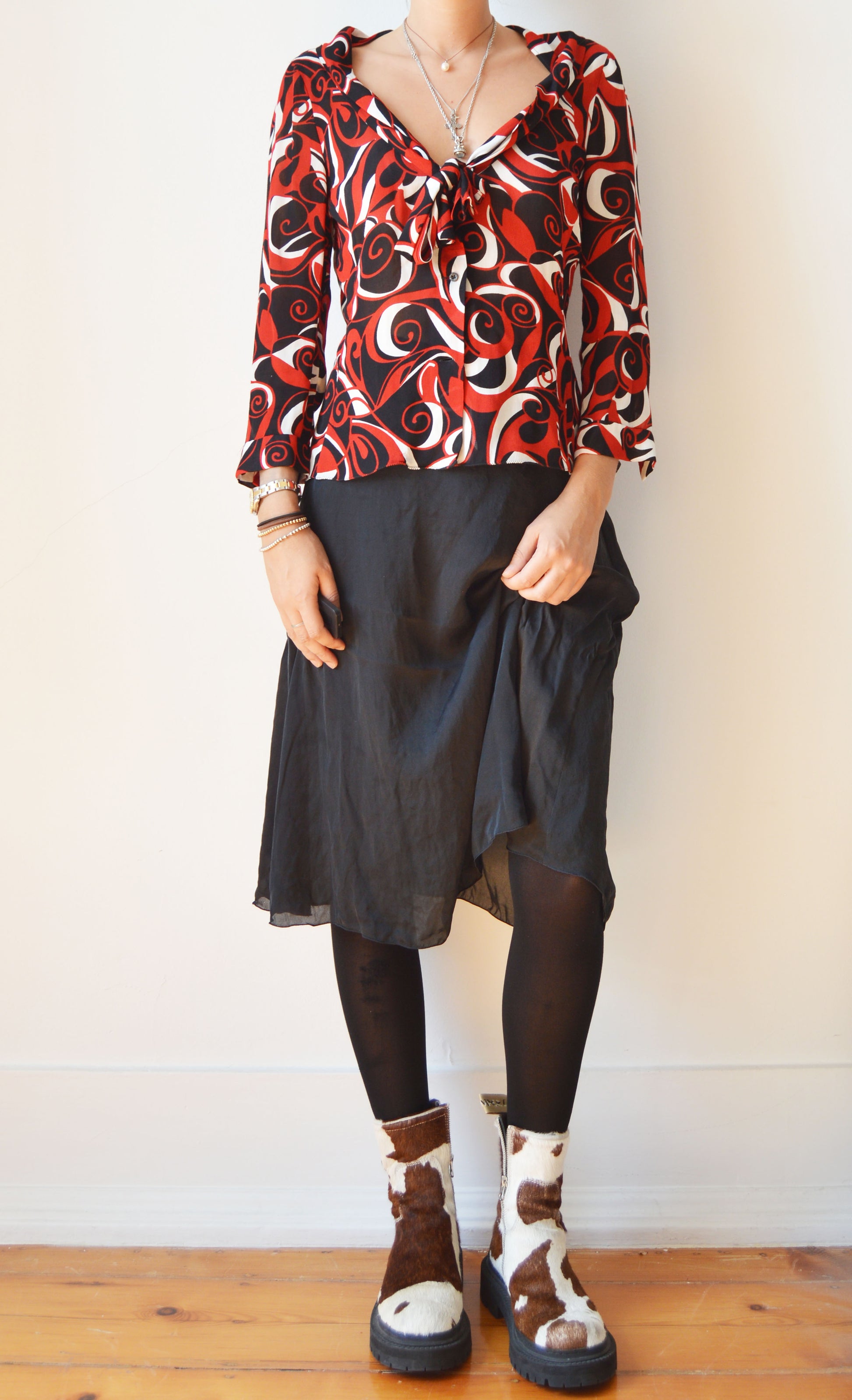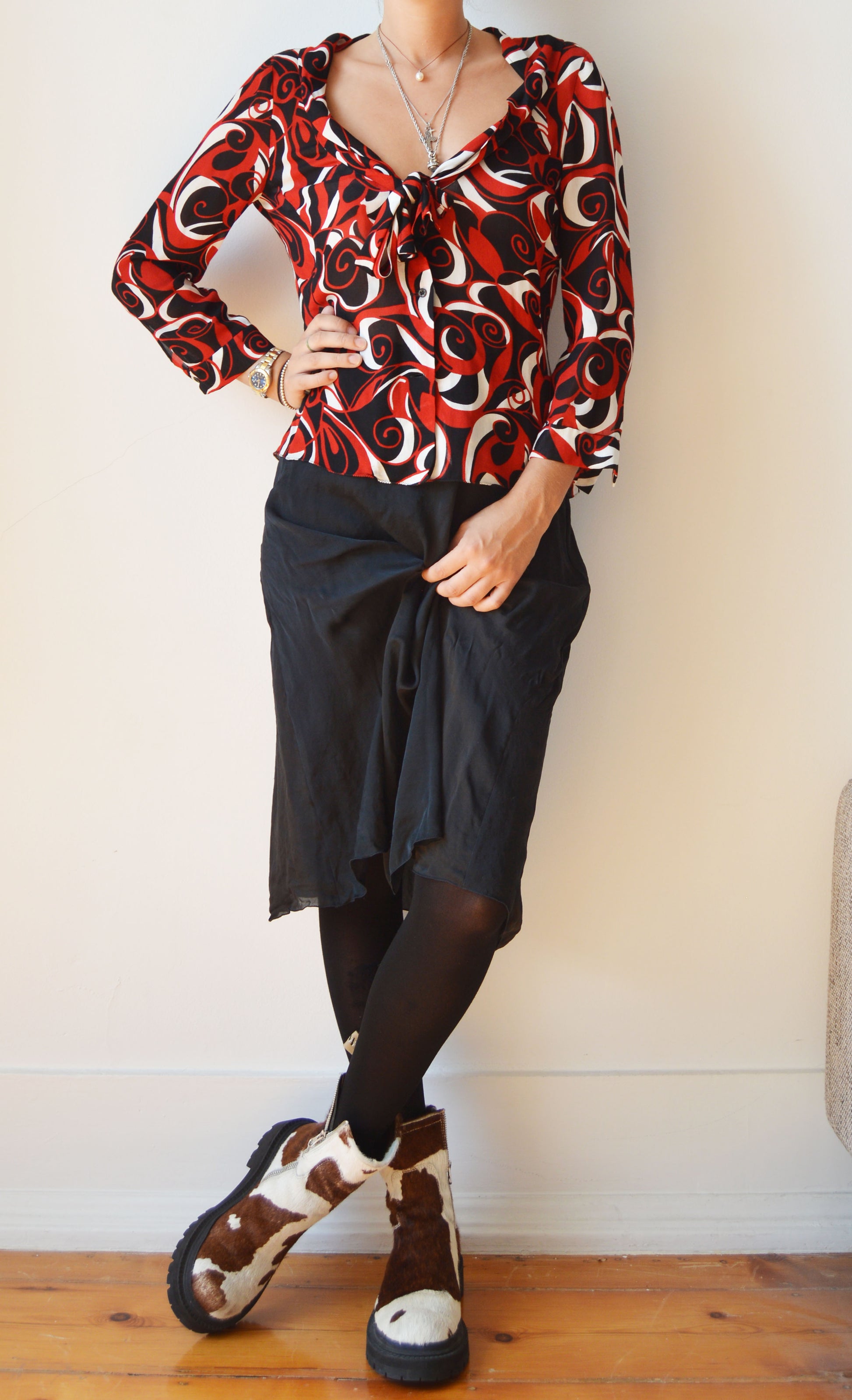 A lovely, vintage Miu Miu blouse from F/W 2000. The same pattern was seen on the runway. The item is an IT 44 (12 UK) and it has been pictured here on a size 6/8 UK, 5 7". In great condition, with no flaws. Please refer to the measurements below for more information.