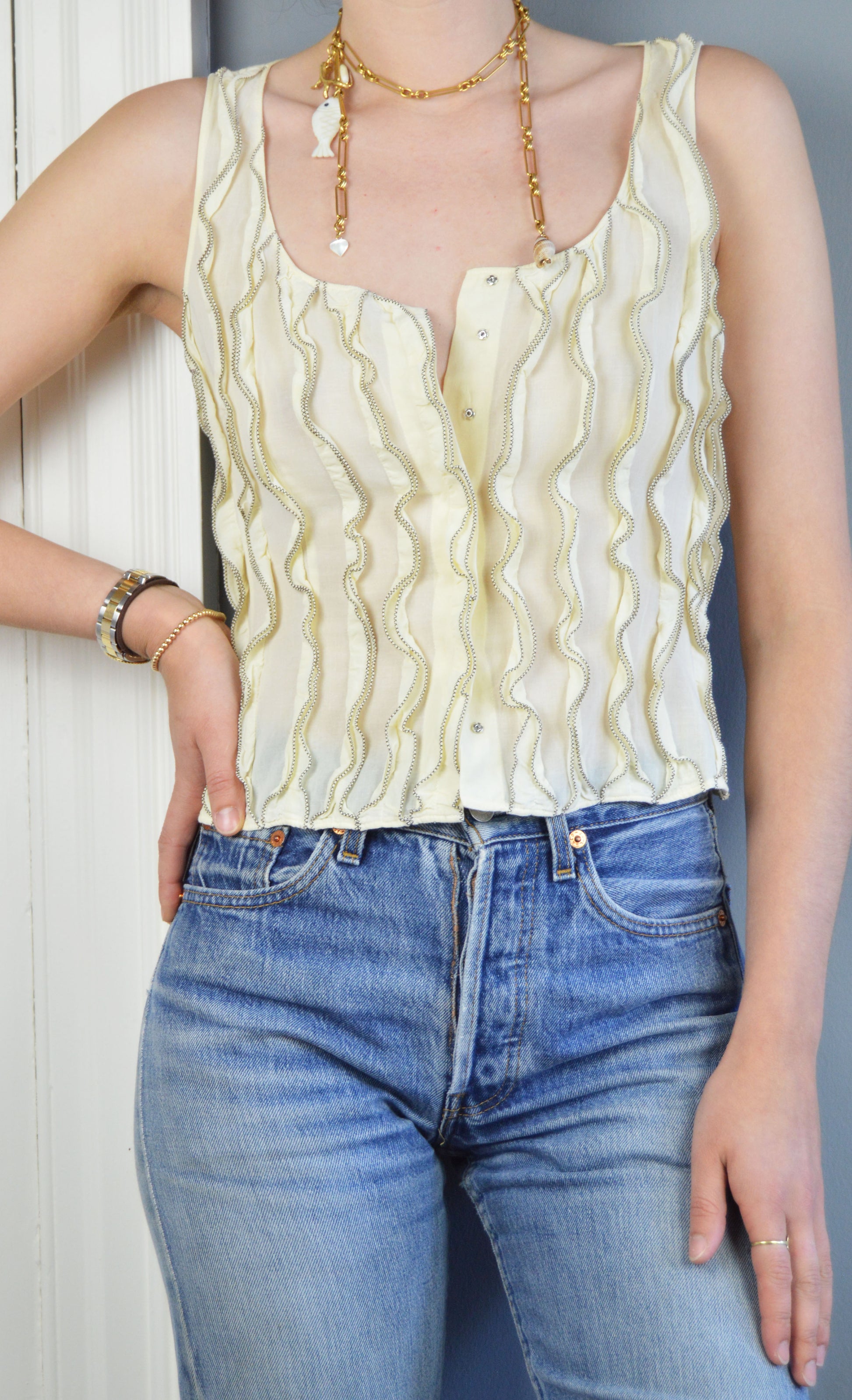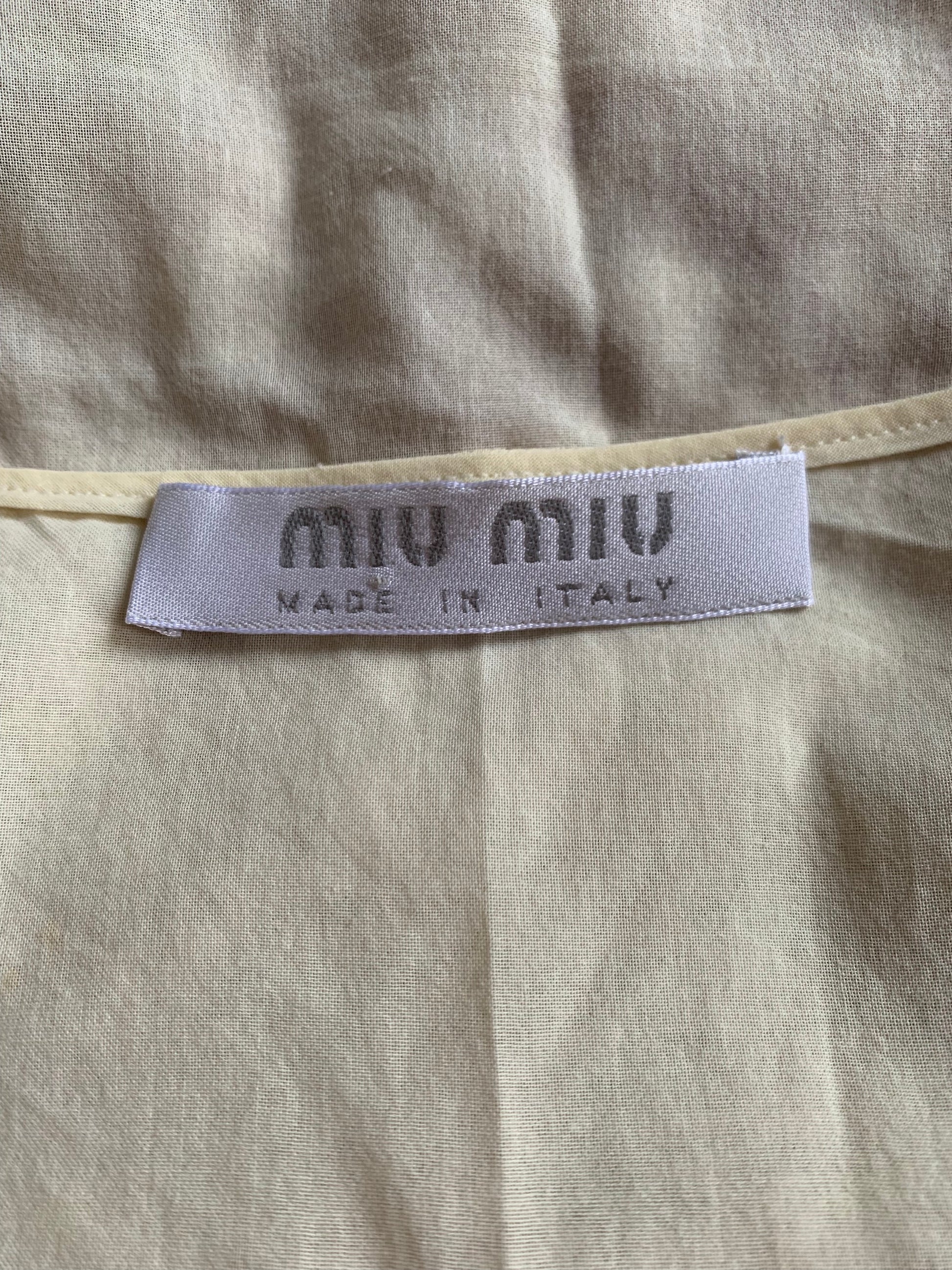 An absolutely stunning vintage Miu Miu top with frilled detail on the front. The item is very fitted and the size on the label is a 40 IT (8 UK) but it would best fit a size 6/8 UK as it is very tight fitting with no stretch. The item has been pictured here on a size 6/8 UK, 5 7". Please refer to the measurements below for more information. The top is 100% cotton and is in great condition apart from a little snag on the collar (please refer to the last picture), which can't be seen when worn.