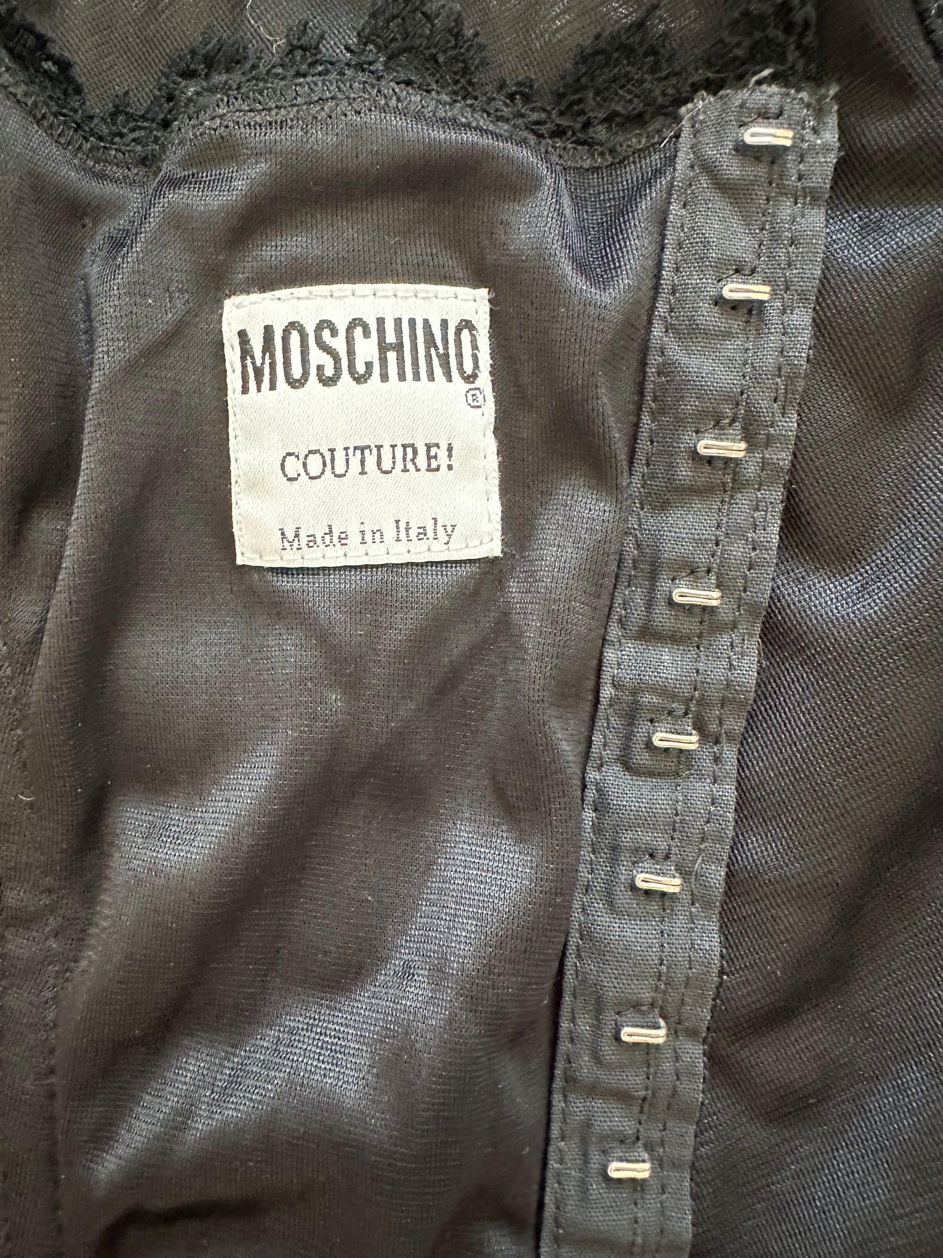 A lovely, little vintage Moschino Couture black top fastened up the back with hooks. The piece is in good condition, but the material has lost some of its strength due to age. It has been pictured here on a size 40 IT, 5 7" and the size on the label is a 42 IT. Please refer to the measurements below for more information.