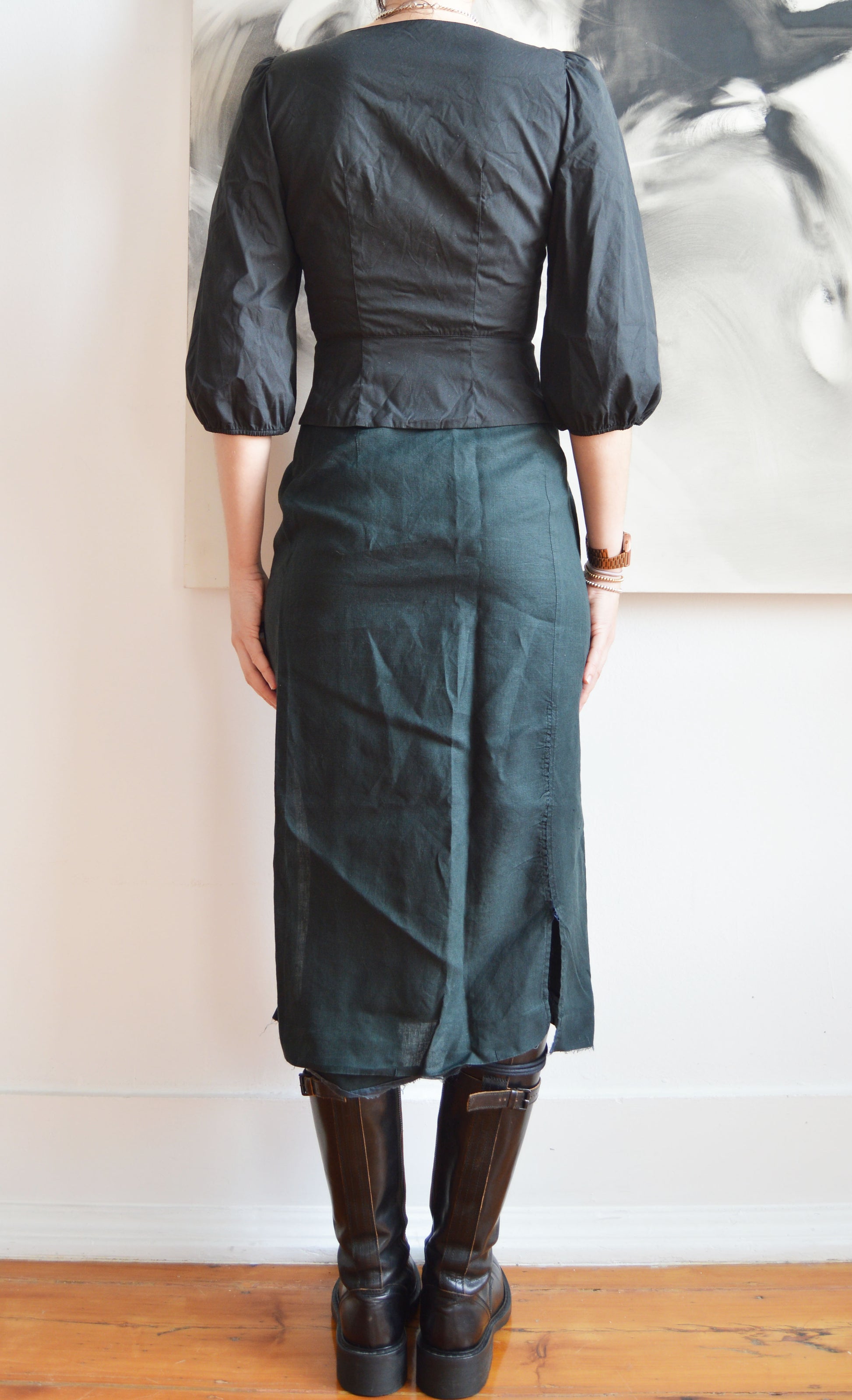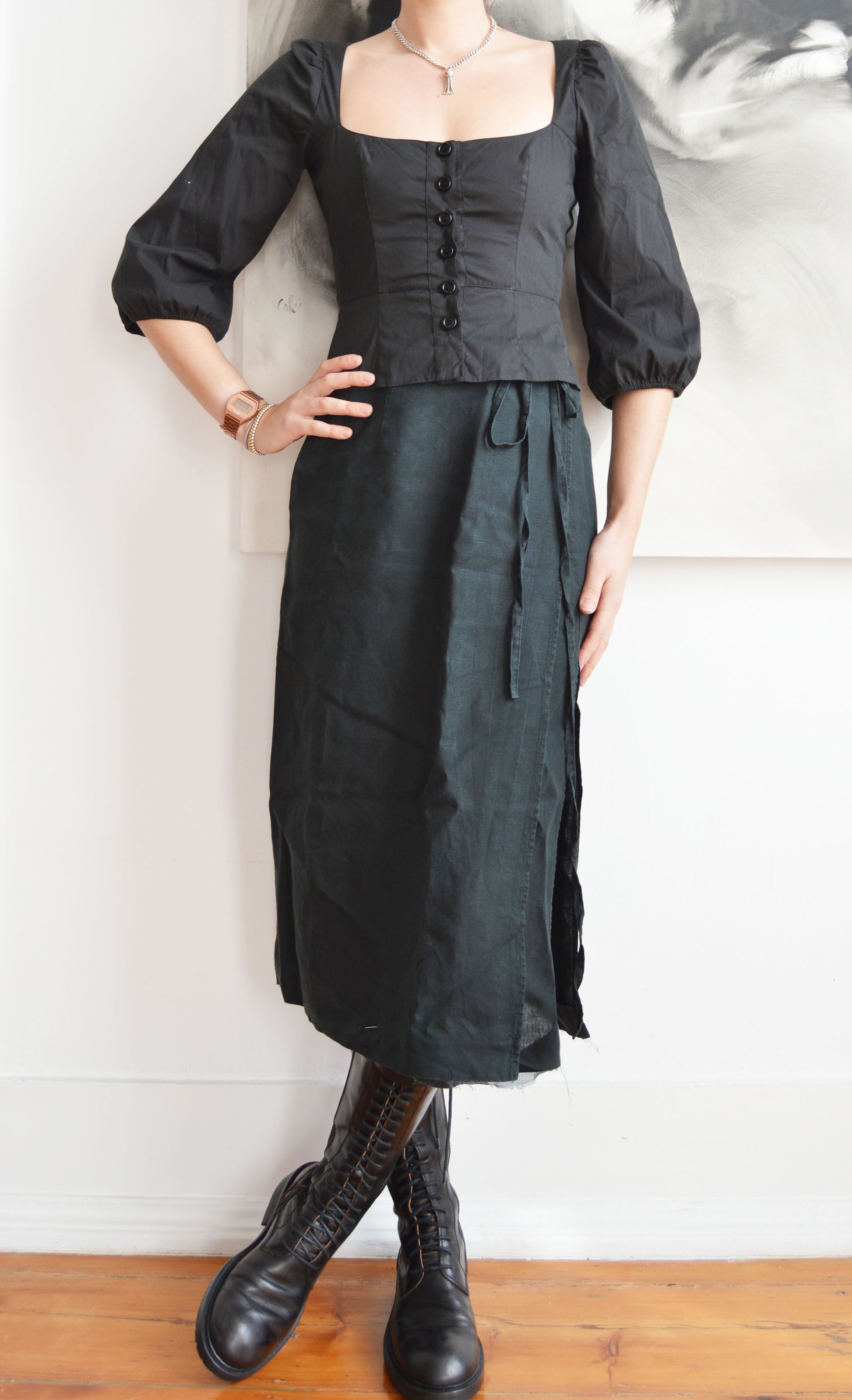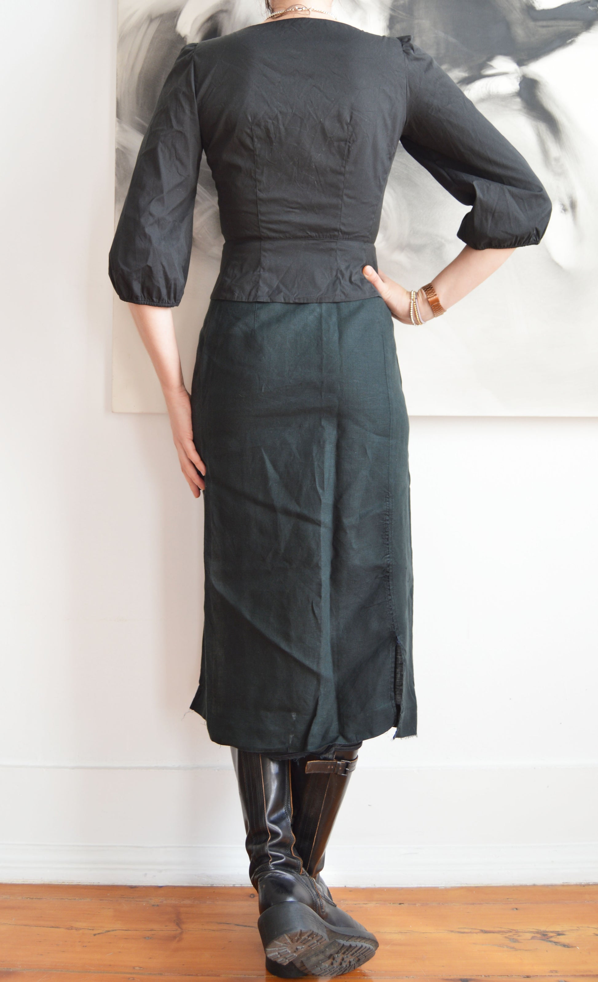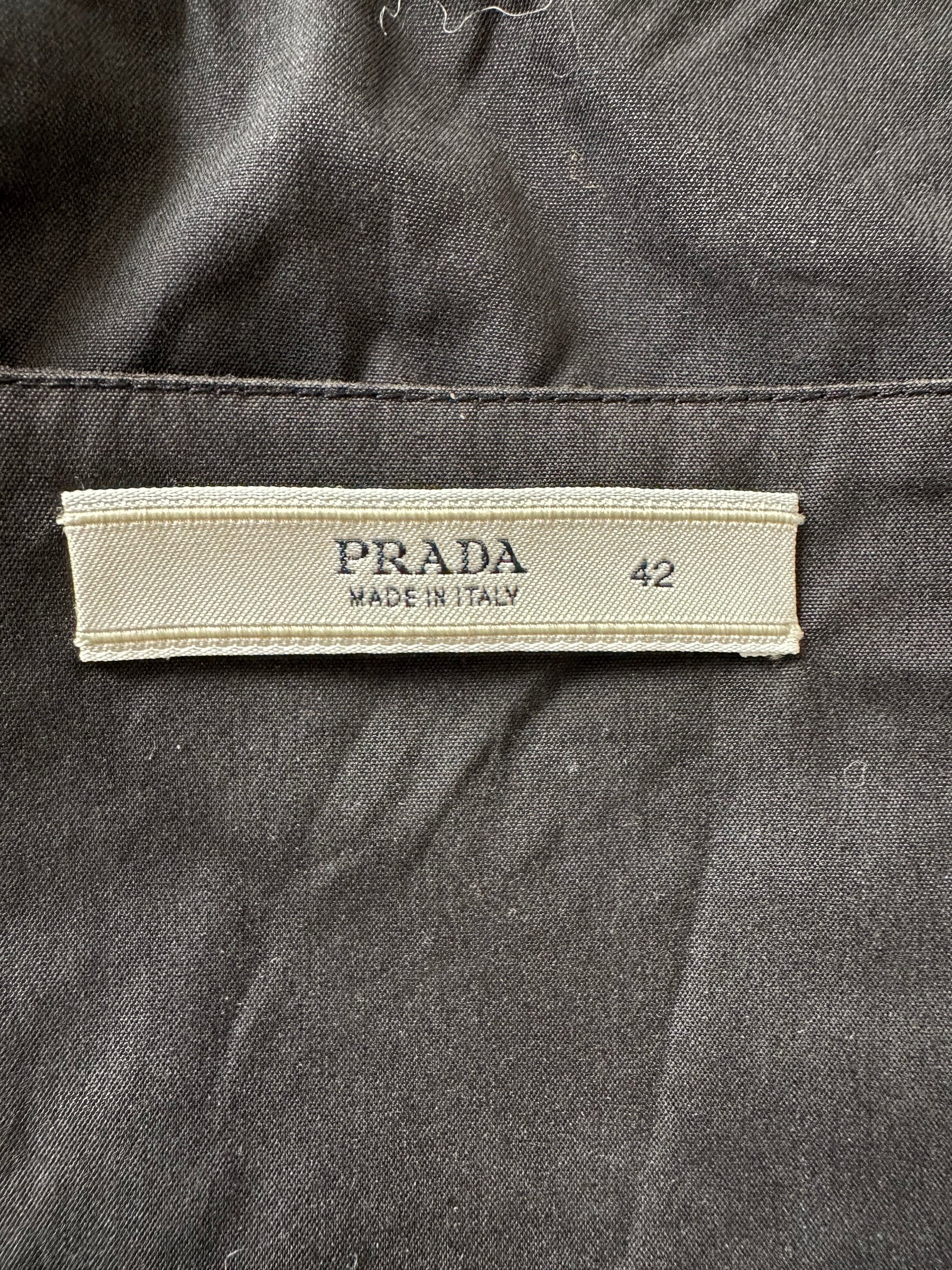 A gorgeous, Prada black blouse with a lovely square neckline. The size on the label is a 42 IT, but it fits a 40 IT more accurately. It has been pictured here on a size 40 IT, 5 7". In wonderful condition with no flaws.