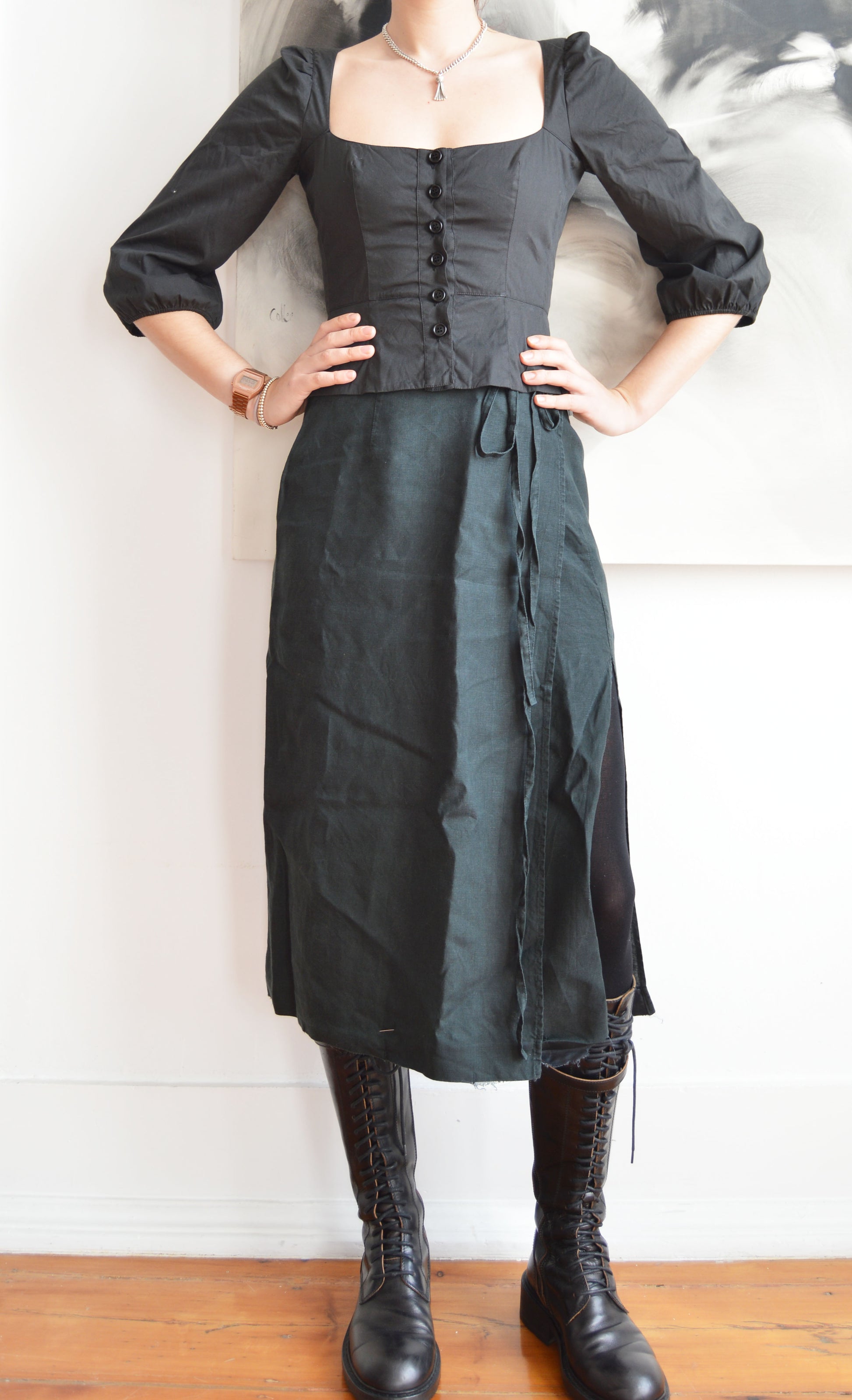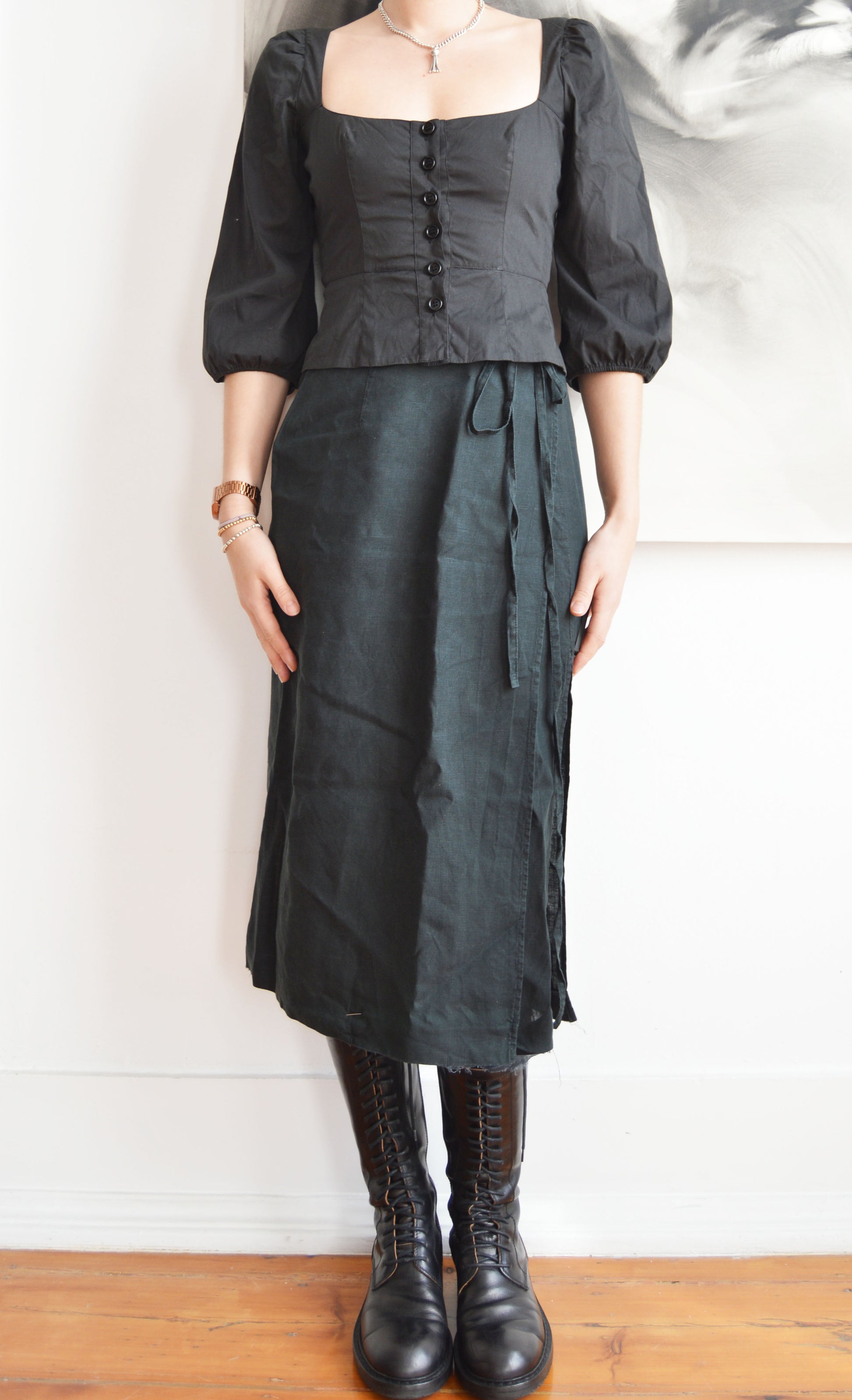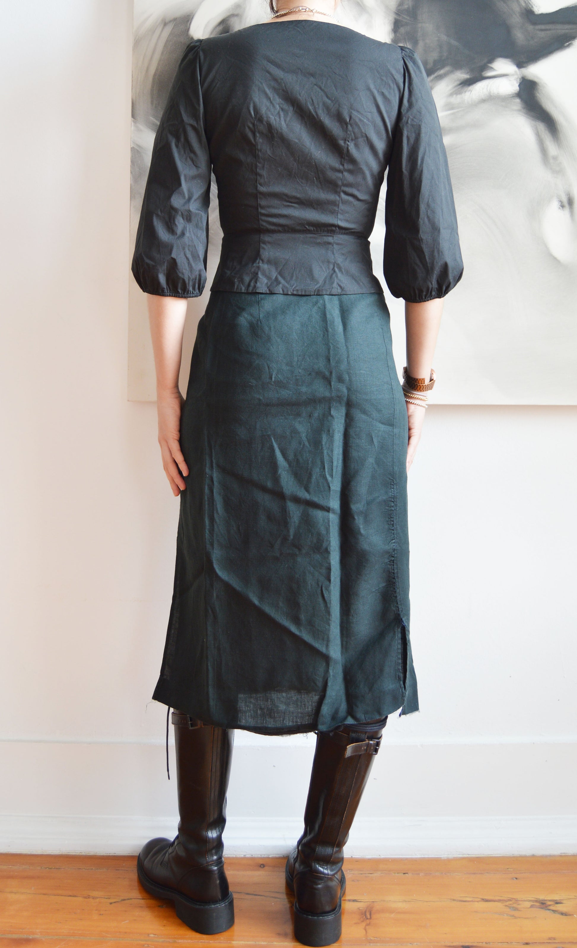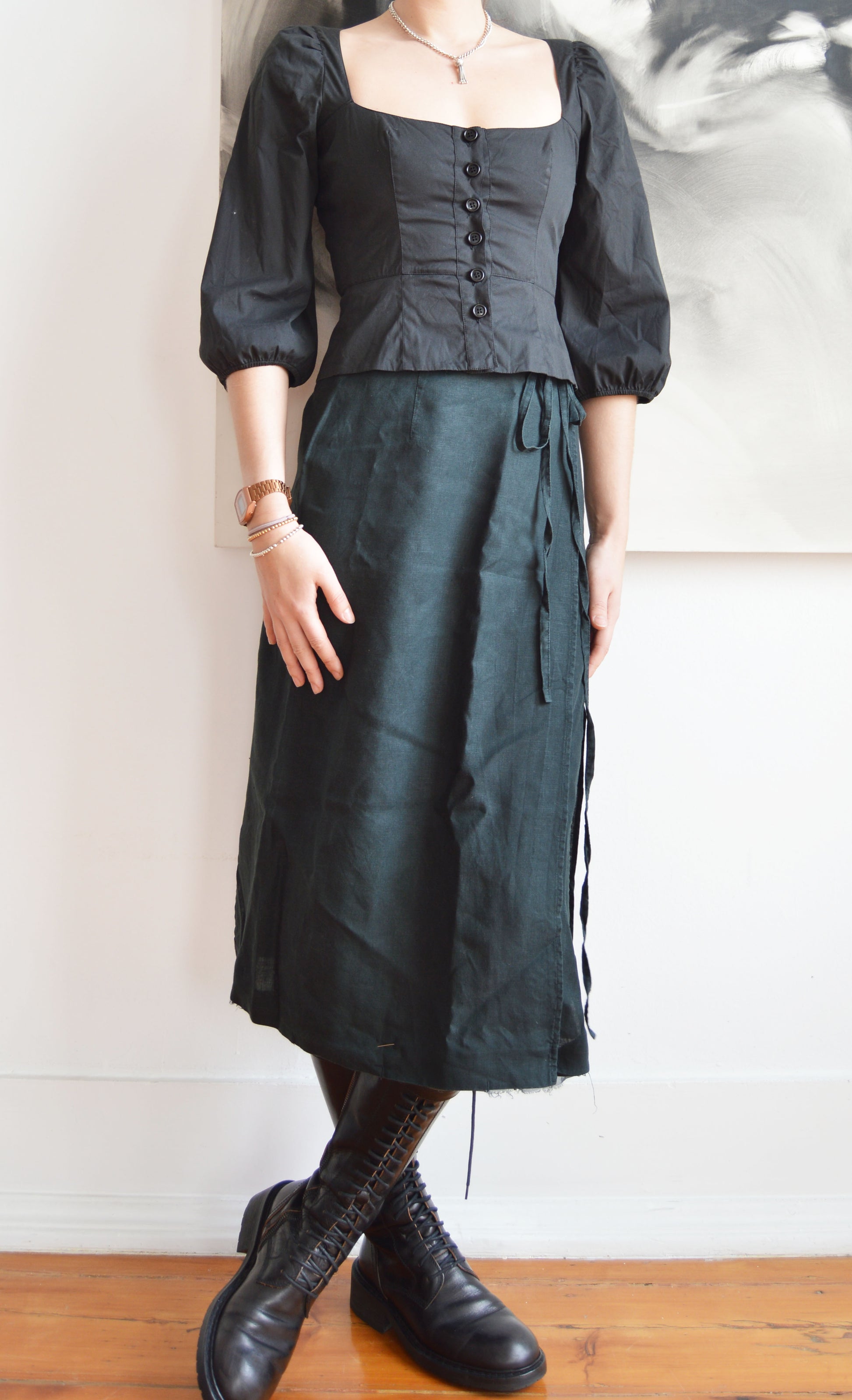 A gorgeous, Prada black blouse with a lovely square neckline. The size on the label is a 42 IT, but it fits a 40 IT more accurately. It has been pictured here on a size 40 IT, 5 7". In wonderful condition with no flaws.