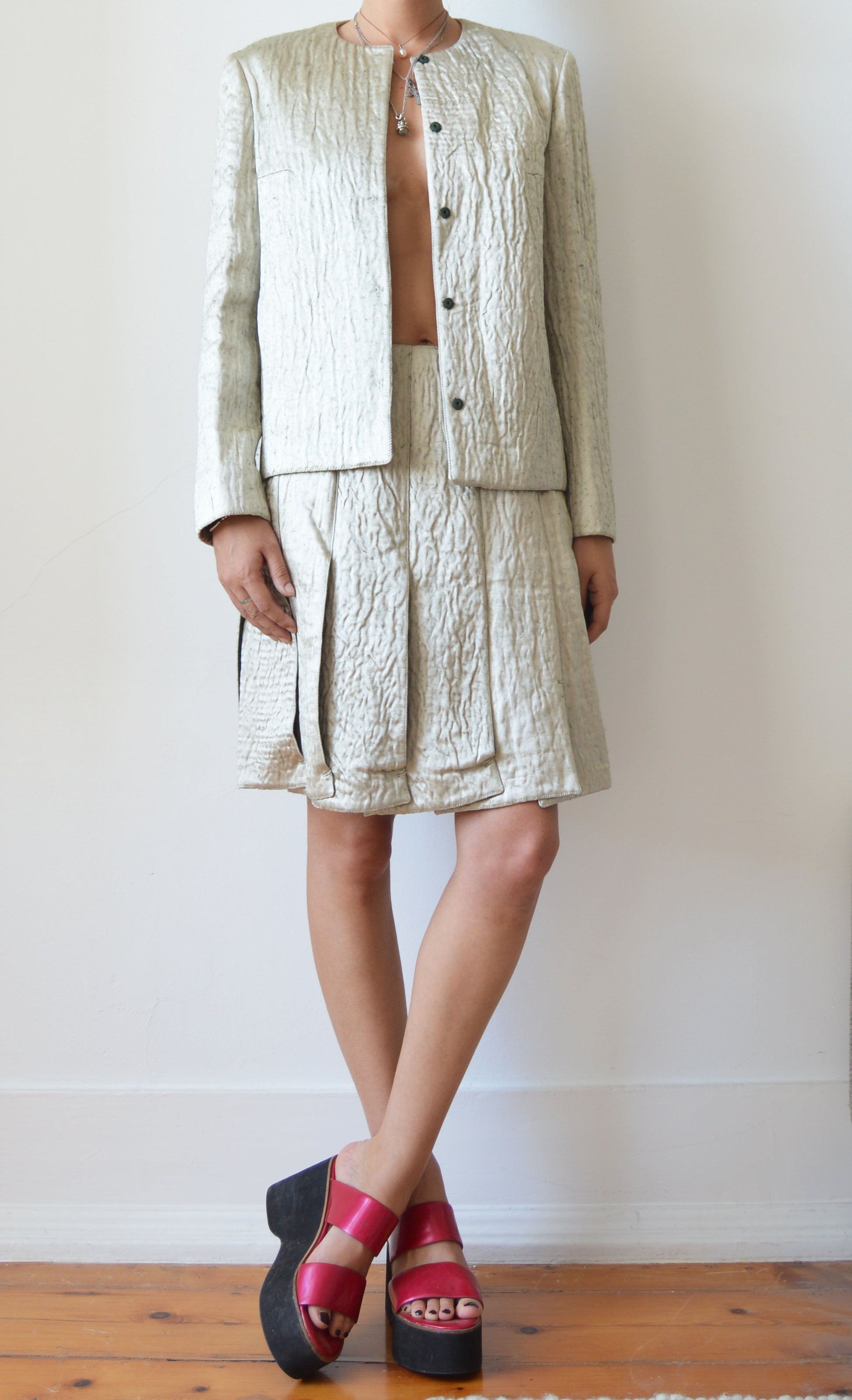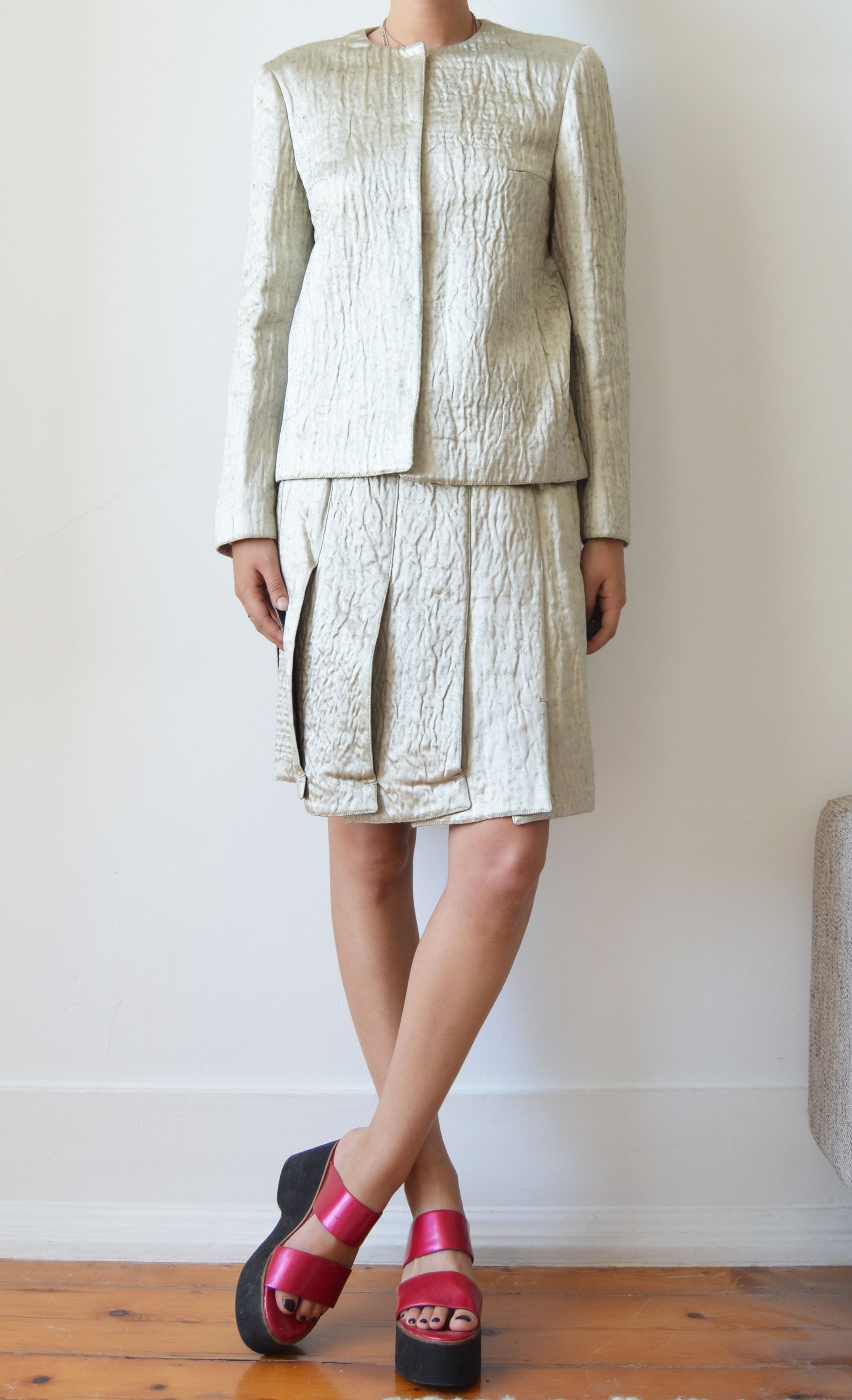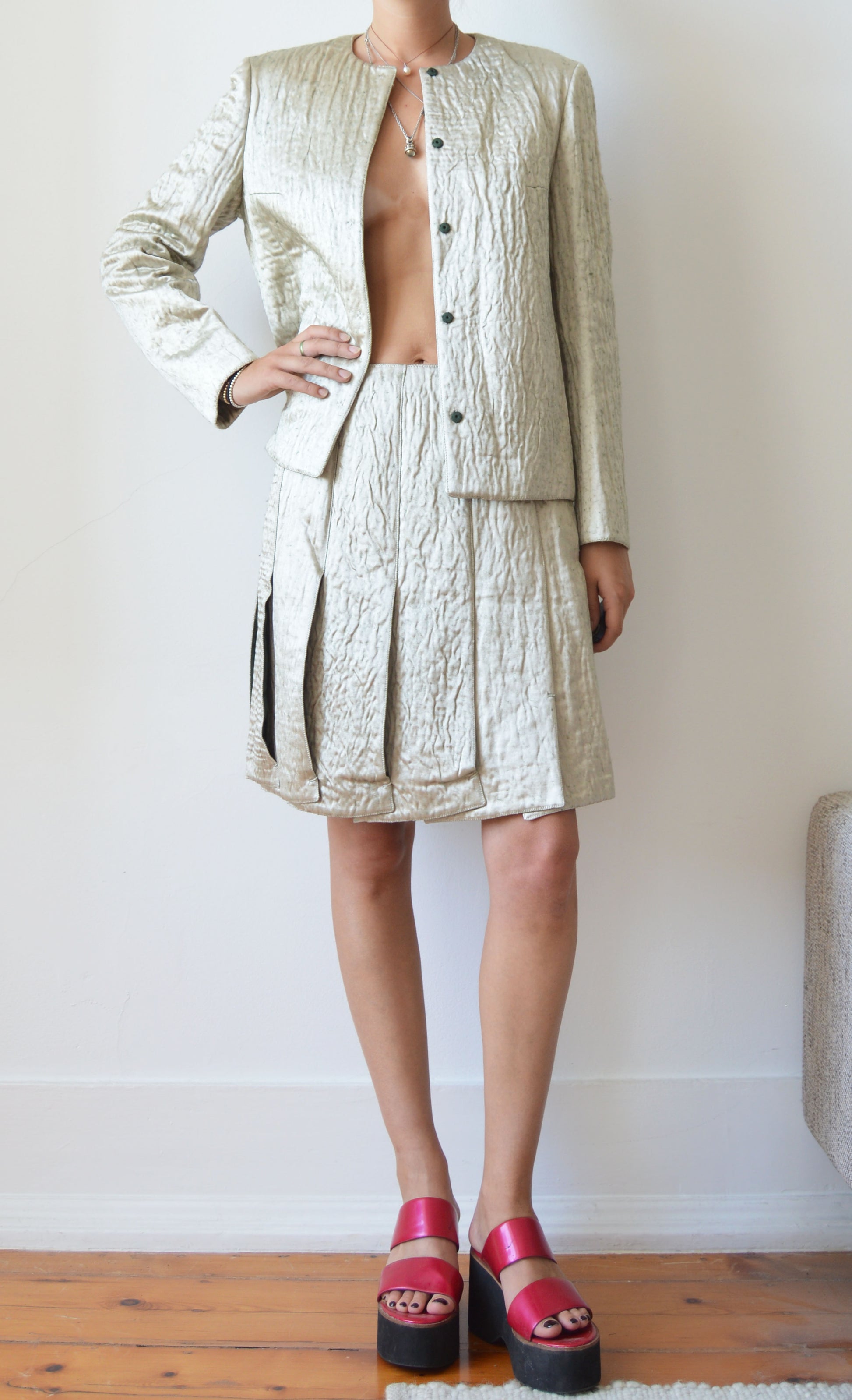 The most stunning Prada velvet suit from the F/W 1998 collection. The suit comprises of a jacket with a skirt. It is in great condition, with a label still on the jacket. There appears to be a little glue by one of the poppers, which is not noticeable at all and the Prada label on the jacket has lost one stitch, which can easily be remedied. It is a size 42 IT and has been pictured here on a 40 IT, 5 7". Please refer to the measurements below for more information.