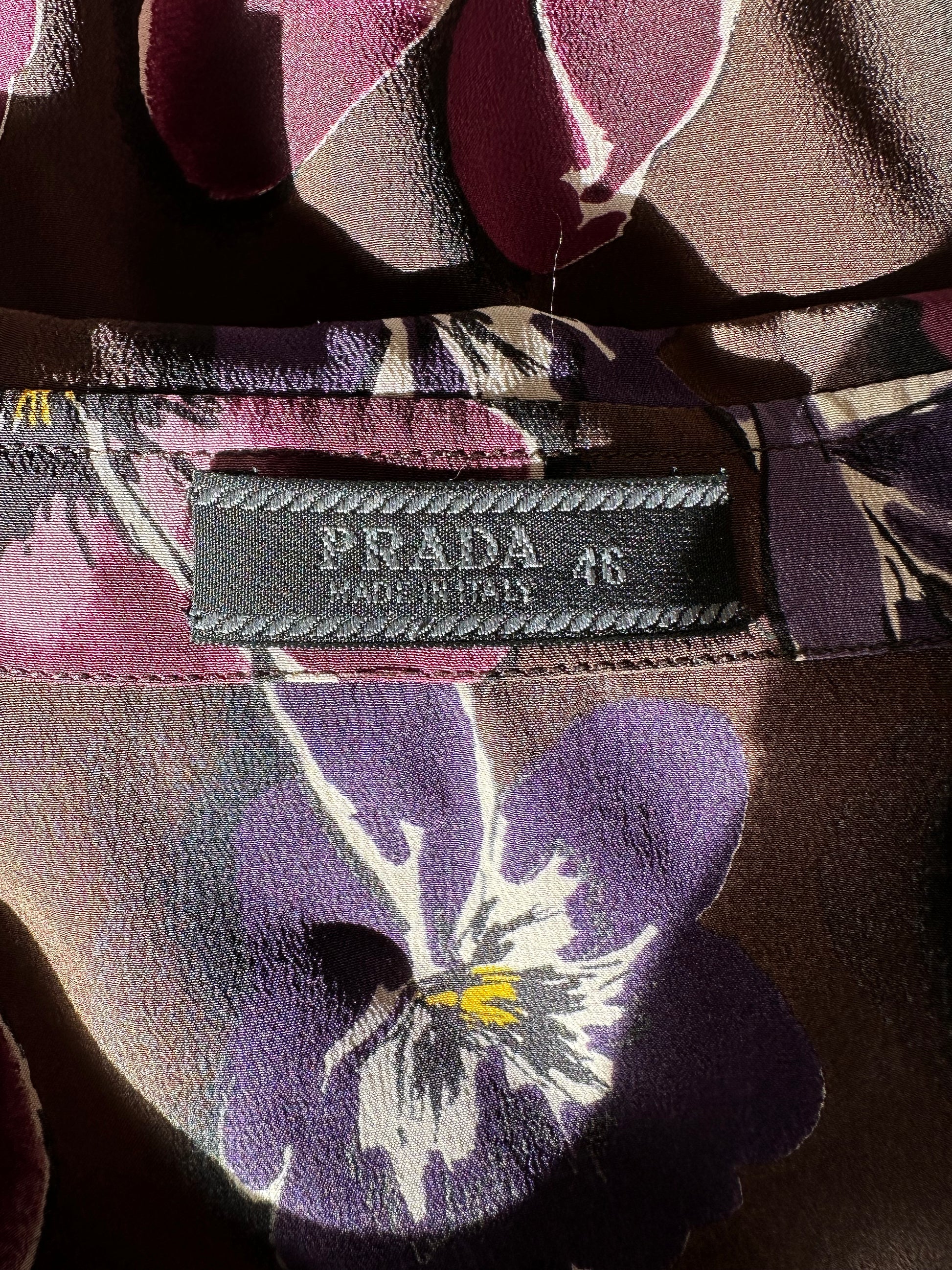 An absolutely, stunning Prada F/W 2000 silk shirt with a purple floral pattern. The size on the label is a 46 IT, which is completely inaccurate. The piece has been pictured here on a size 40 IT, 5 7" and fits well but please refer to the measurements below for more information. In perfect condition.