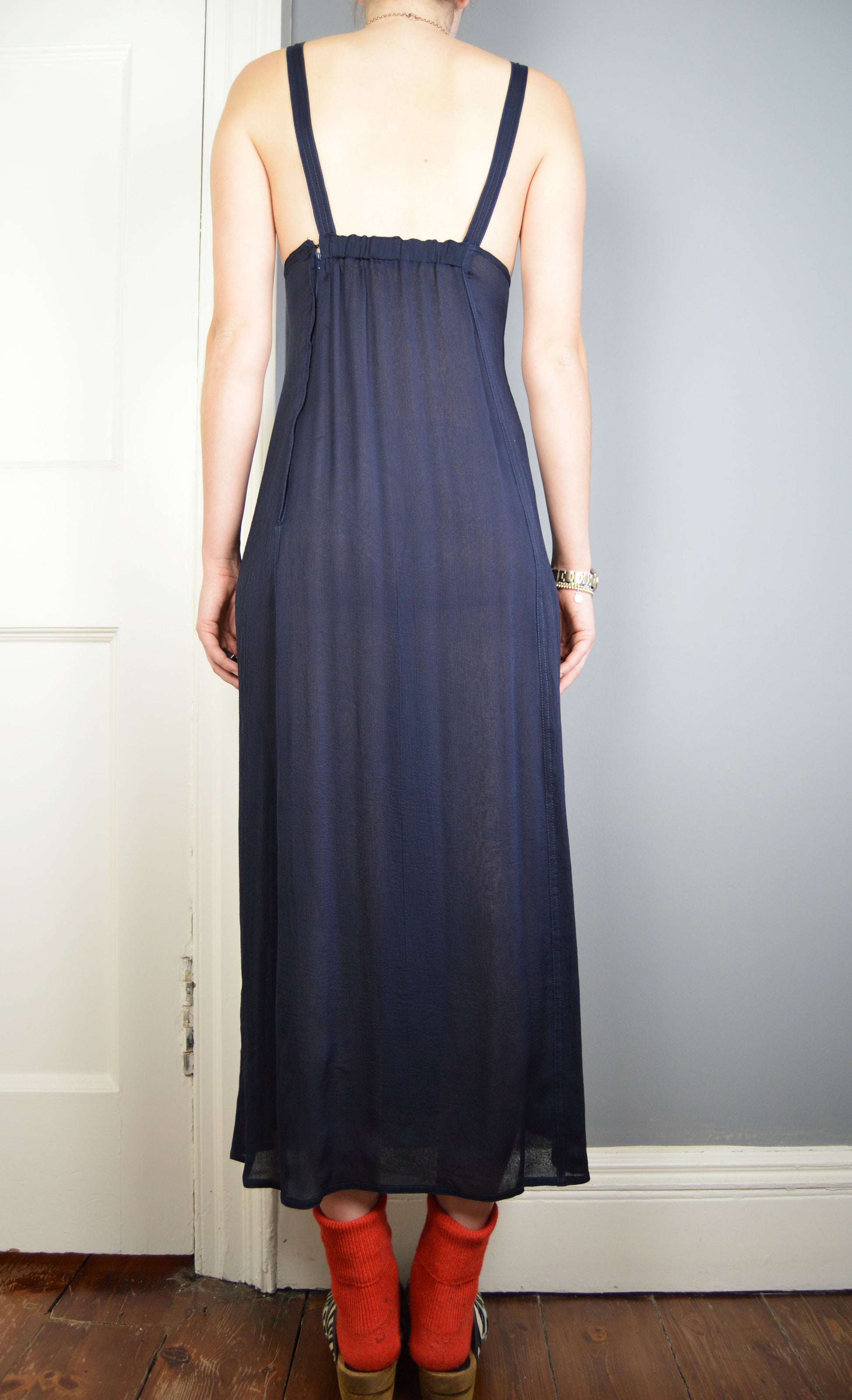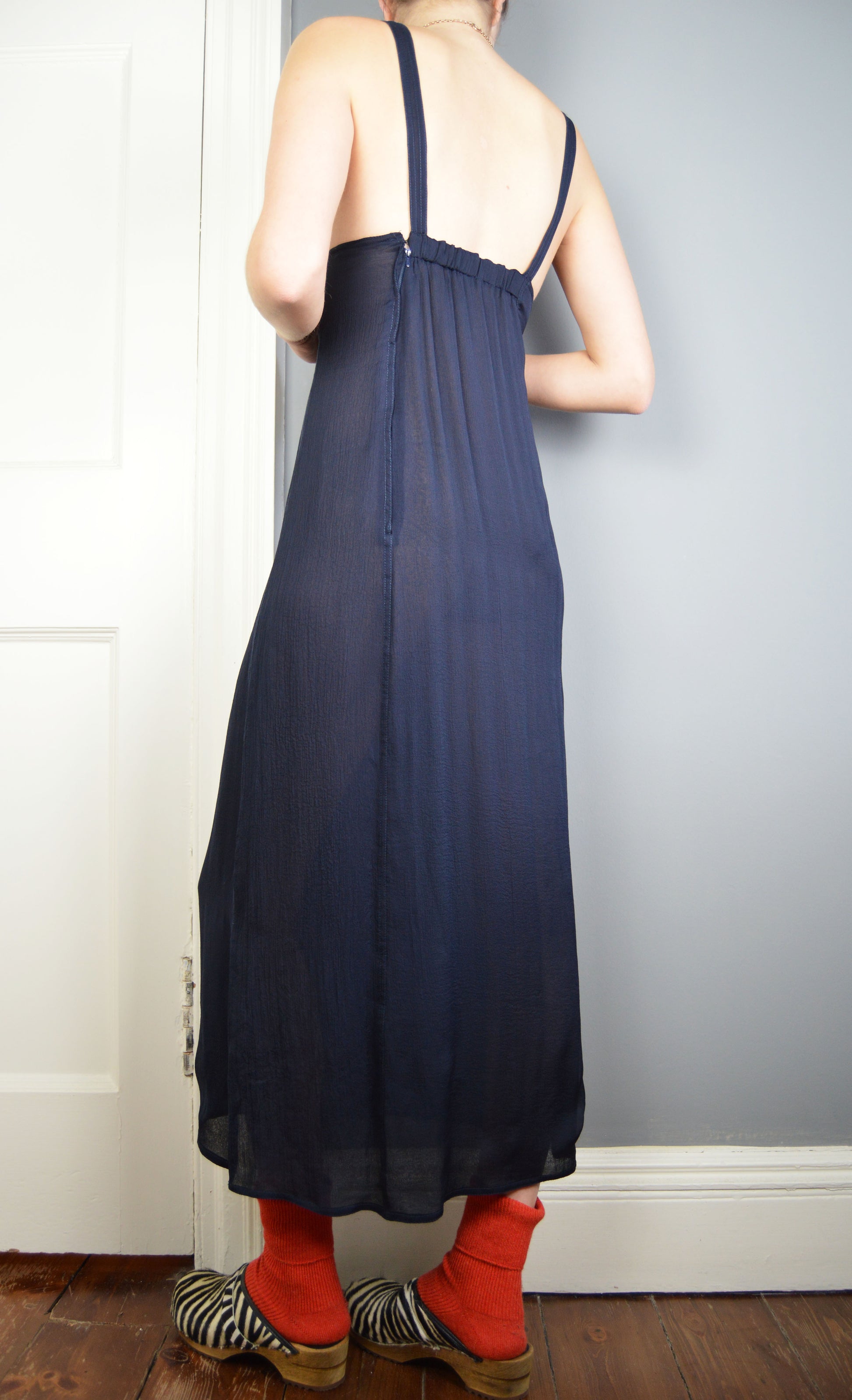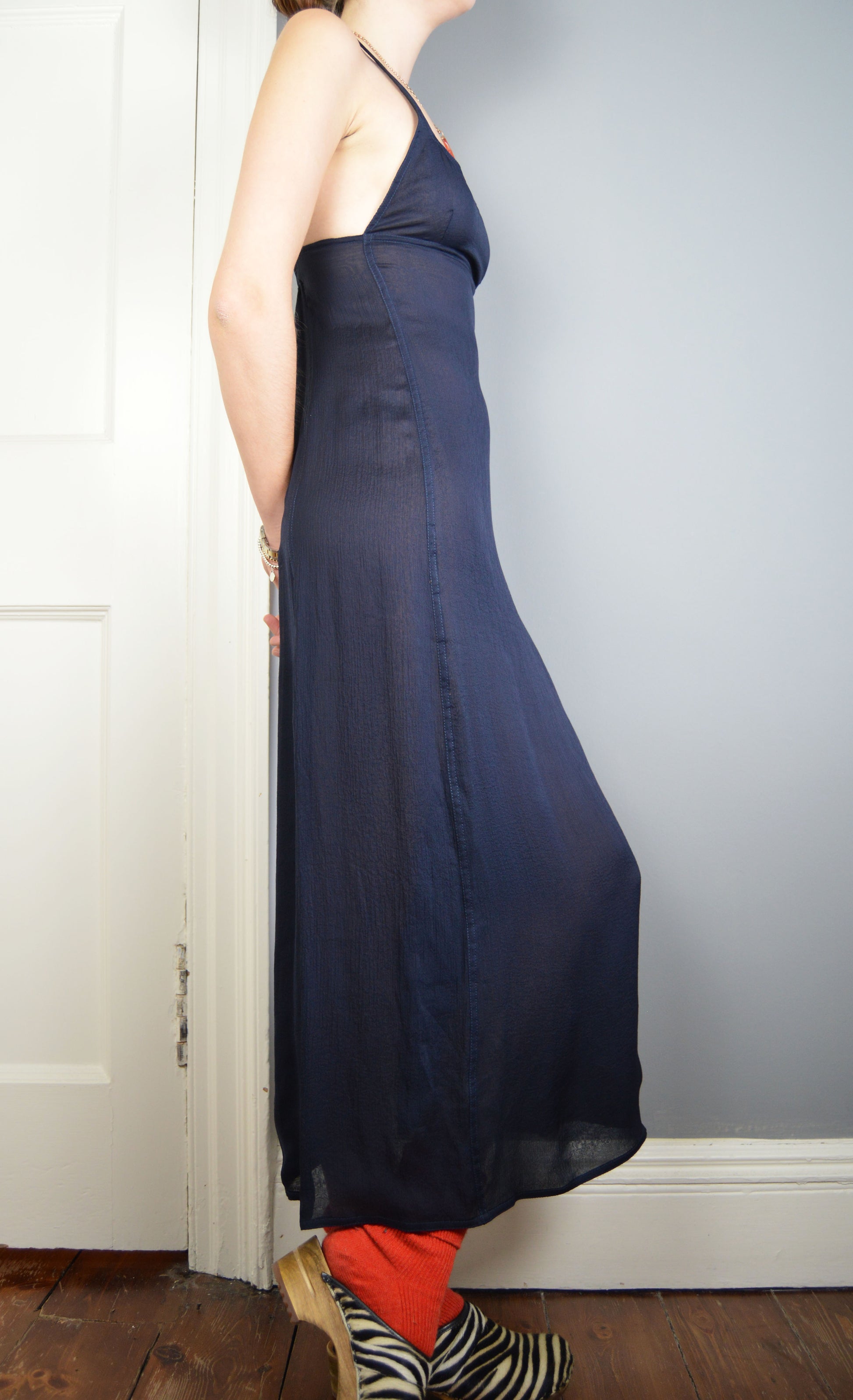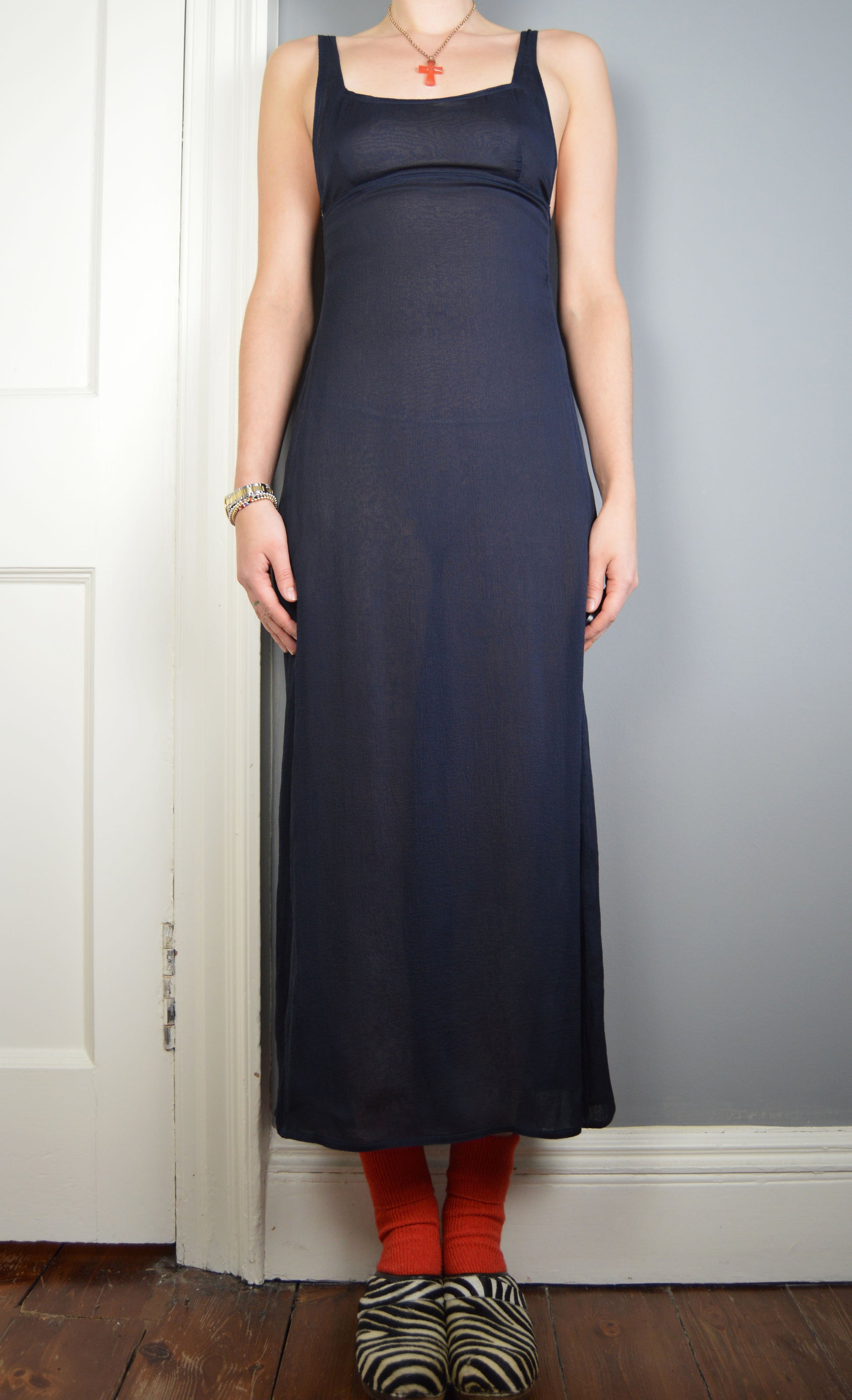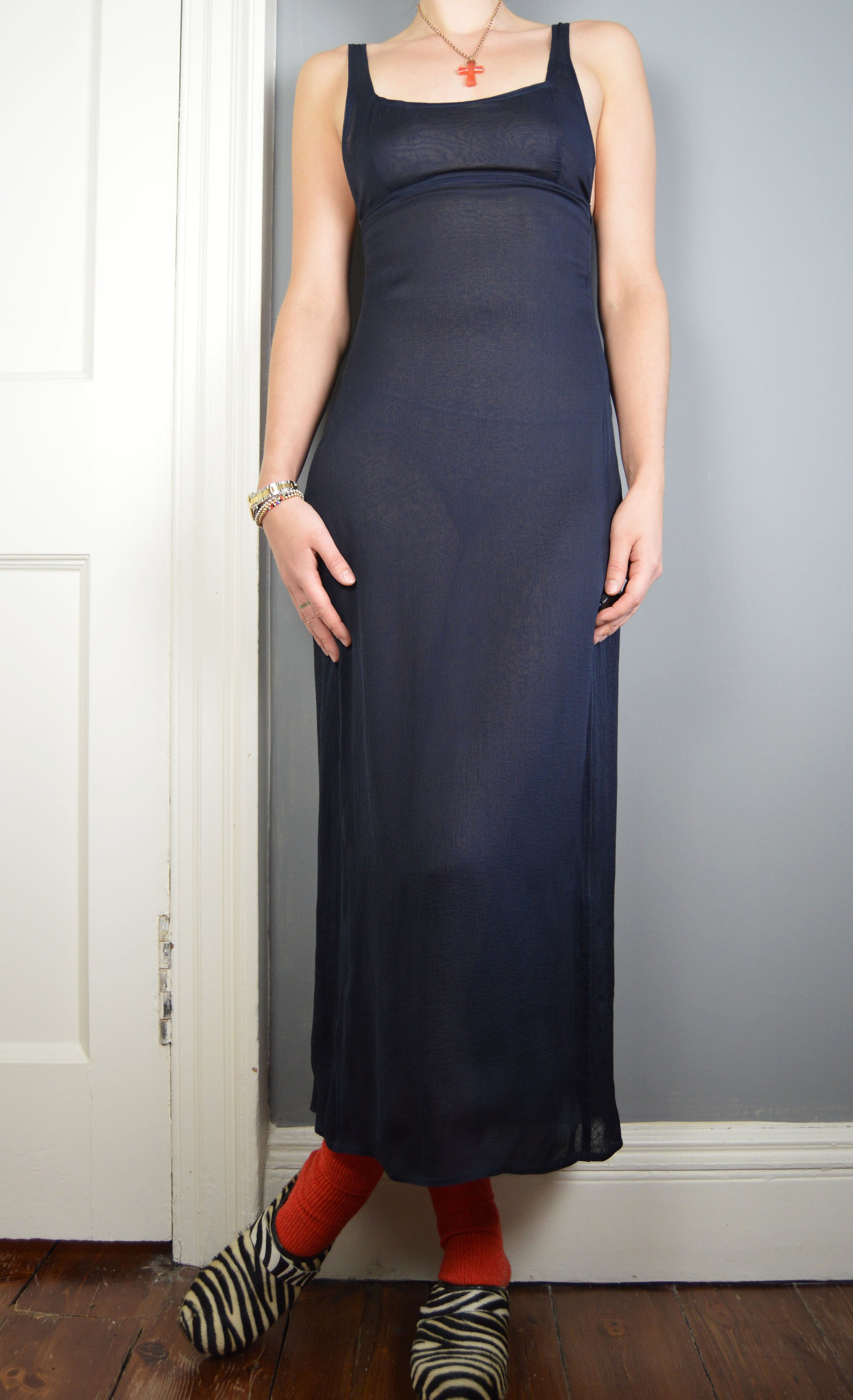An absolutely, stunning Prada silk dress from the S/S 1996 collection. Featuring an empire line cut and an exposed upper back, very simple and chic. Pictured here on a size 8 UK, 5 7", the size on label states that it is a 42 IT (10 UK) but I would say that it is better suited for a 6-8 UK, so please refer to the measurements below for more accuracy.