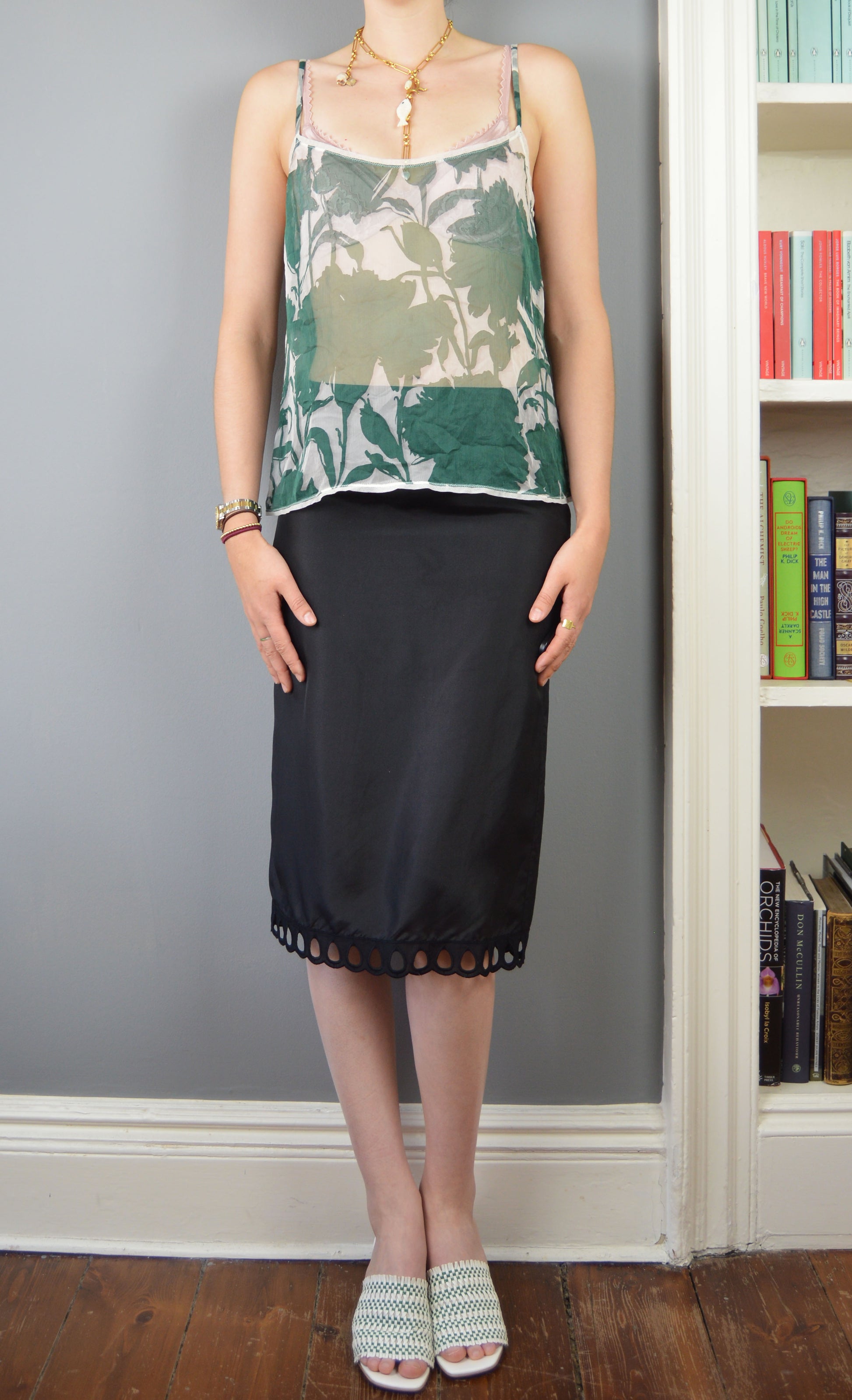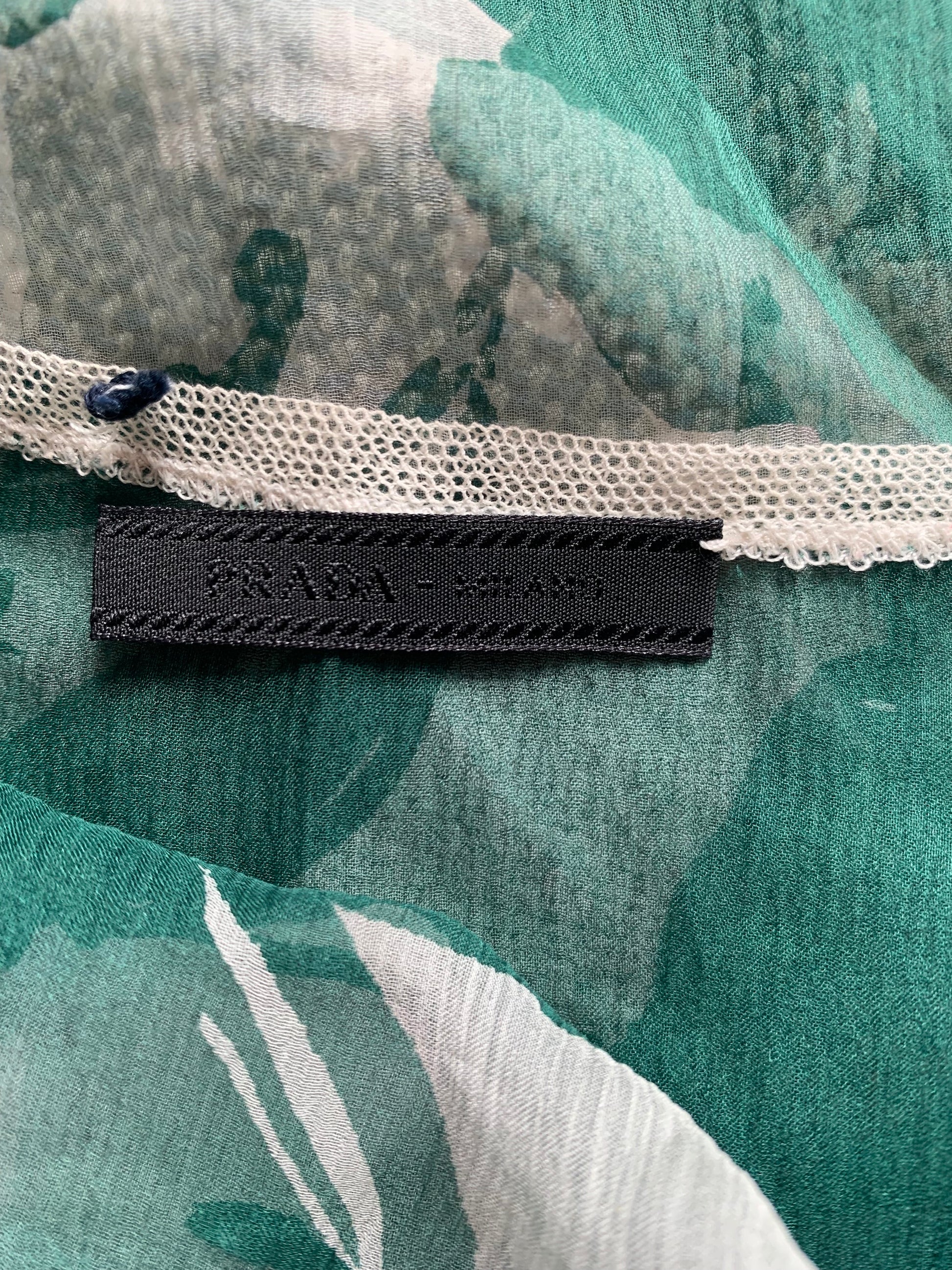 The size on the label is an 80 UK, which is a 36 bust and it has been pictured here on a size 6/8 UK, 5 7". The same print can be seen in the Prada S/S 2001 fashion show. The only flaw to the item is that the label has come off on one side, but a quick stitch would fix this.