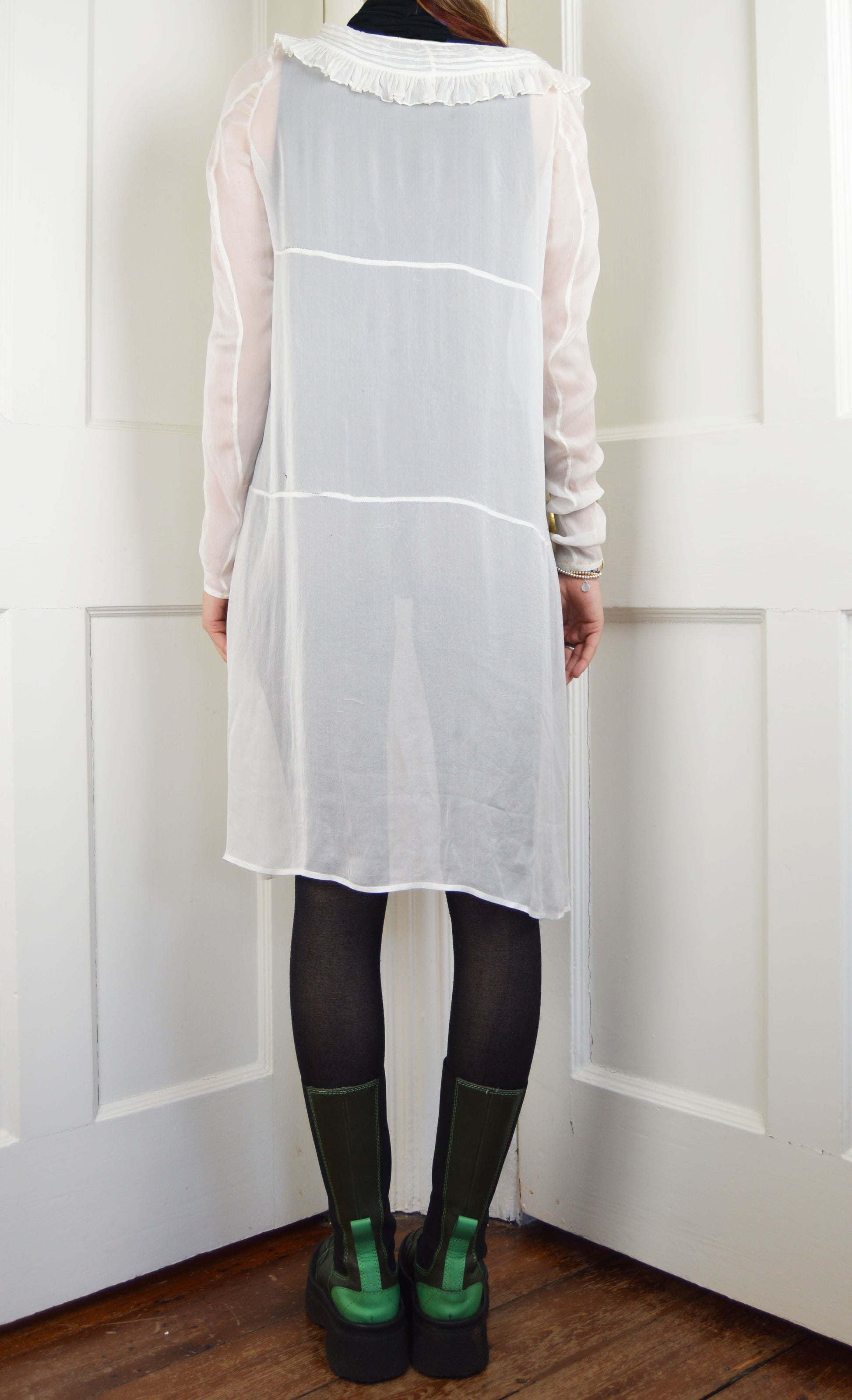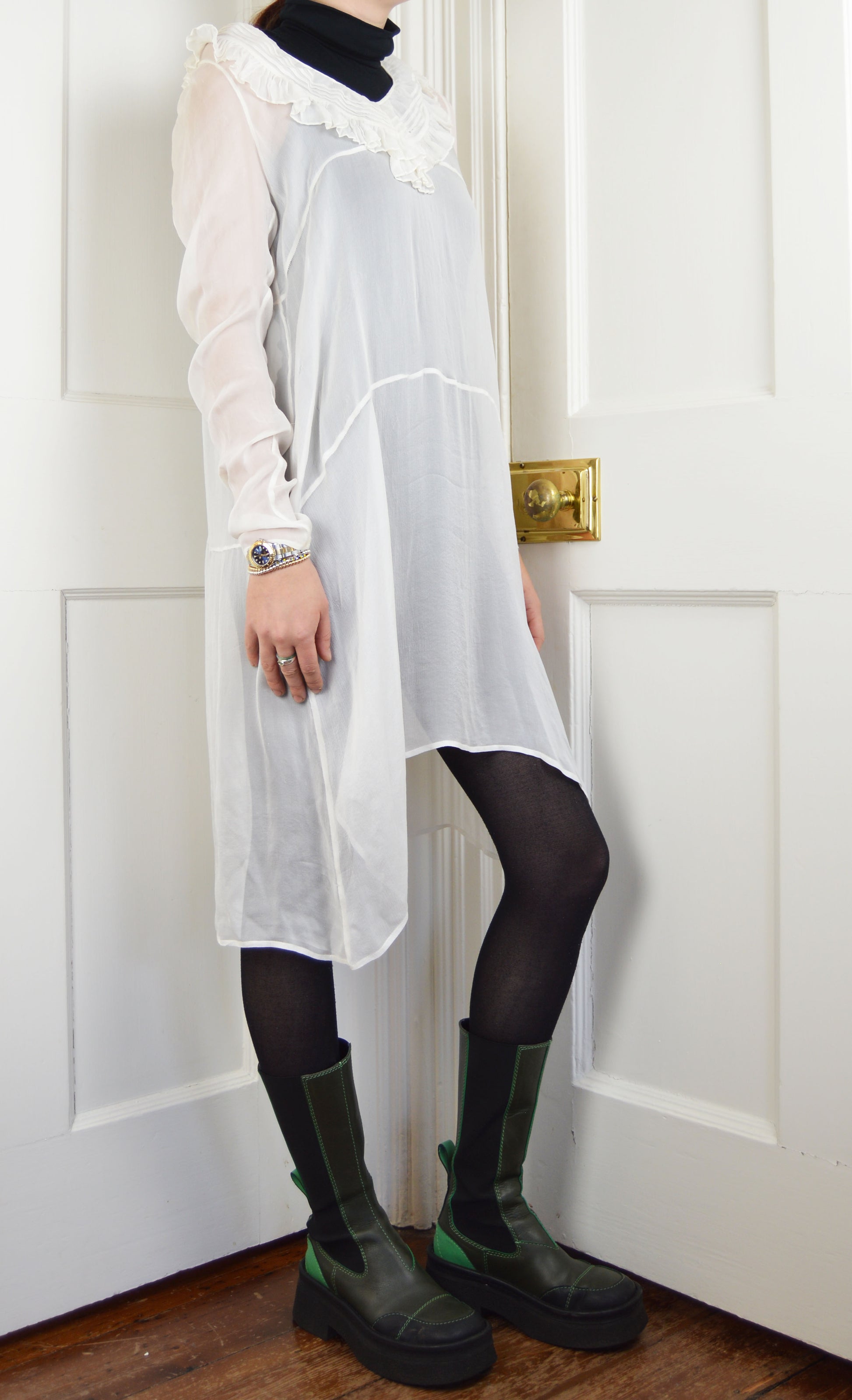 A gorgeous, vintage Prada white sheer dress with frilling at the collar. This piece is 100% silk and has lovely draping detail to it. The size on the label is a 42 IT, and it has been pictured here on a size 6/8 UK, 5 7". It fits this size well due to the arms being quite tight. This piece is definitely from the early 1990s, but I am not sure of the specific collection. There are various minute holes (please refer to pictures) but they are not particularly noticeable when wearing. If you would like more detail regarding these, just send me a message.